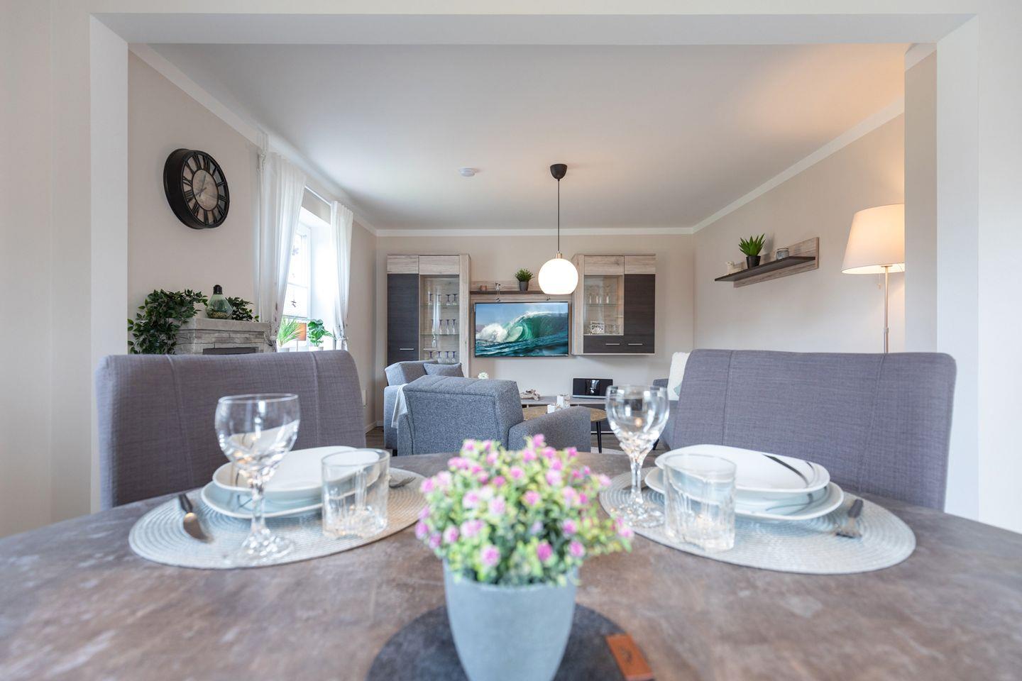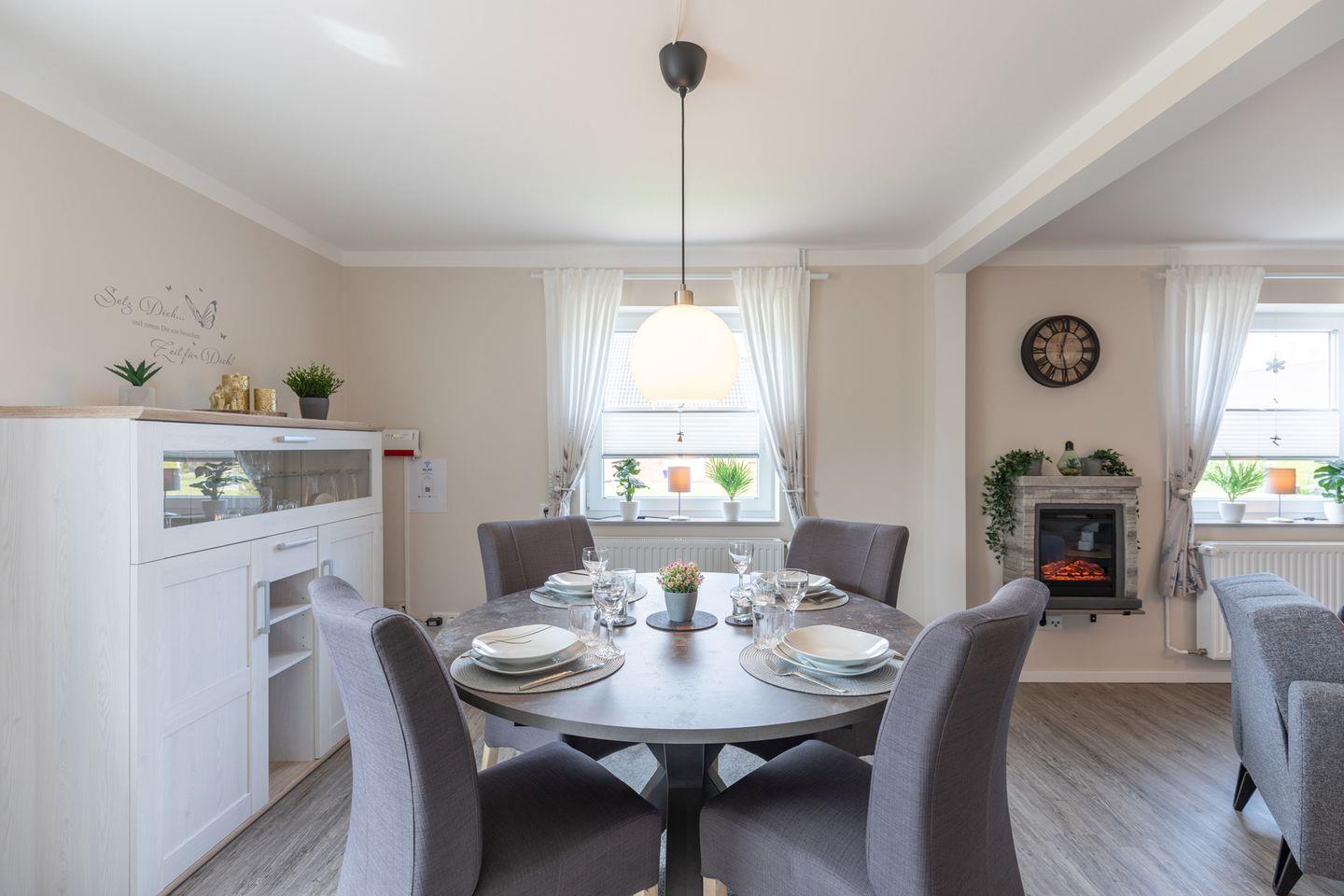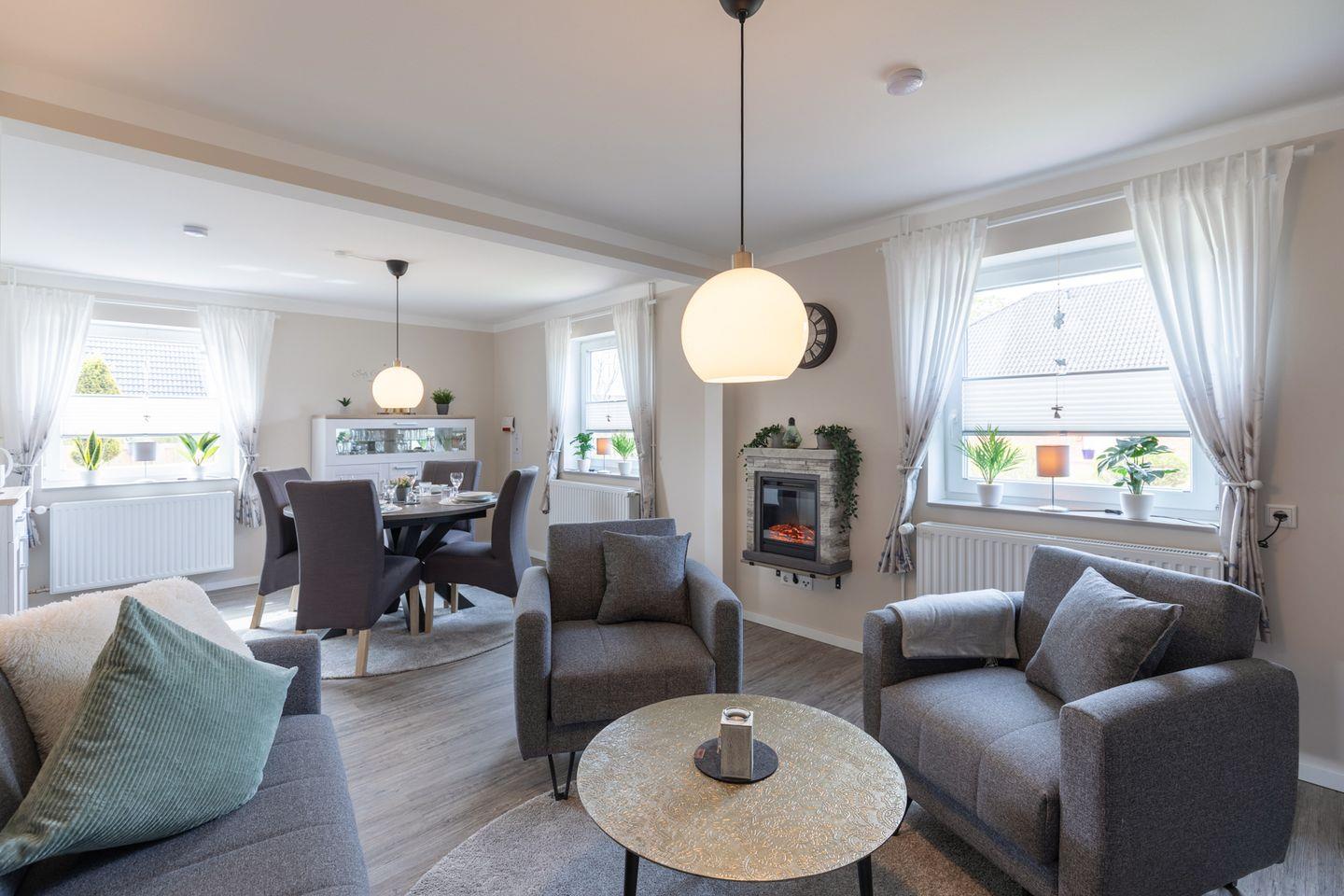 Das ca. 105 qm große Ferienhaus beeindruckt durch seinen hellen, großzügigen und modernen Charme. Das große, lichtdurchflutete Wohnzimmer mit Essbereich lädt zu gemütlichen Stunden in geselliger Runde ein. Hier können Sie Ihren Urlaubstag mit der Familie entspannt ausklingen lassen. Neben dem Sitzbereich und einem Flachbild-TV sorgt hier ein elektrischer Kamin für gemütliche Stunden auch in der kälteren Jahreszeit.