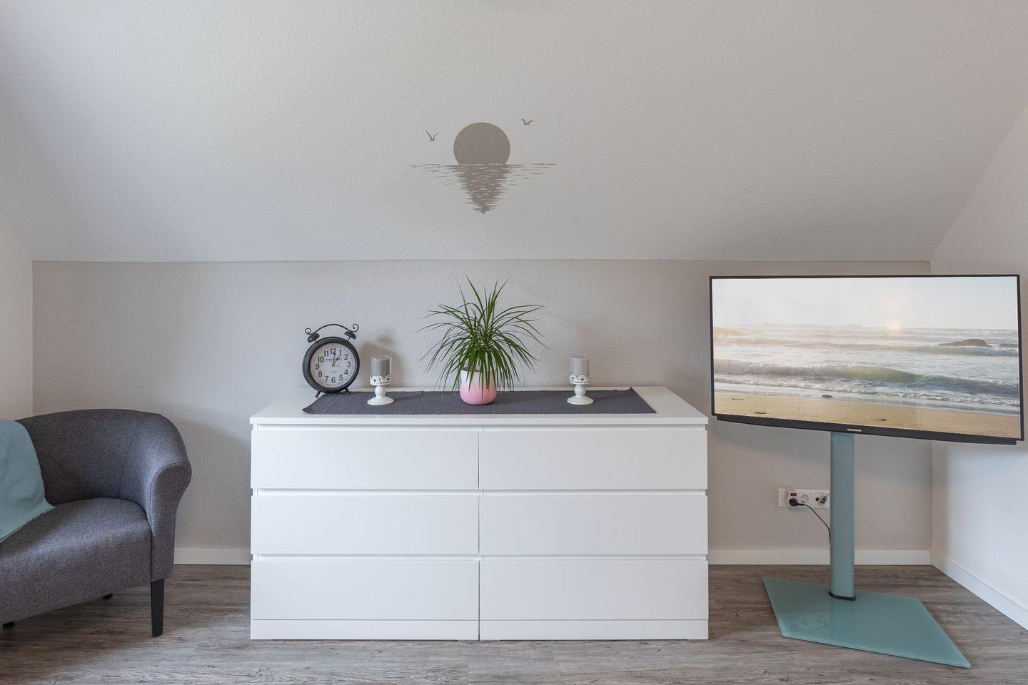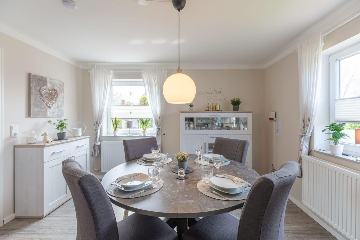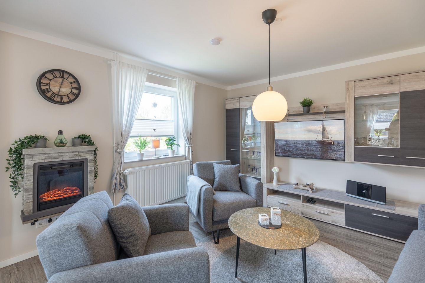 Das ca. 105 qm große Ferienhaus beeindruckt durch seinen hellen, großzügigen und modernen Charme. Das große, lichtdurchflutete Wohnzimmer mit Essbereich lädt zu gemütlichen Stunden in geselliger Runde ein. Hier können Sie Ihren Urlaubstag mit der Familie entspannt ausklingen lassen. Neben dem Sitzbereich und einem Flachbild-TV sorgt hier ein elektrischer Kamin für gemütliche Stunden auch in der kälteren Jahreszeit.