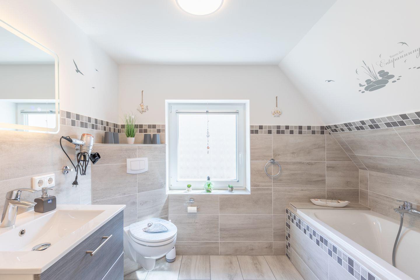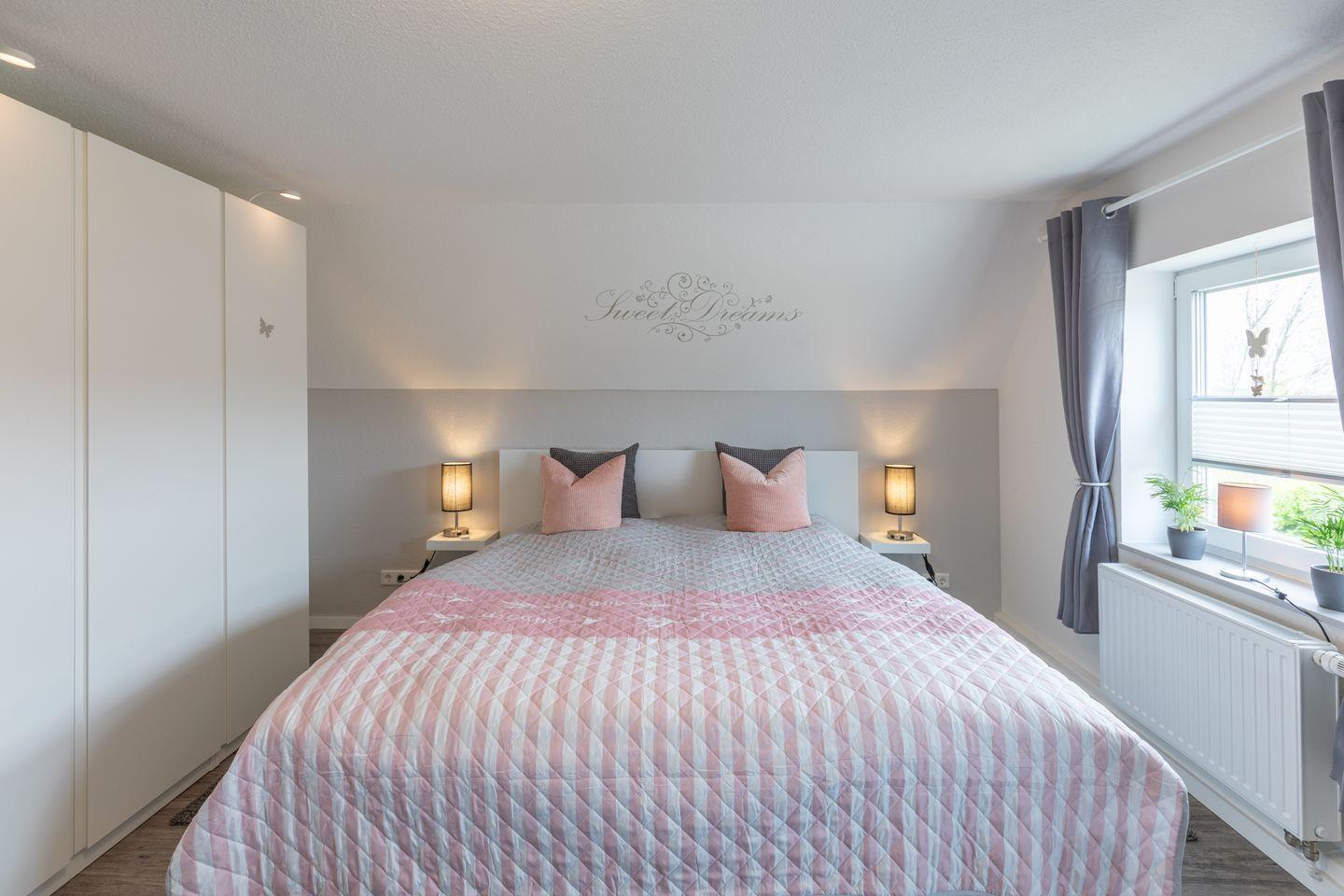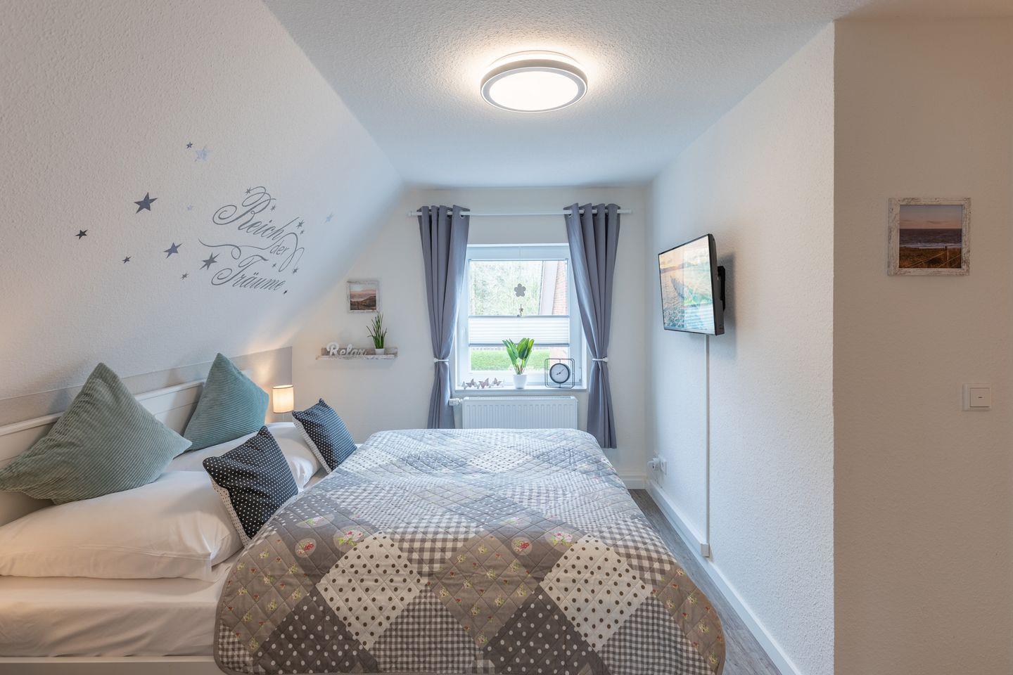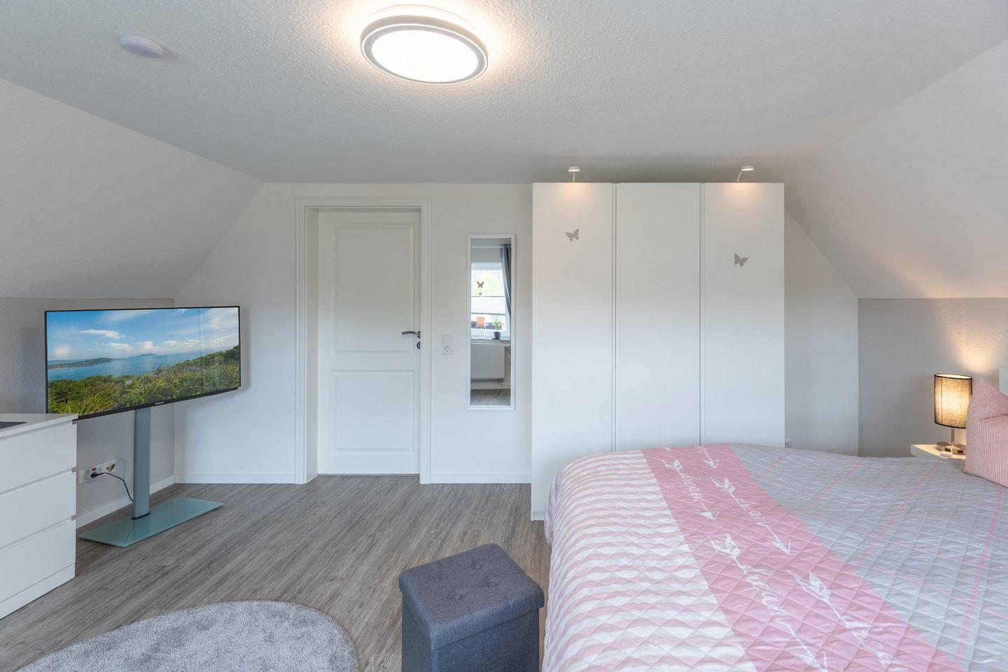 Über eine Treppe erreichen Sie die beiden gemütlichen Schlafzimmer im ersten Stock. Im ersten Schlafzimmer steht Ihnen ein komfortables Doppelbett (180 × 200) zur Verfügung. Das zweite Schlafzimmer ist mit einem Doppelbett (160 × 200) ausgestattet und verfügt über ein eigenes Bad mit Waschbecken, WC und Badewanne. Beide Schlafzimmer sind mit einem Flachbildfernseher ausgestattet.