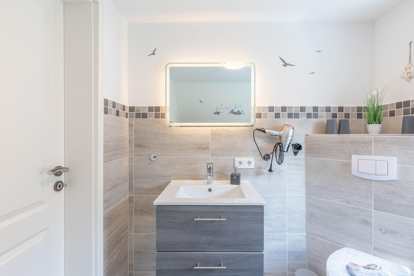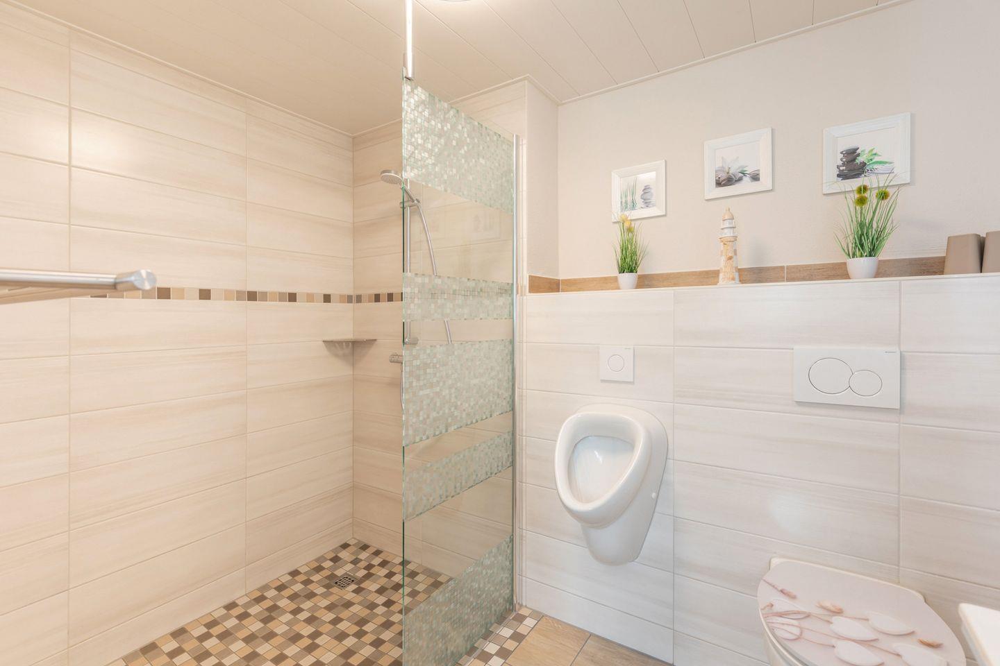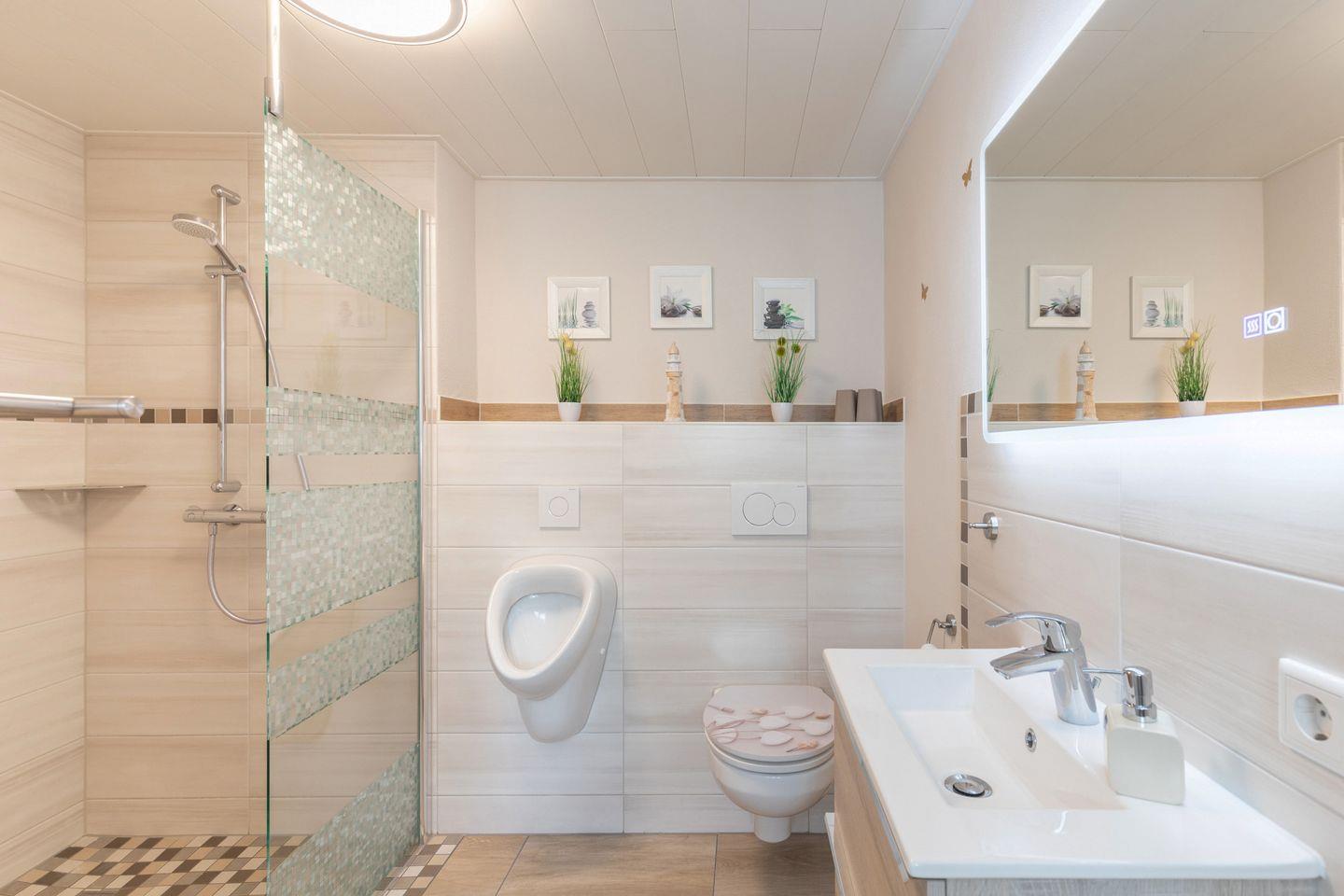 Das moderne Badezimmer im Erdgeschoss mit Waschbecken, ebenerdiger Dusche, einem separaten beleuchteten Kosmetikschrank, der mit der Funktion einer 5-fachen Vergrößerung ausgestattet ist, WC und Urinal runden das Bild ab. In der separaten Waschküche im Erdgeschoss stehen eine Waschmaschine und ein Trockner zur kostenlosen Nutzung zur Verfügung.