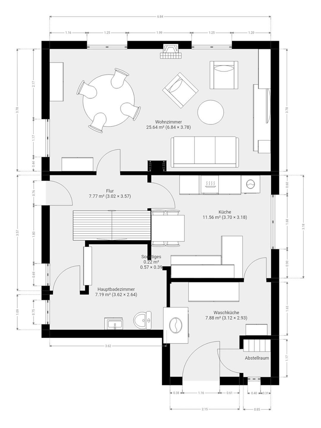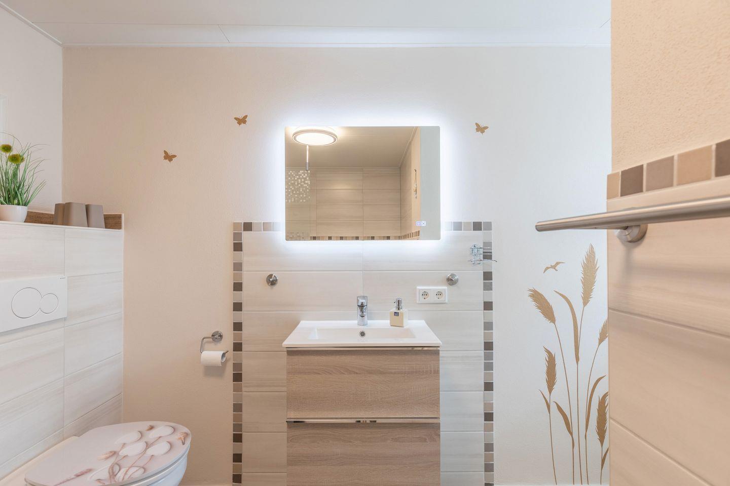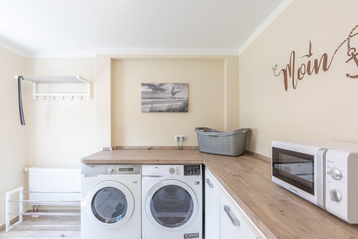 Das moderne Badezimmer im Erdgeschoss mit Waschbecken, ebenerdiger Dusche, einem separaten beleuchteten Kosmetikschrank, der mit der Funktion einer 5-fachen Vergrößerung ausgestattet ist, WC und Urinal runden das Bild ab. In der separaten Waschküche im Erdgeschoss stehen eine Waschmaschine und ein Trockner zur kostenlosen Nutzung zur Verfügung.