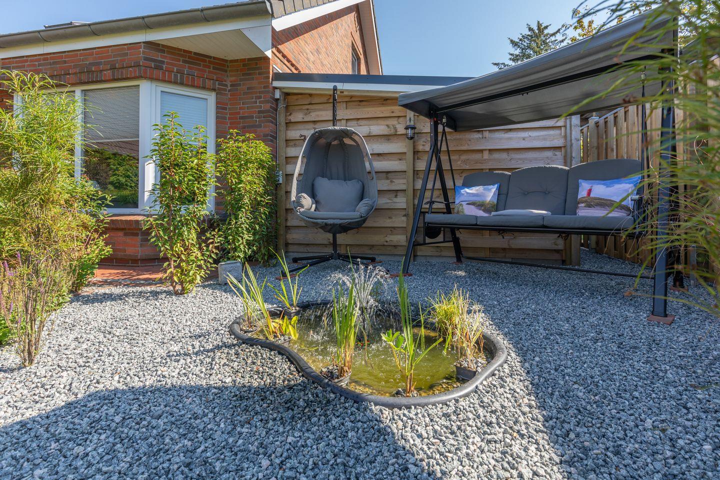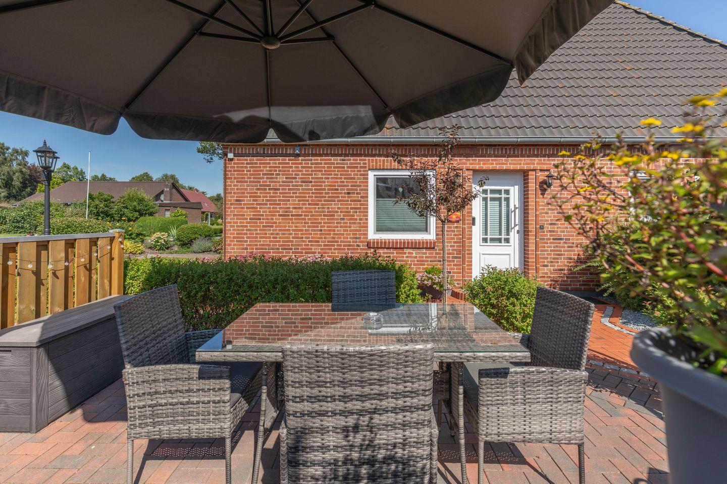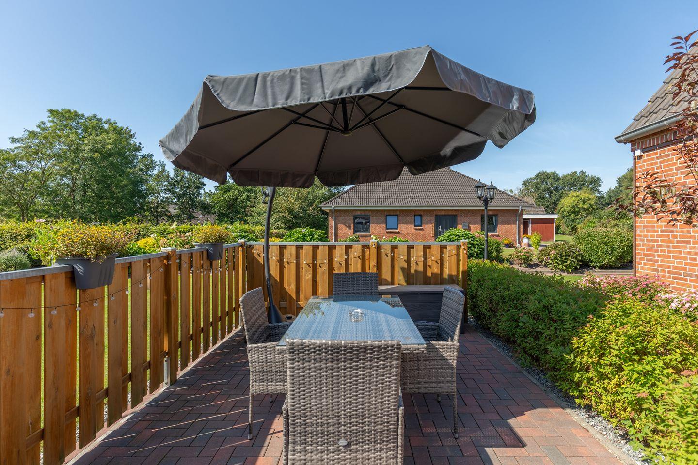 Auf der idyllischen Terrasse mit Strandkorb und Sitzbereich mit Sonnenschirm können Sie Ihren Urlaubstag mit Ihren Lieben entspannt ausklingen lassen.