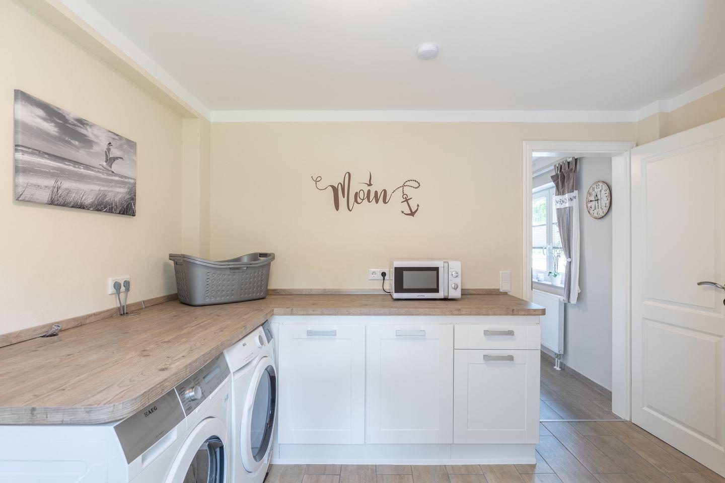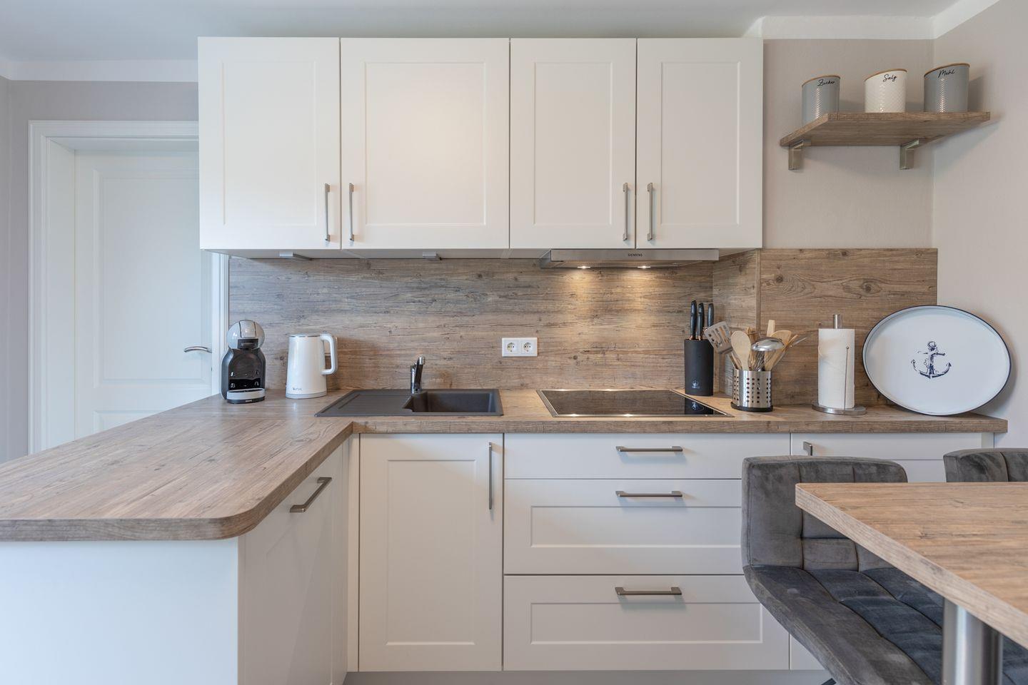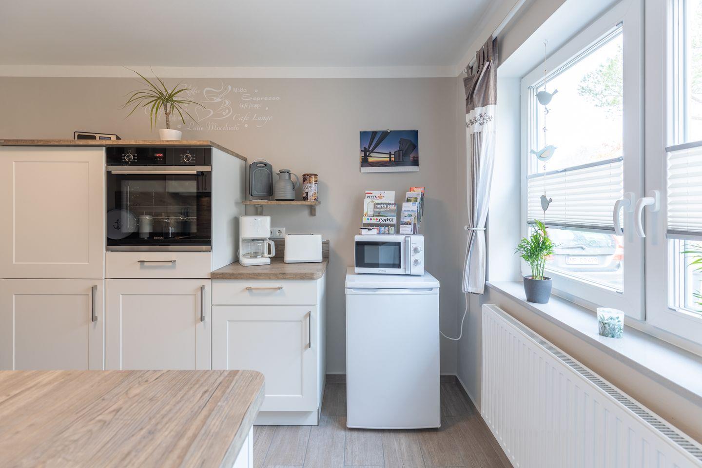 In der geschlossenen, bestens ausgestatteten Küche steht Ihnen neben einem weiteren Essbereich ein Herd mit Dunstabzugshaube, eine Spülmaschine, ein großer Kühlschrank, ein Backofen, eine Mikrowelle, eine Filterkaffeemaschine, ein Wasserkocher, eine Nespresso Maschine und Toaster sowie ein Internetradio zur Verfügung.