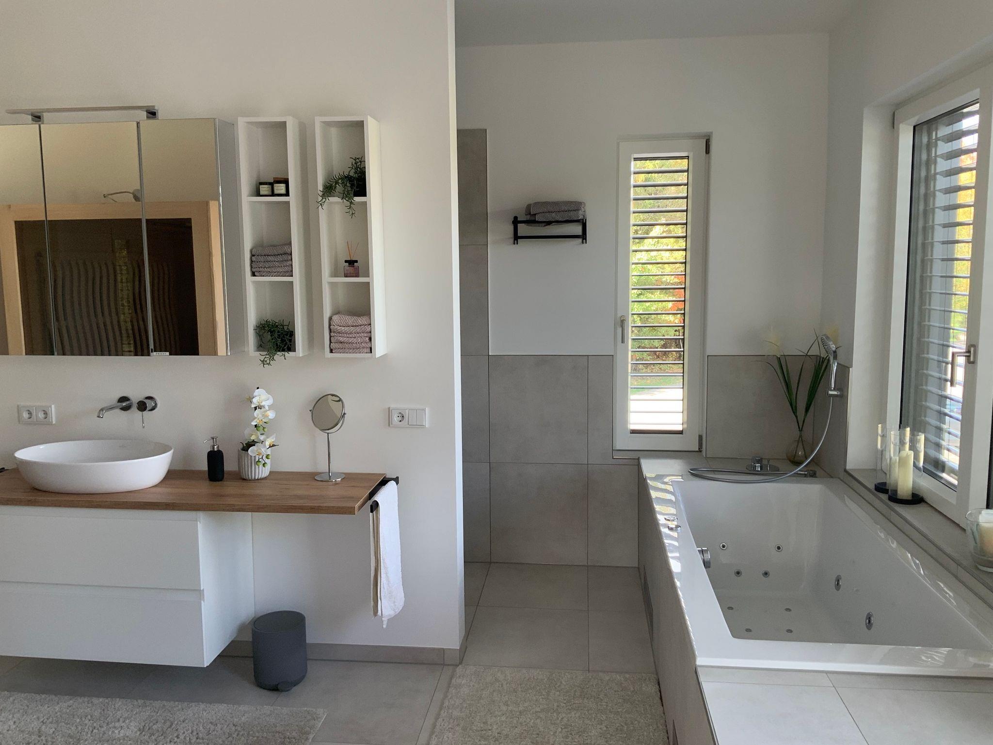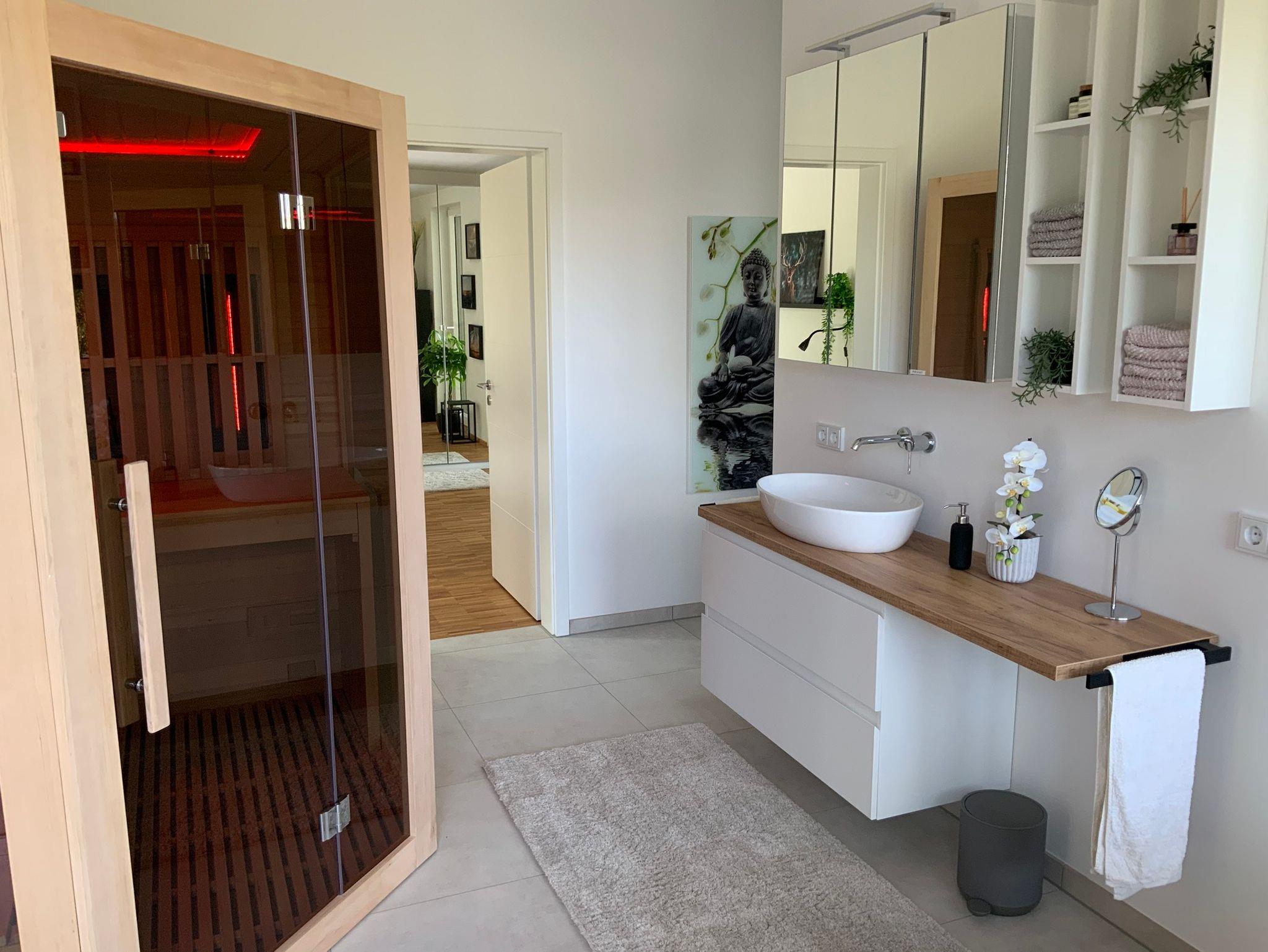 Hochwertige Ausstattung mit Whirlpool- Badewanne für eine oder zwei Personen, große Infrarot Sauna, geräumige, ebenerdige