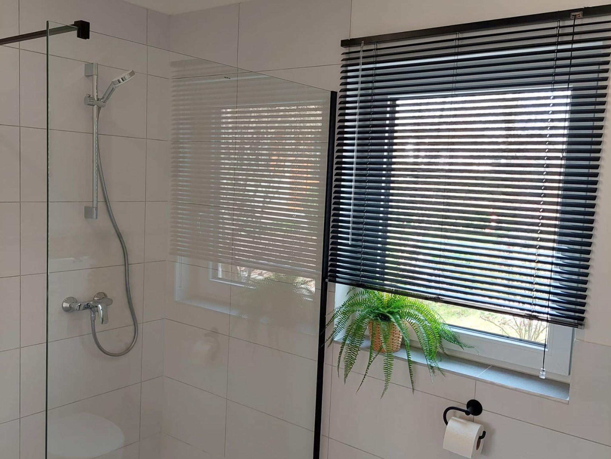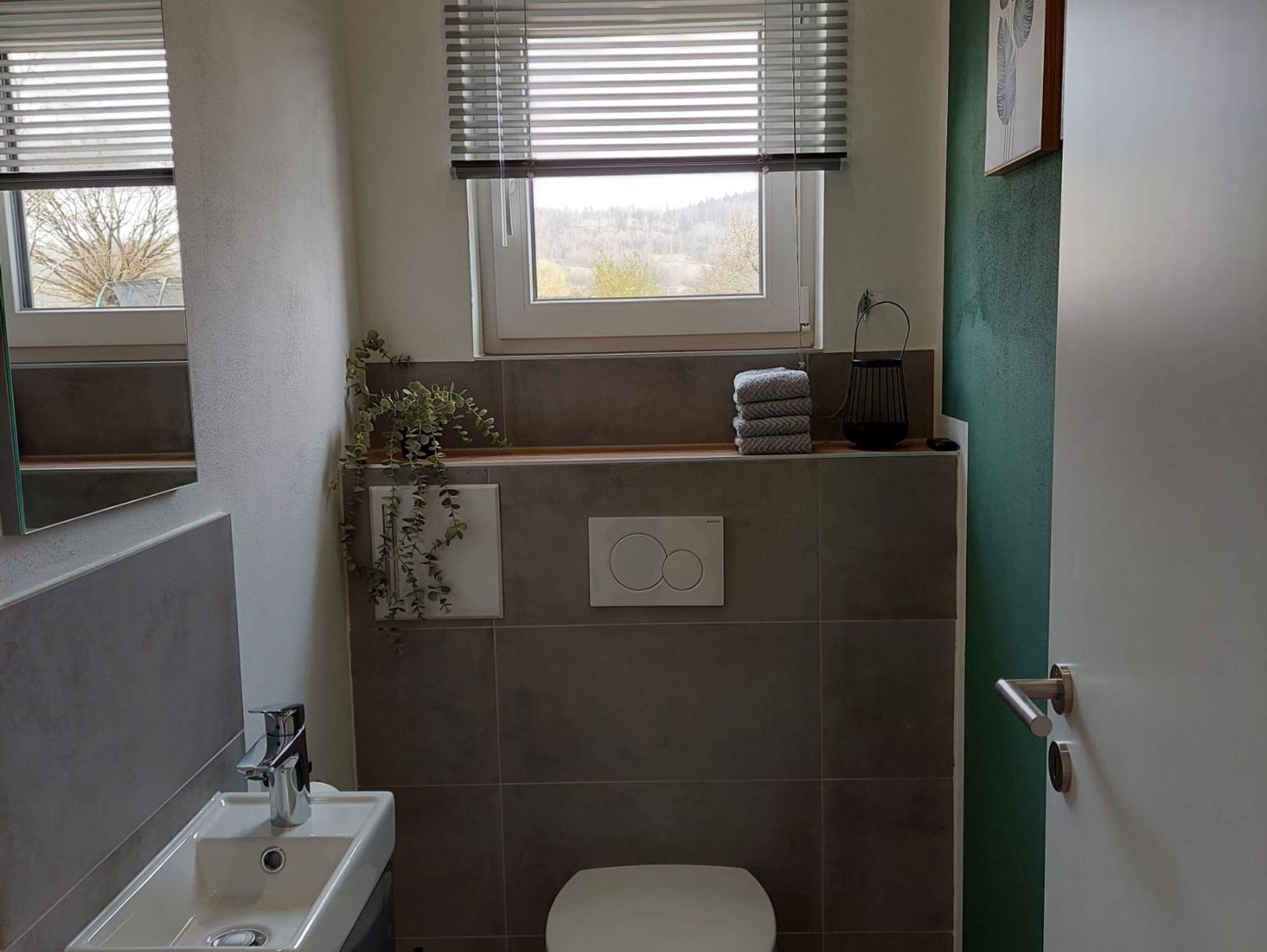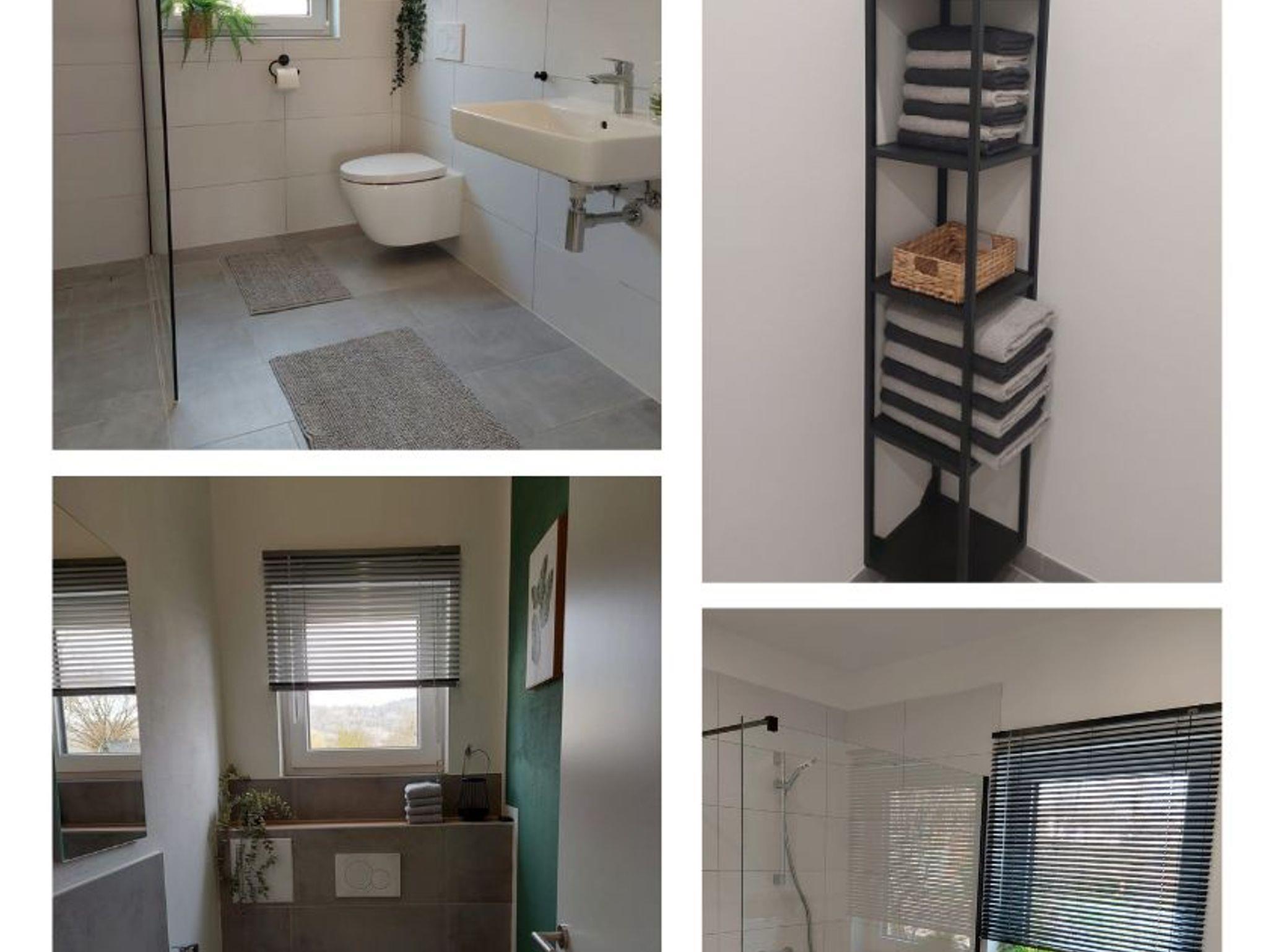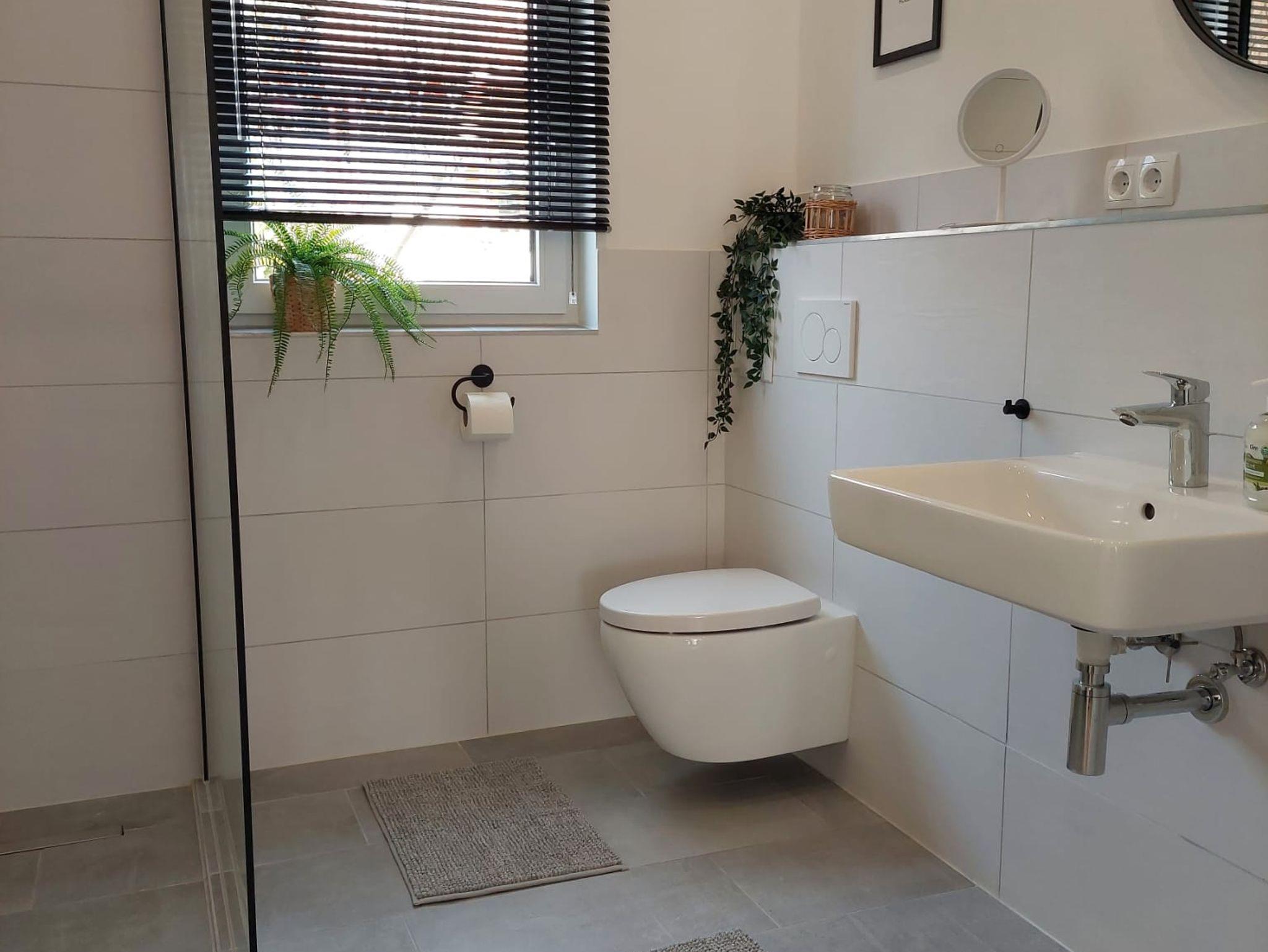 Das Badezimmer mit Infrarotheizung verfügt über eine barrierefreie Dusche und ist modern mit Haartrockner und Schminkspiegel eingerichtet, Hand- und Duschtücher sind inklusive. Zusätzlich befindet sich ein weiteres WC im Haus.