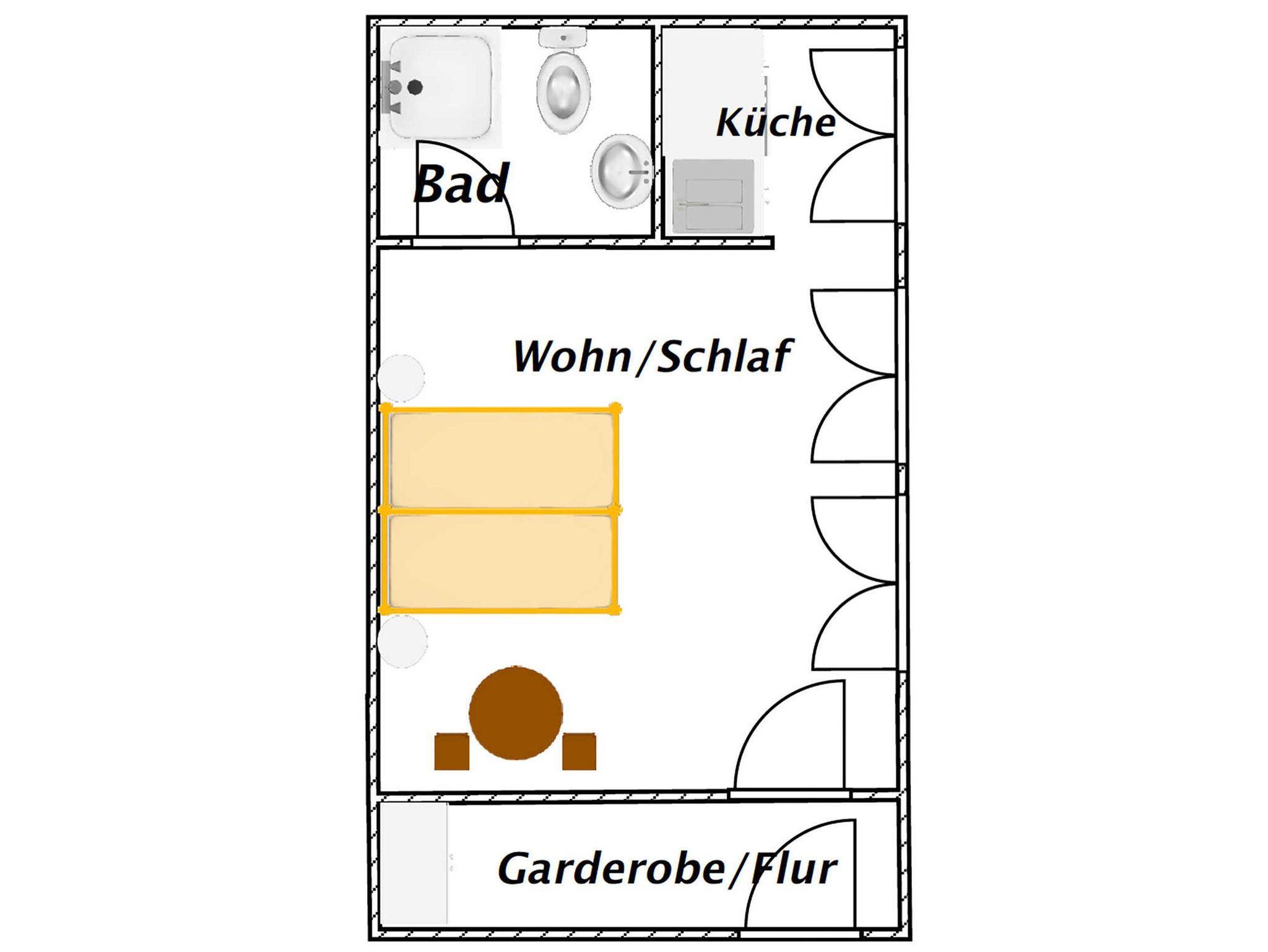 Im Eingangsbereich kommt man in einen kleinen Flurbereich mit großem Kleiderschrank. Dahinter befindet sich der geräumige Wohn- und Schlafbereich mit großem Doppelbett (180x200cm, getrennte Matratzen), Smart-TV und einer kleinen Sitzecke.