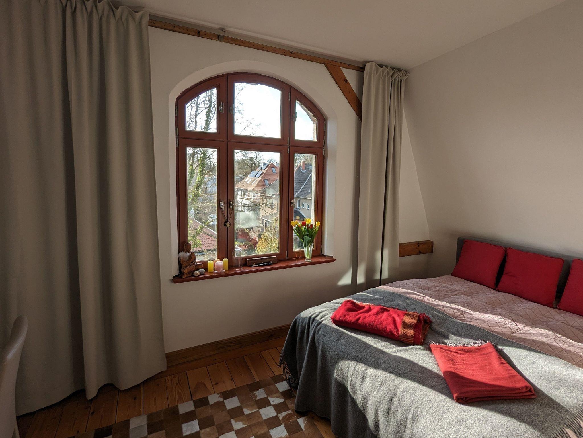 Unsere ruhige, ca. 30 qm große, liebevoll und modern eingerichtete Ferienwohnung, befindet sich im 2. OG einer Gründerzeit Villa imit Blick in den Garten. Sie besteht aus 1 Schlaf-/Wohnraum, einer voll ausgestatteten Küche (u.a. Senseo-Kapselkaffeemaschnie) und einem Badezimmer mit Dusche und WC (Toilettenpapier und Seife in Erstausstattung vorhanden) .