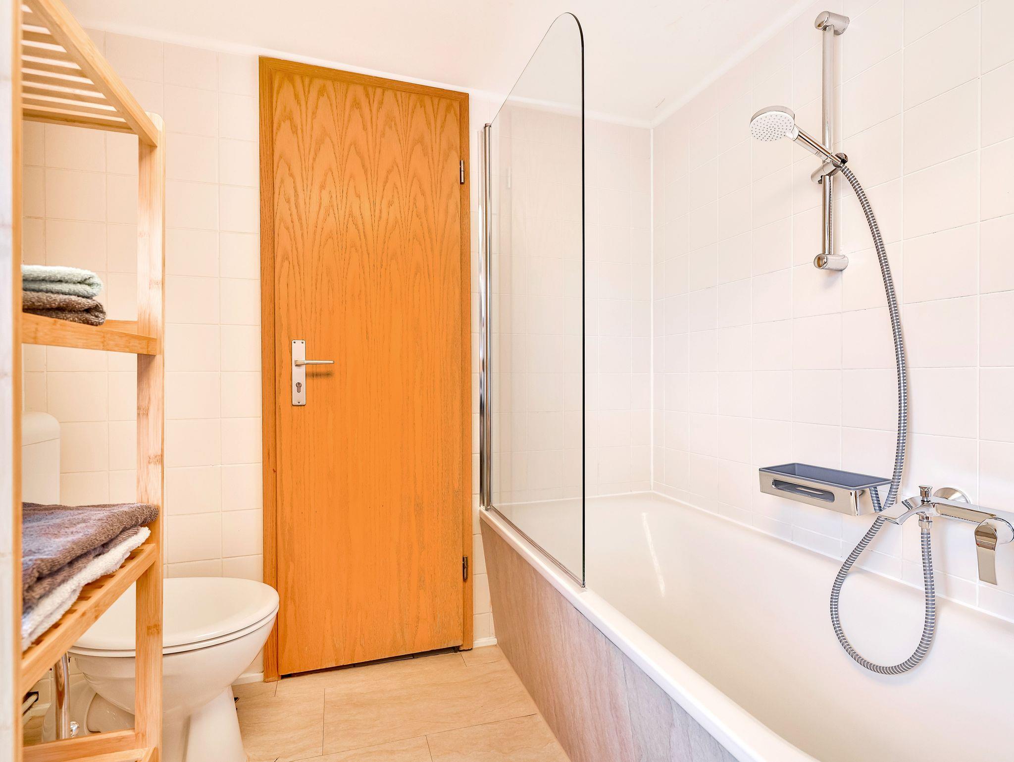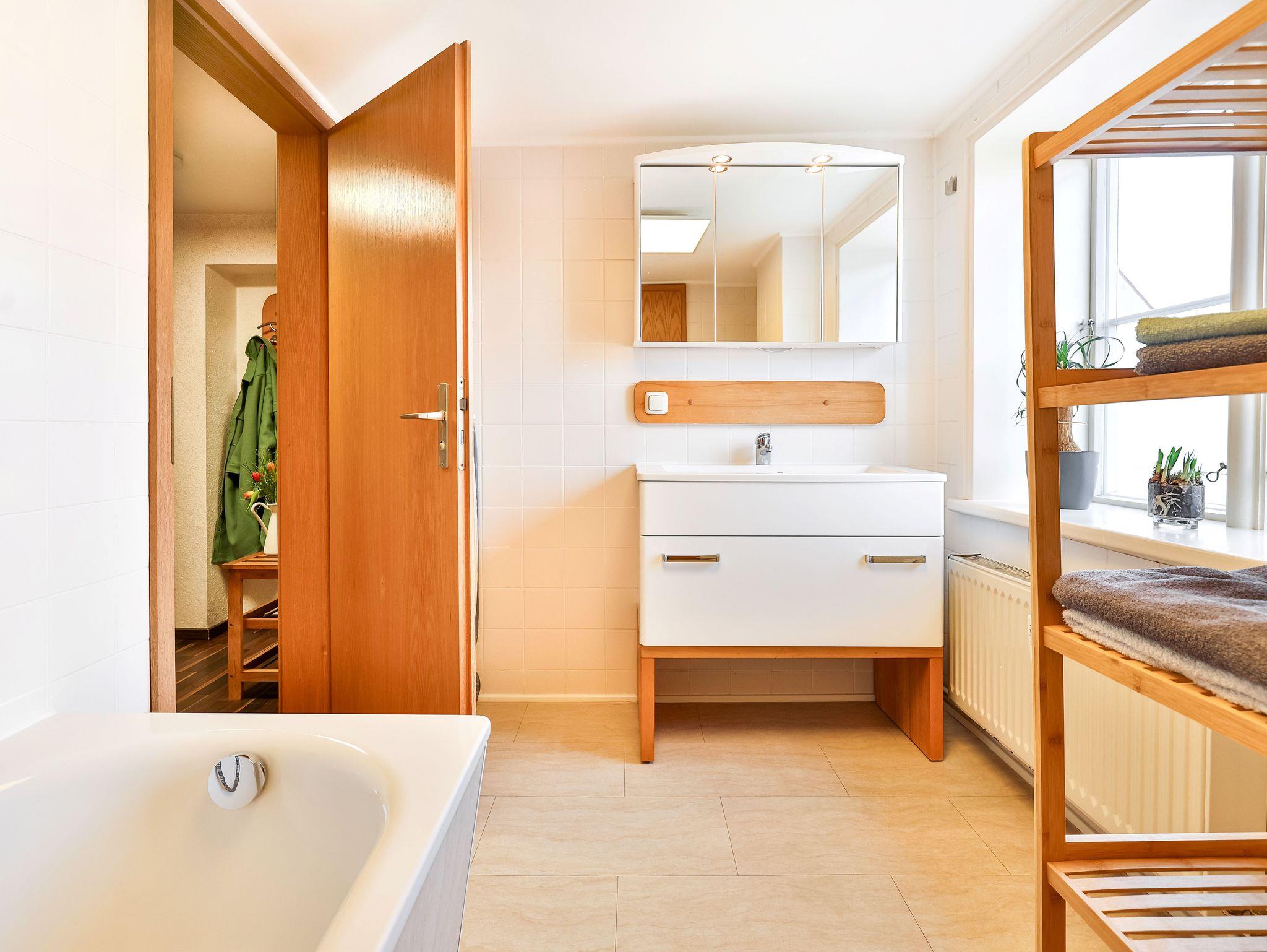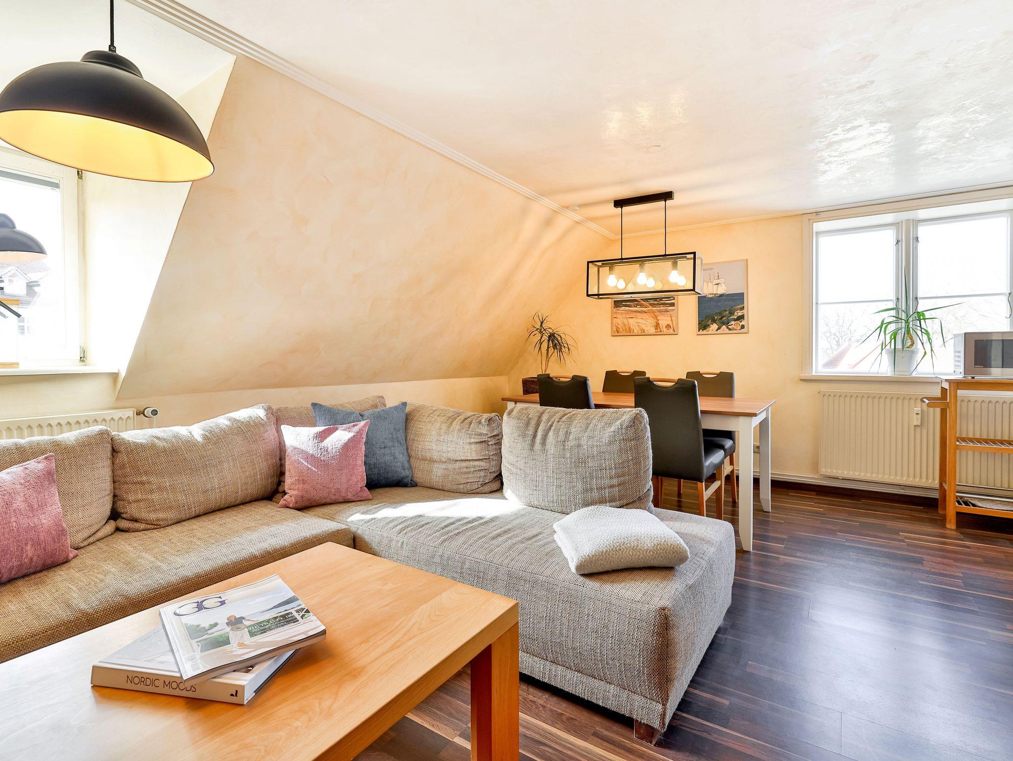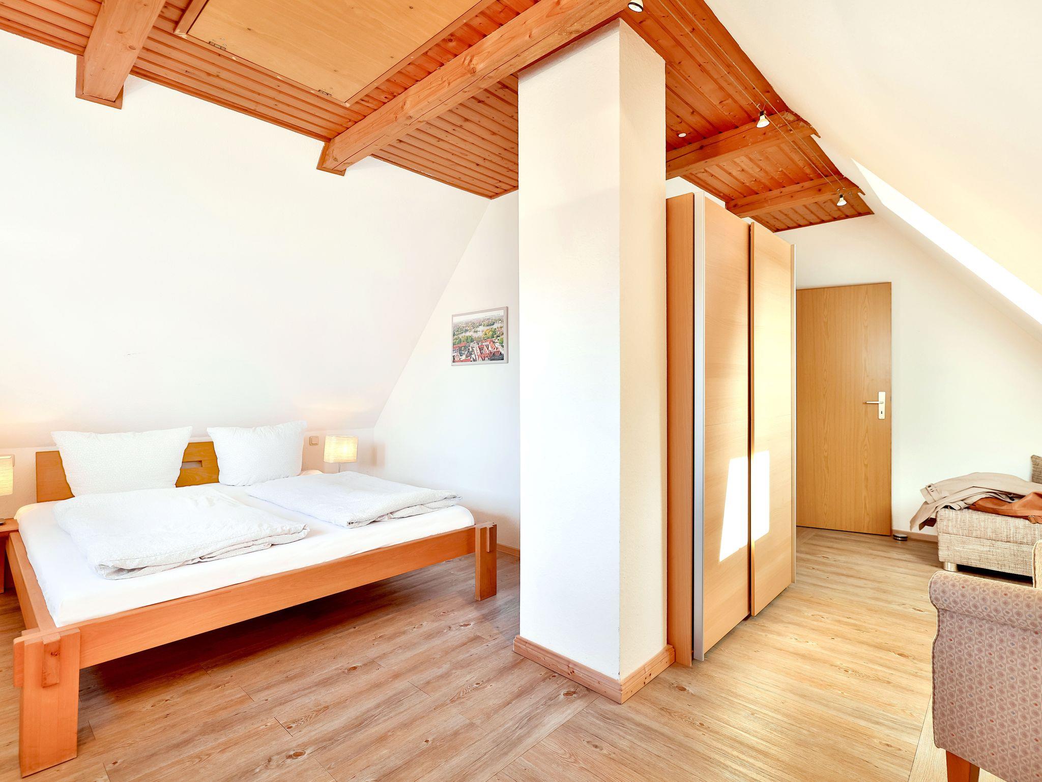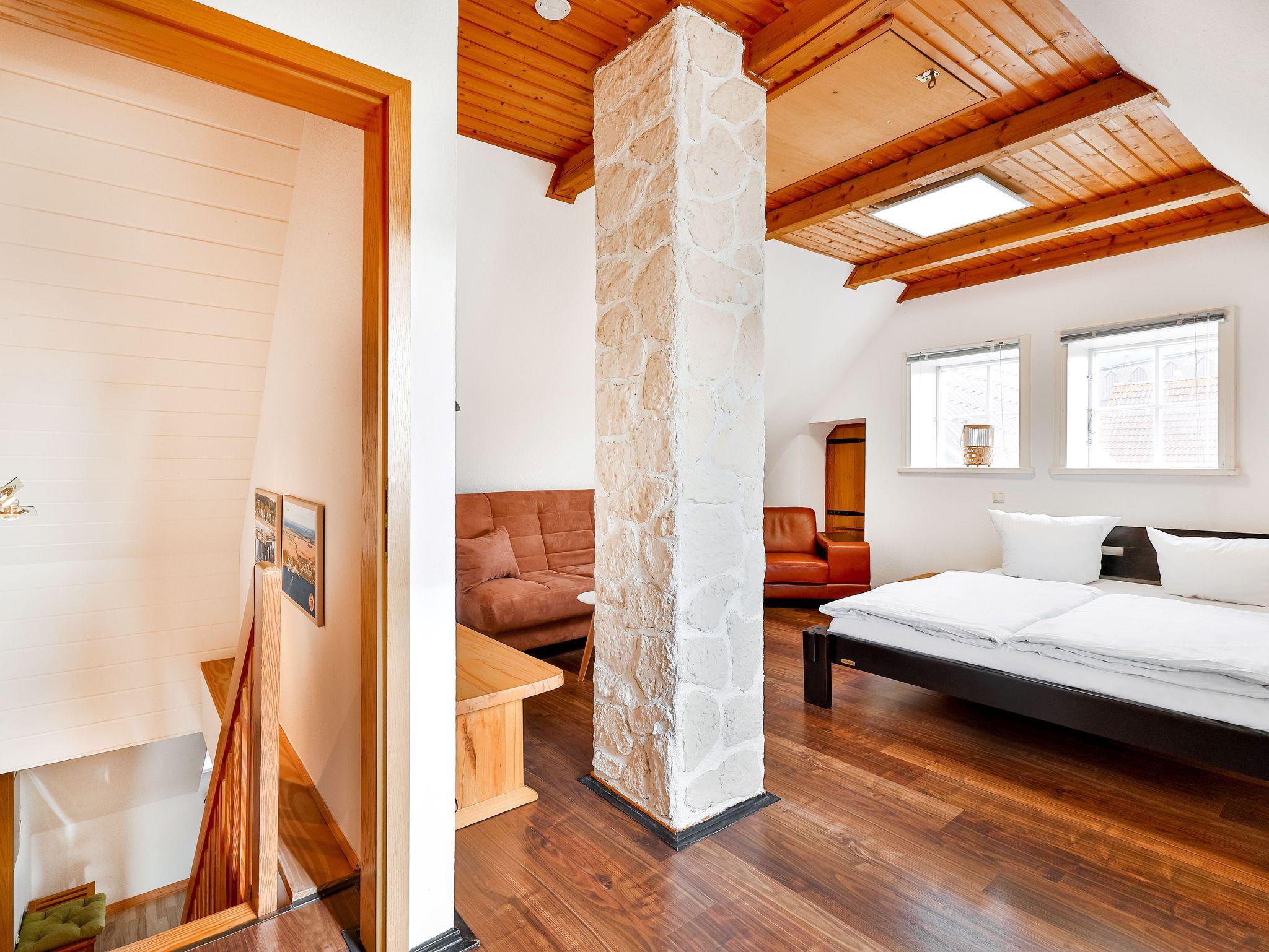 Die Ferienwohnung 3 liegt im 2.OG. Die Wohnung besteht aus einem großen Wohnraum mit offener Küche und Essbereich und dem Bad. Über eine innenliegende Holztreppe kommt man in das DG, in dem sich das Badezimmer befindet.
