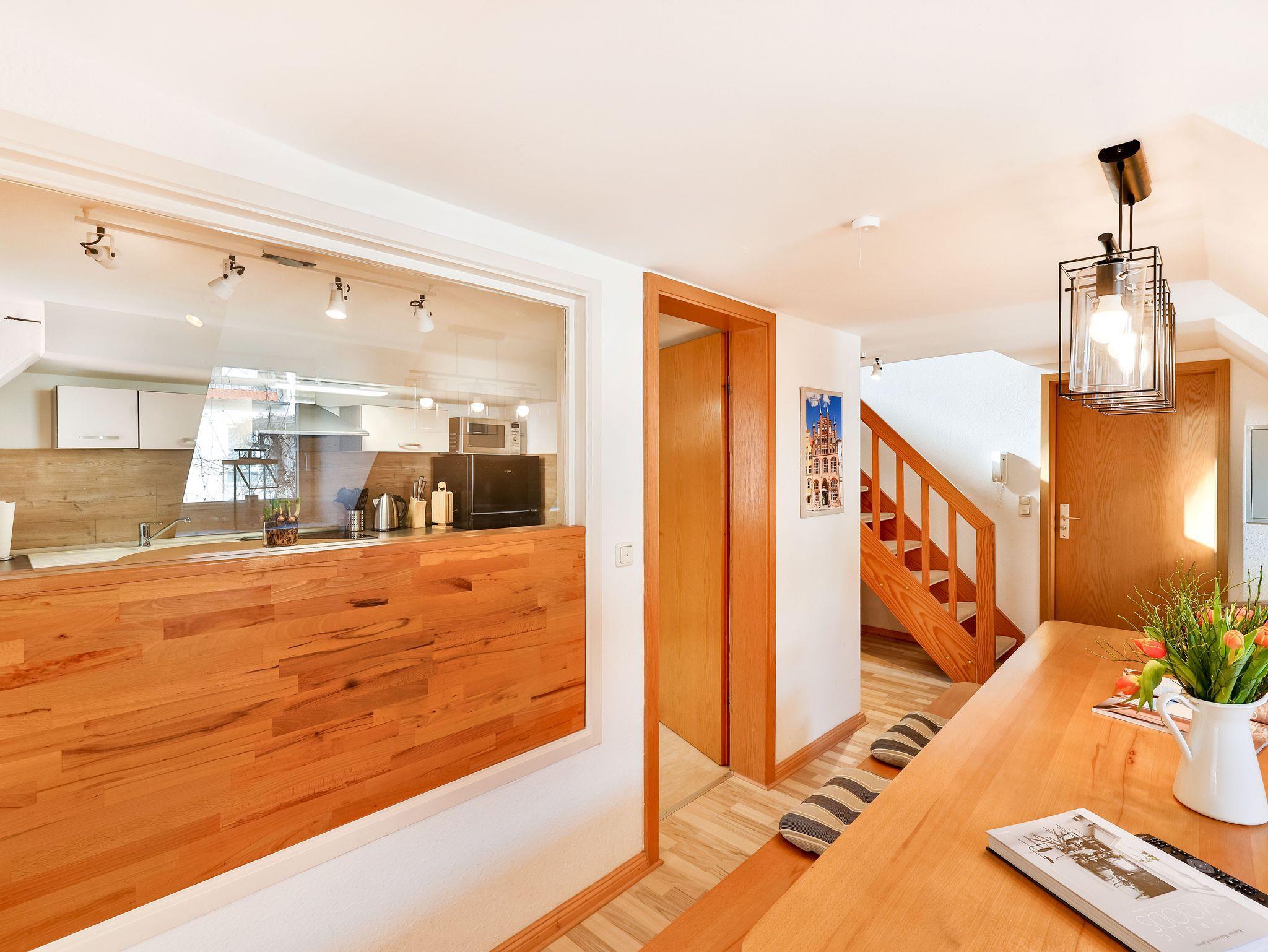 Die Ferienwohnung 4 liegt im 2.OG. Die Wohnung besteht aus einem großen Essbereich mit offener Küche, dem Bad sowie über 2 Schlafzimmer mit Doppelbetten und 1 Couch. Über eine innenliegende Holztreppe kommt man in das dritte Schlafzimmer im DG, welches zusätzlich ebenfalls über 1 Couch verfügt..