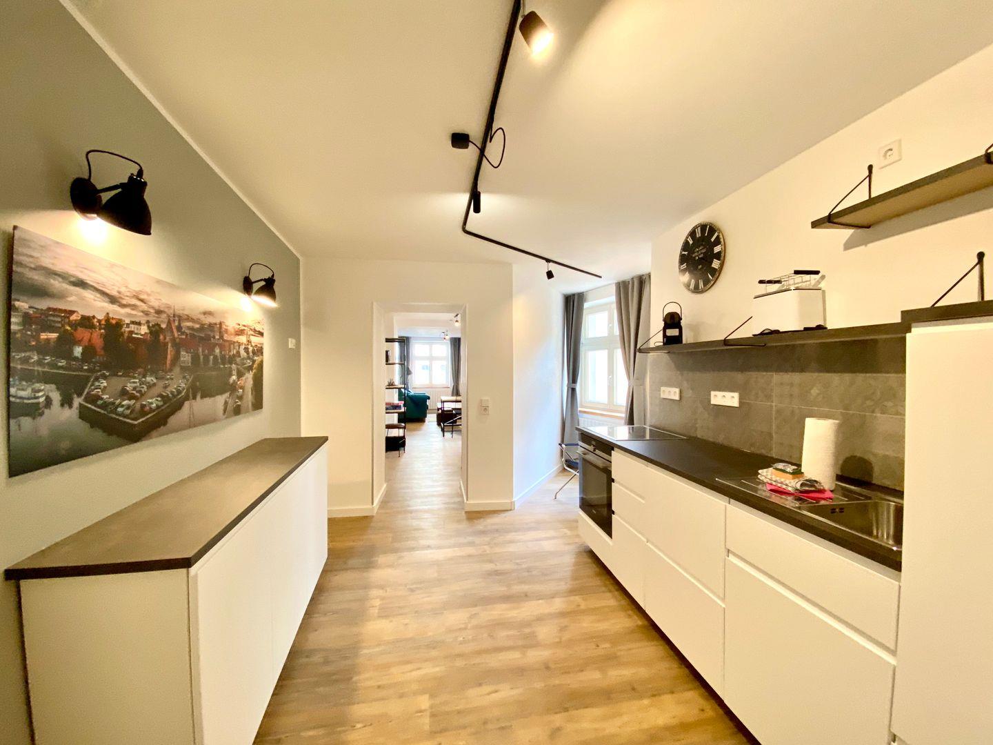 Im 4. Obergeschoss gelegen, bietet das im Industrial Style eingerichtete, neue Appartement einen traumhaften Ausblick in Richtung der berühmten "Gorch Fock", dem Ozeaneum und den rustikalen Speichern der Hansestadt Stralsund.