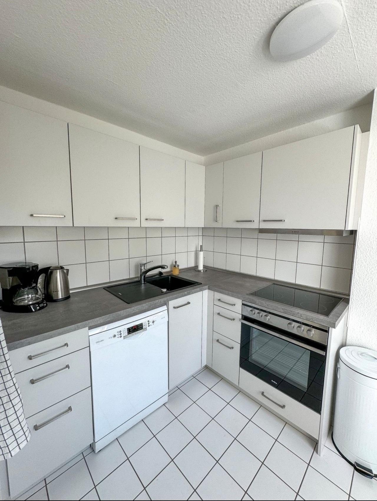 Die gut ausgestattete Küche besitzt unter anderem einen Kühlschrank, einen Herd zum Kochen und sogar eine Spülmaschine.