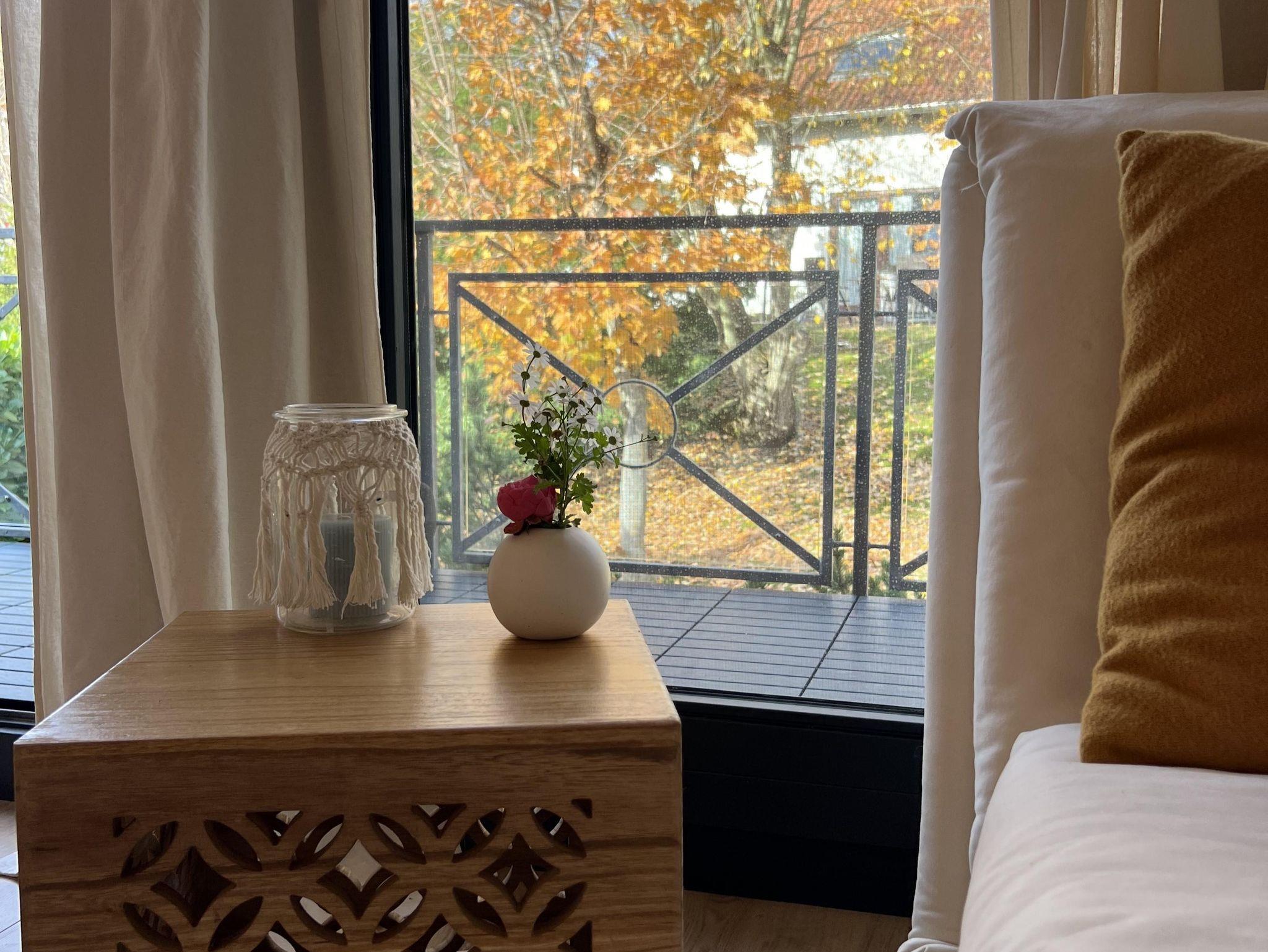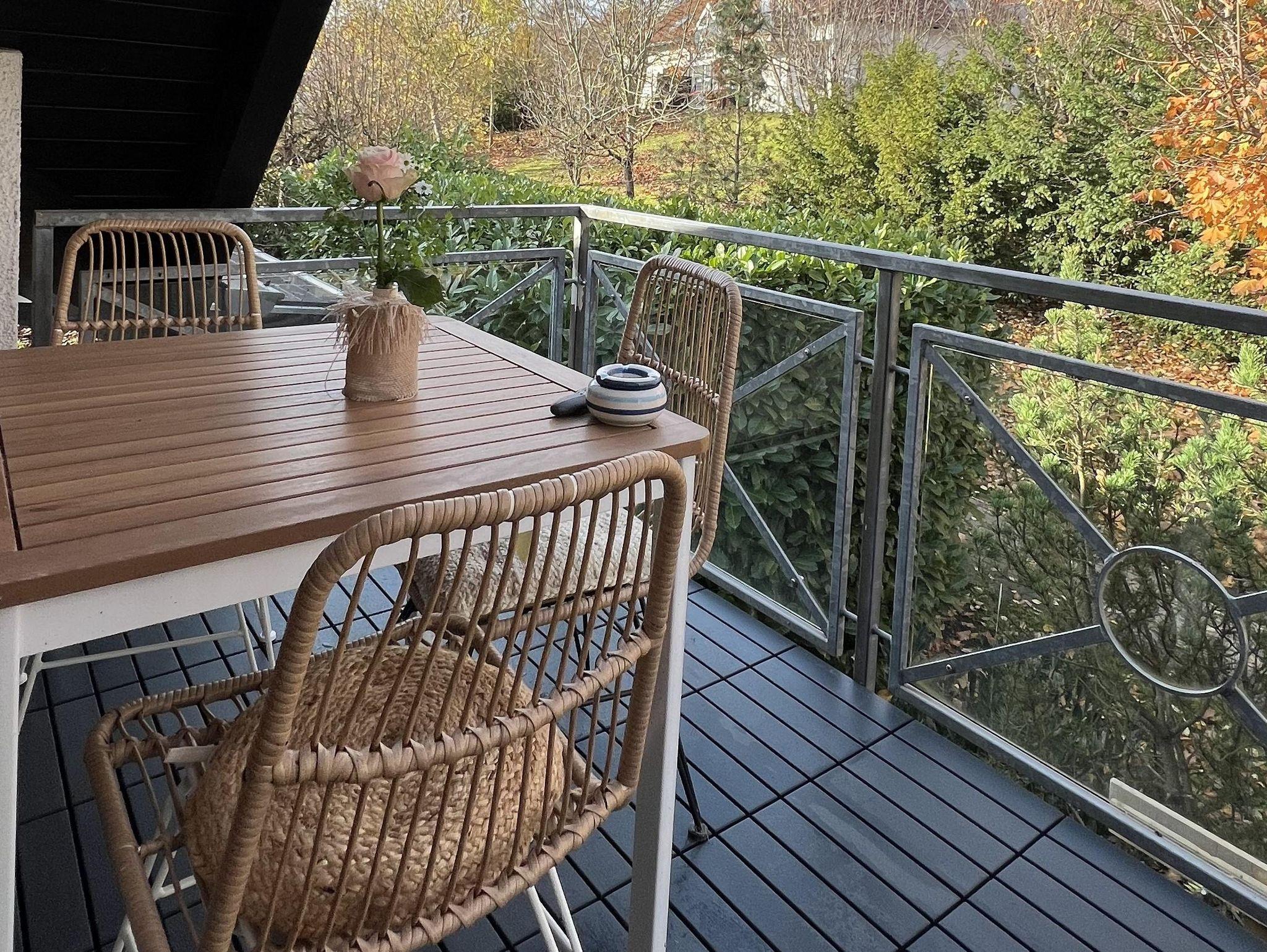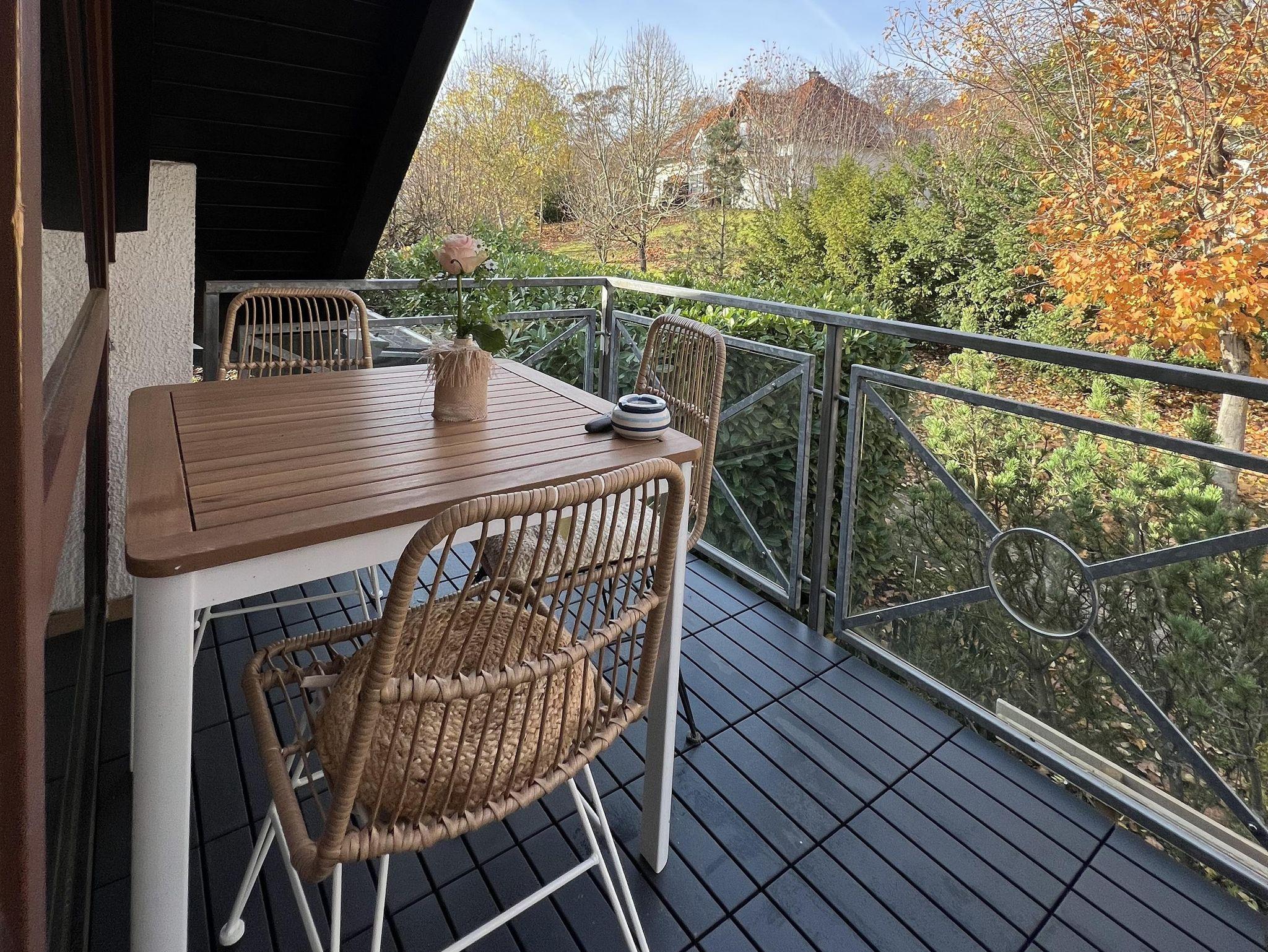 Der Balkon mit Blick ins Grüne verfügt über einen Tisch und drei Stühle.
