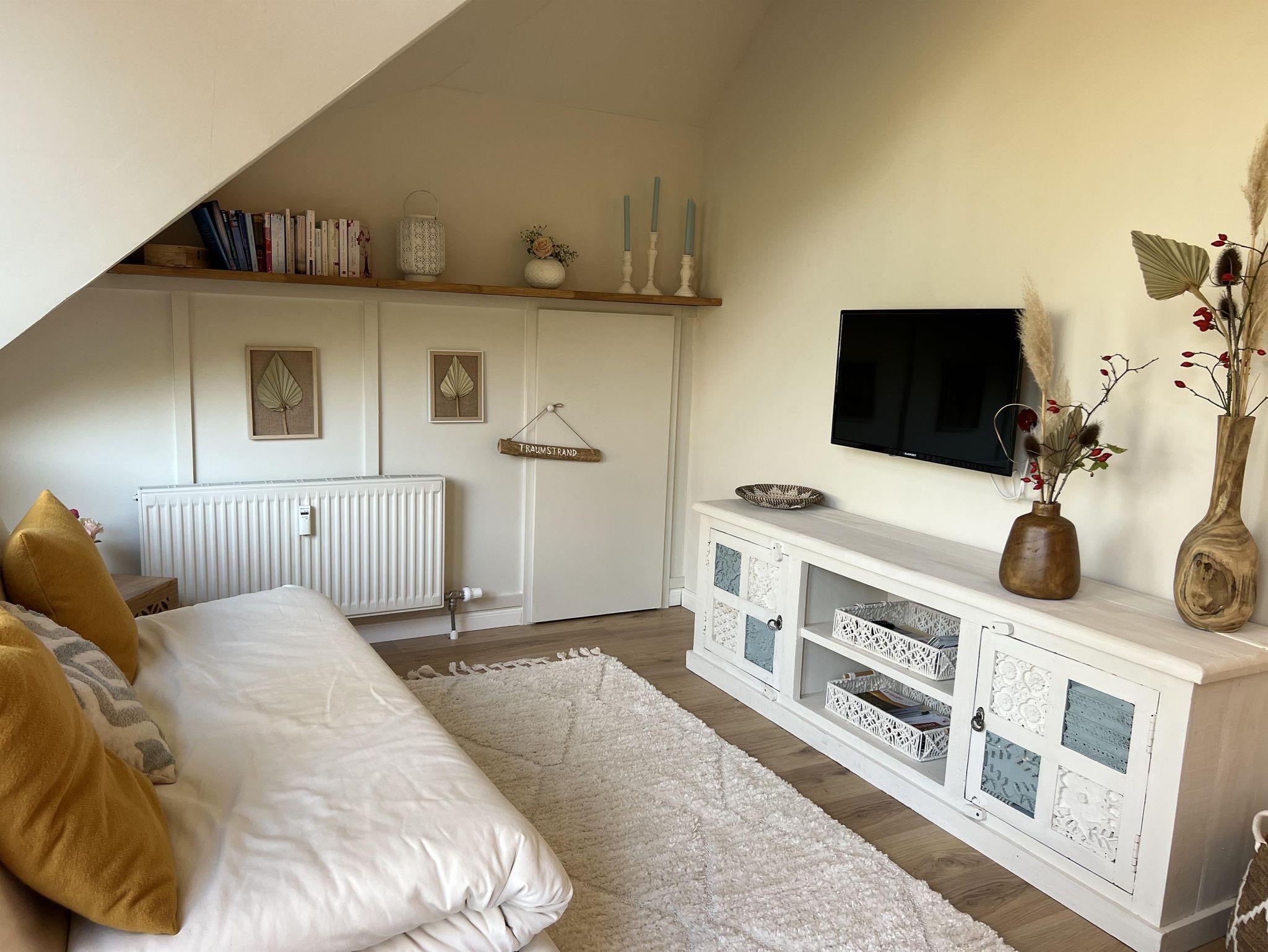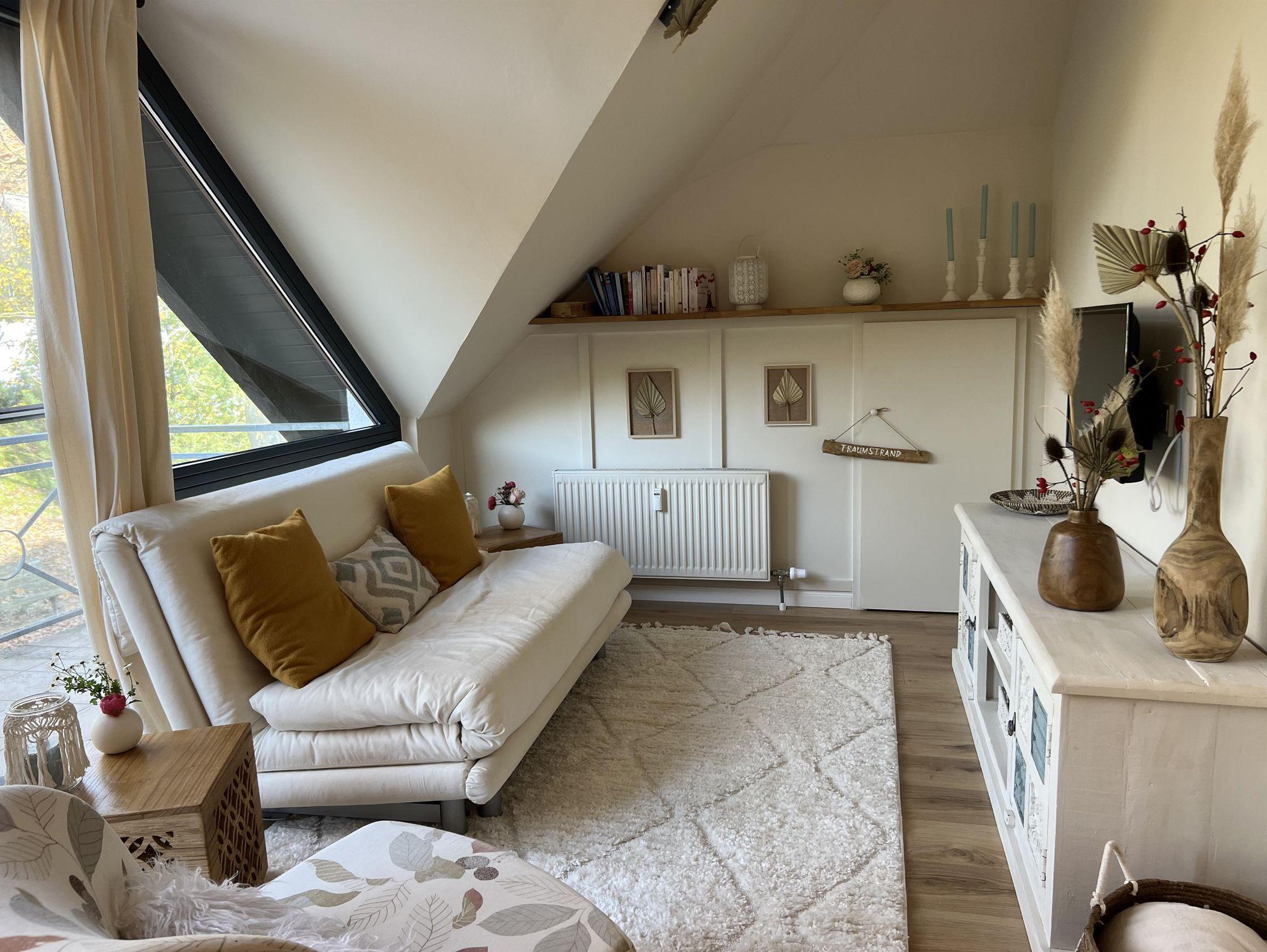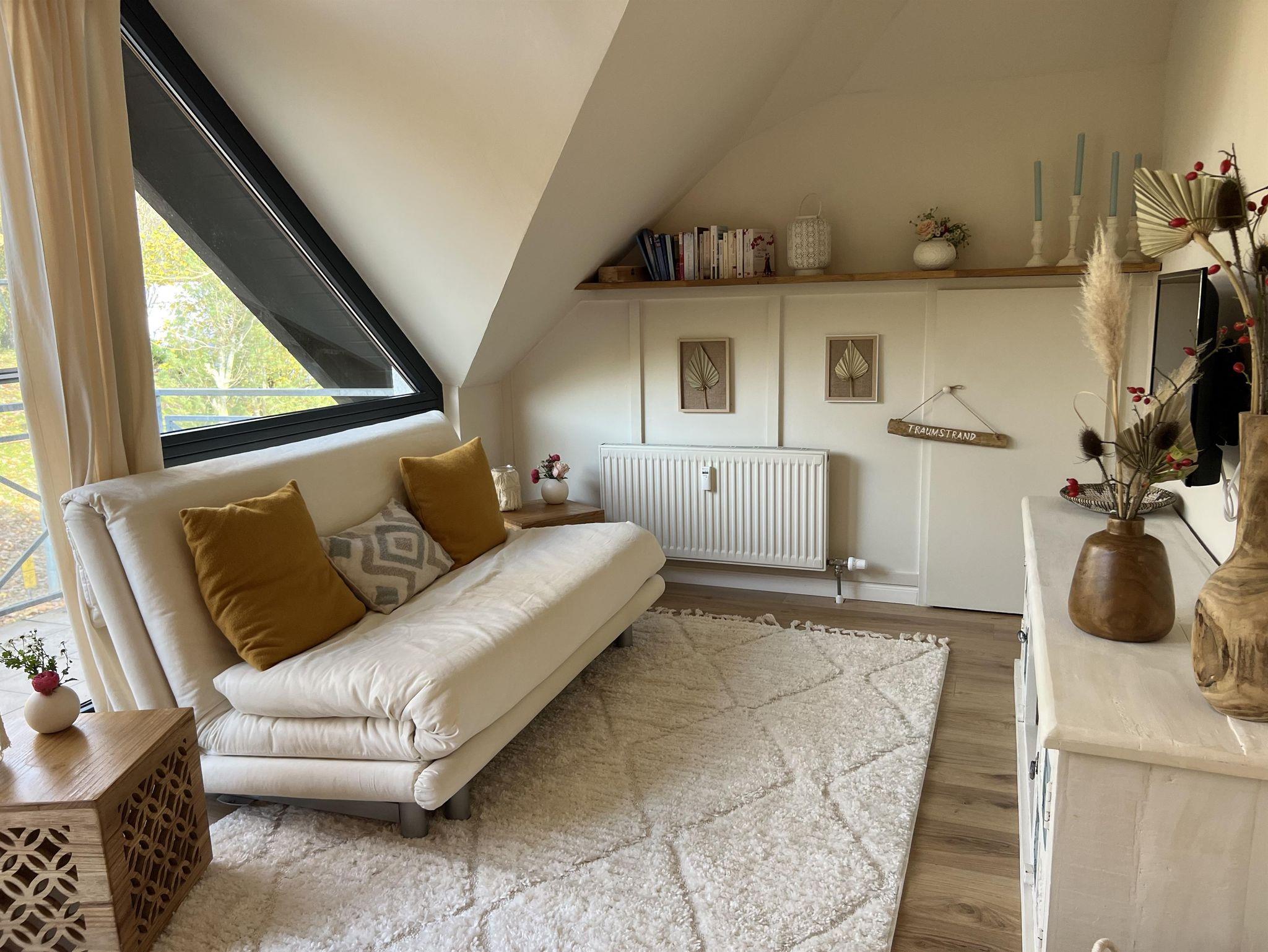 Das Sofa lässt sich ganz leicht zum Bett umwandeln. Bad mit Tageslicht und moderne Ausstattung.