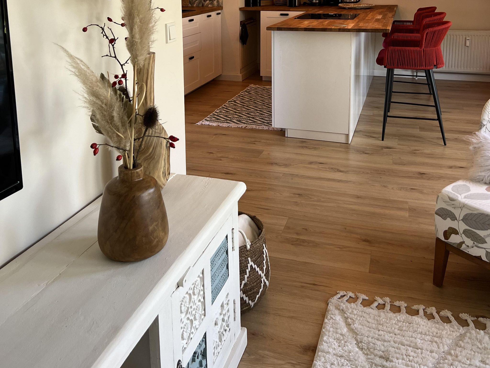 Schöne Wohnküche mit Sofa, Fernseher und gut ausgestattete Küchenzeile. Kühlschrank mit Gefrierfach, Cerankochfeld, Backofen sowie Spülmaschine, Kaffemaschine, Toaster und Wasserkocher vorhanden.