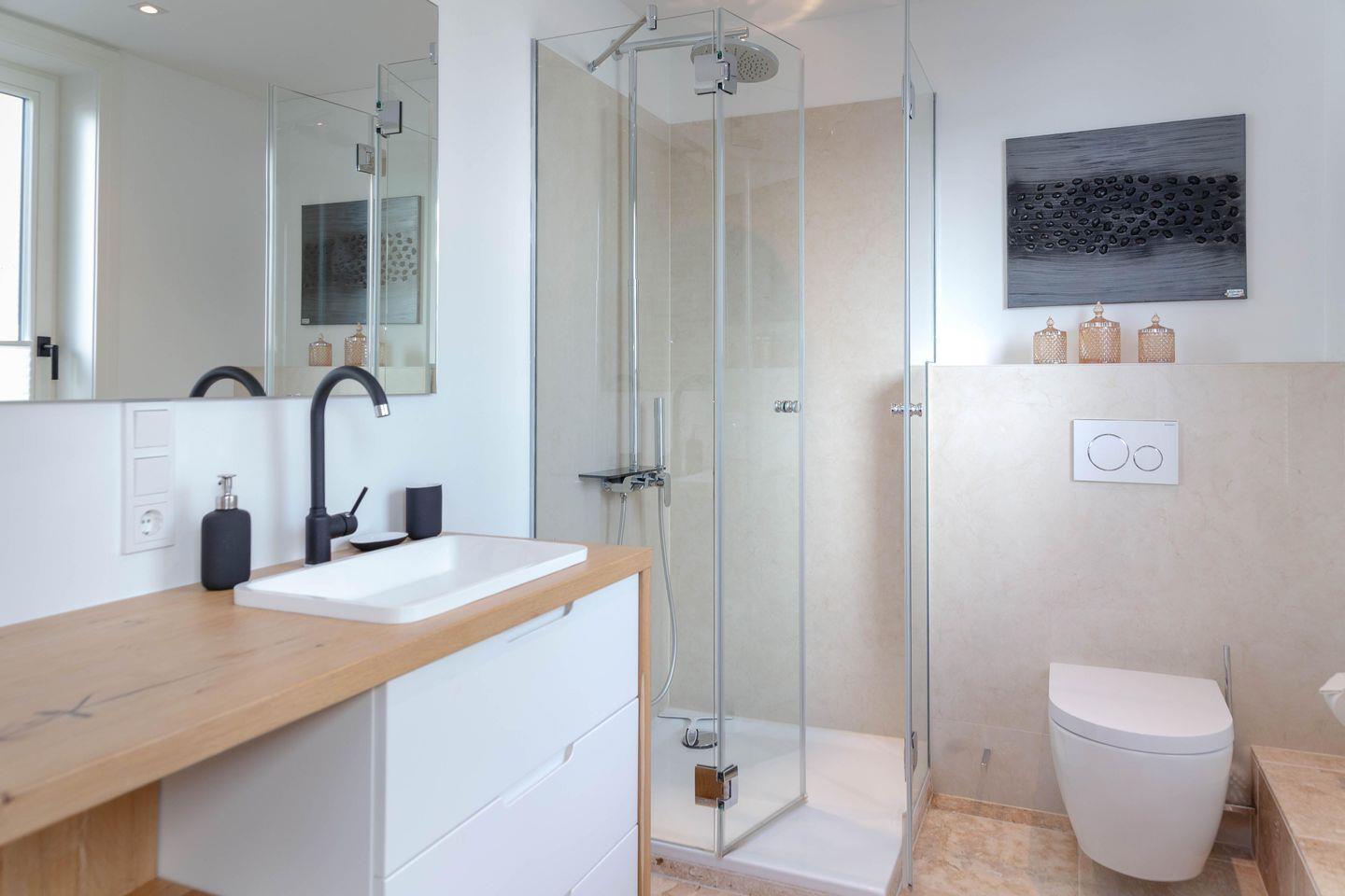 Im separaten Schlafzimmer finden Sie erholsamen Schlaf in einem komfortablen Boxspringbett und ausreichend Stauraum in großzügigen Einbauschränken. Das stilvolle Natursteinbad verfügt über eine moderne, bodentiefe Dusche – ein Ort der Ruhe und Entspannung.