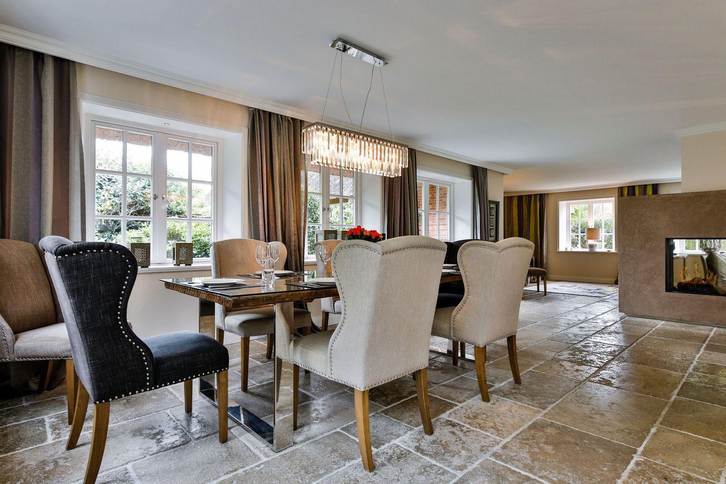Wohn-/Essbereich: Essbereich mit großem Tisch mit 8 Stühlen für die ganze Familie, geräumiger Wohnbereich mit zwei großen Couchecken sowie zwei Sesseln am doppelseitigen, dekorativen Gaskamin