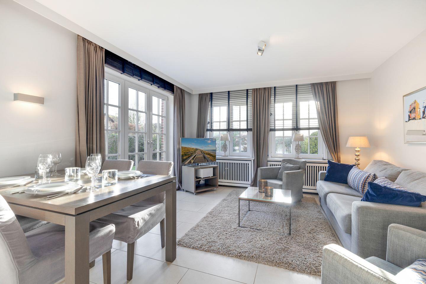 Wohn-/Essbereich: heller Raum mit zweisitzigem Sofa und zwei Sesseln, Sideboard sowie Flat-TV; eckiger Esstisch mit vier Stühlen