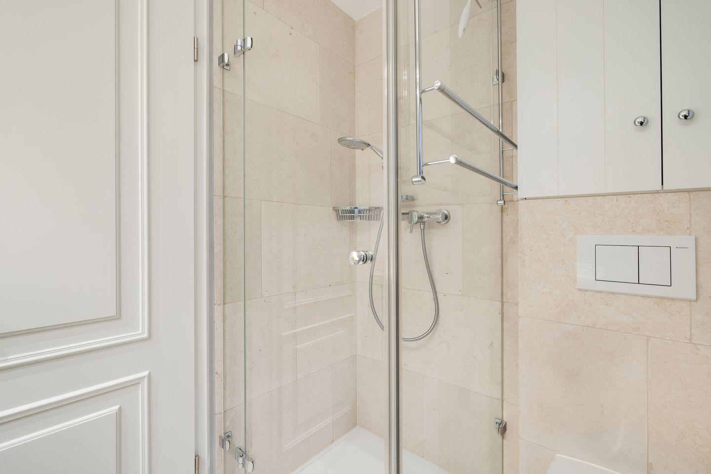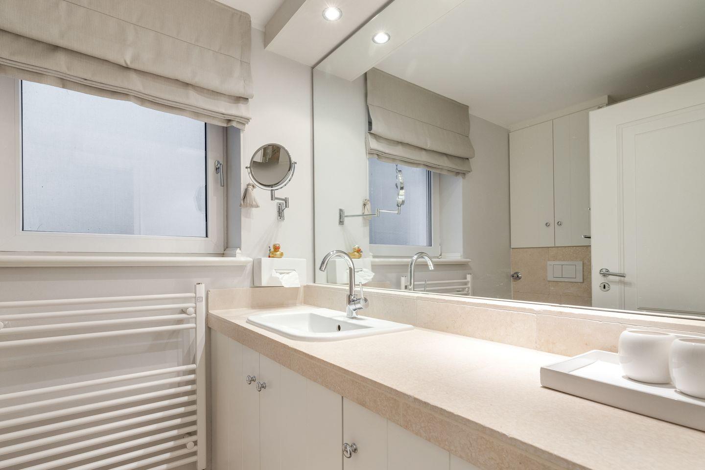 Badezimmer: Duschbad mit Einzelwaschtisch und großem Spiegel, Fön, Fußbodenheizung und elektrischem Handtuchwärmer