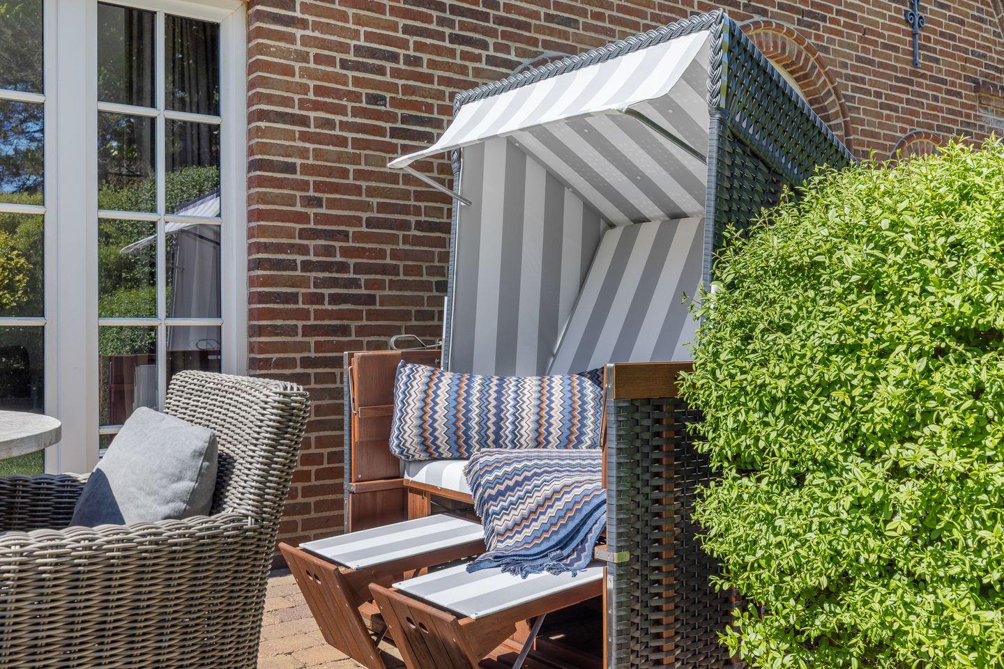 Garten/Terrasse: eingewachsene Südost-Terrasse mit großzügigem Garten, Gartengestühl und Saisonstrandkorb ( ca. April - Oktober )