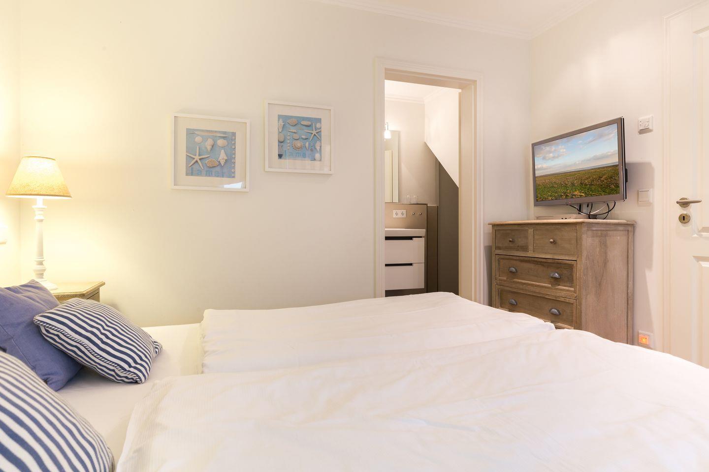UG: Bereits der Treppenabgang macht Appetit auf Mehr im Souterrainbereich: Designerleuchten und eine LED-Treppenstufenbeleuchtung weisen den Weg. Es empfängt Sie ein wertig gestalteter Raum mit Flat-TV. Auch hier dürfen sich Ihre Rücken auf ergonomisch-traumhaften Schlaf in Ihrem Boxspring-Doppelbett (ca. 180x200cm) freuen. Der großzügige Lichtschacht wurde kunstvoll mit einem Syltmotiv bemalt und verströmt Syltfeeling pur.