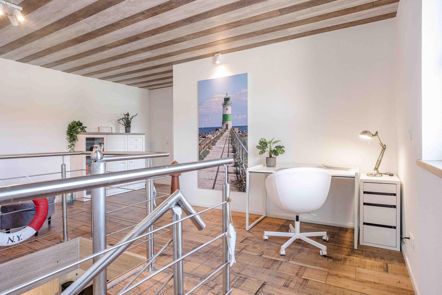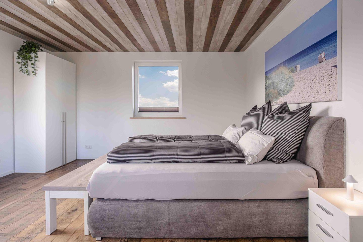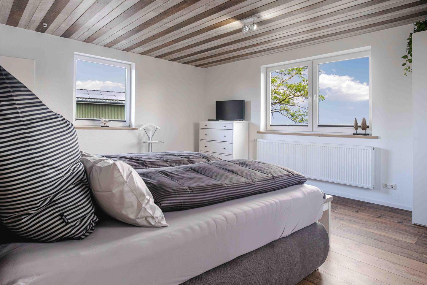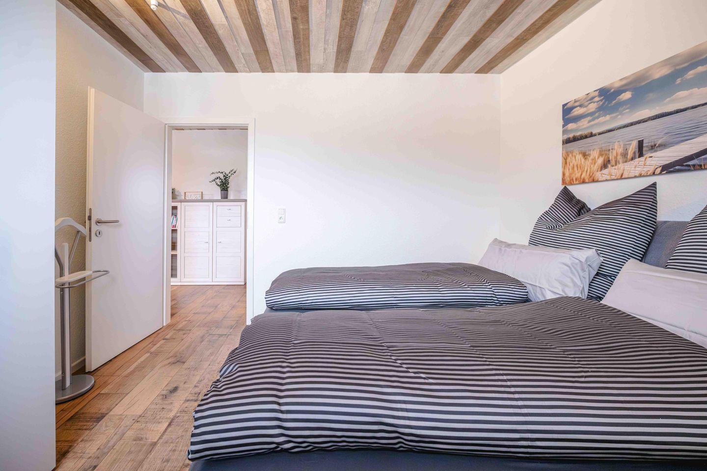 Ruhe und Erholung finden Sie in den beiden stilvollen Schlafzimmern, die jeweils mit einem komfortablen Boxspringbett (180x200 cm) mit offenem Fußende und einem geräumigen Kleiderschrank ausgestattet sind. Damit Ihr Schlaf ungestört bleibt, verfügen alle Fenster über Verdunklungsmöglichkeiten, sowie Fliegengitter an je einem Fenster. Das helle Badezimmer mit Dusche, WC und Fenster wird durch ein praktisches Gäste-WC ergänzt. Auch an den Alltag wurde gedacht: Ein separater Schreibtisch, eine Waschmaschine zur Eigennutzung sowie Bügelutensilien und ein Staubsauger stehen Ihnen zur Verfügung.