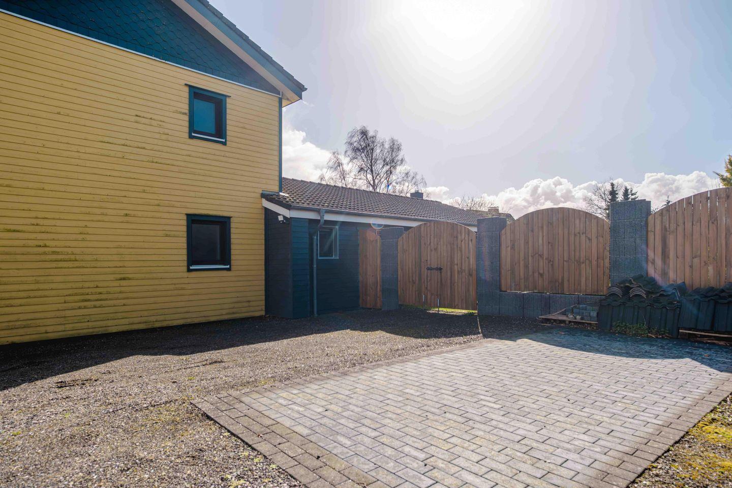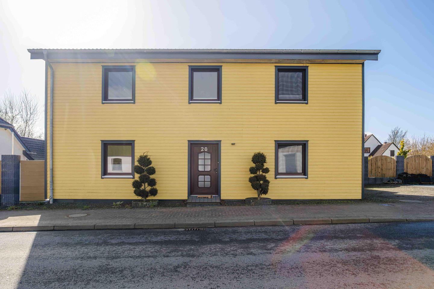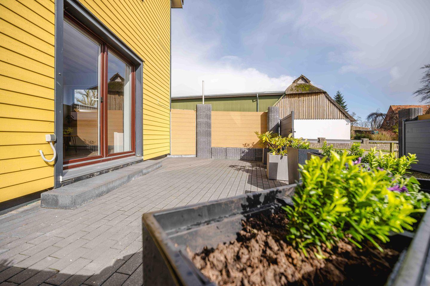 Modernes Ferienhaus Sonnengelb mit Terrasse und WLAN in idyllischer Lage bei Schlei und Ostsee.