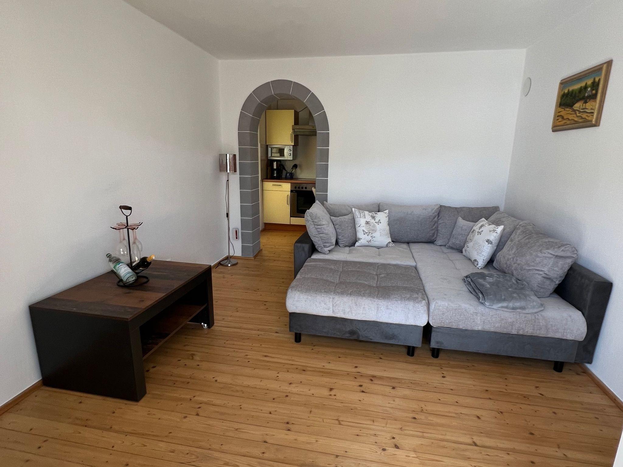 Im Wohnzimmer befindet sich eine Couchlandschaft mit kleinem Couchtisch. Fernseher und Wlan ist natürlich auch vorhanden.