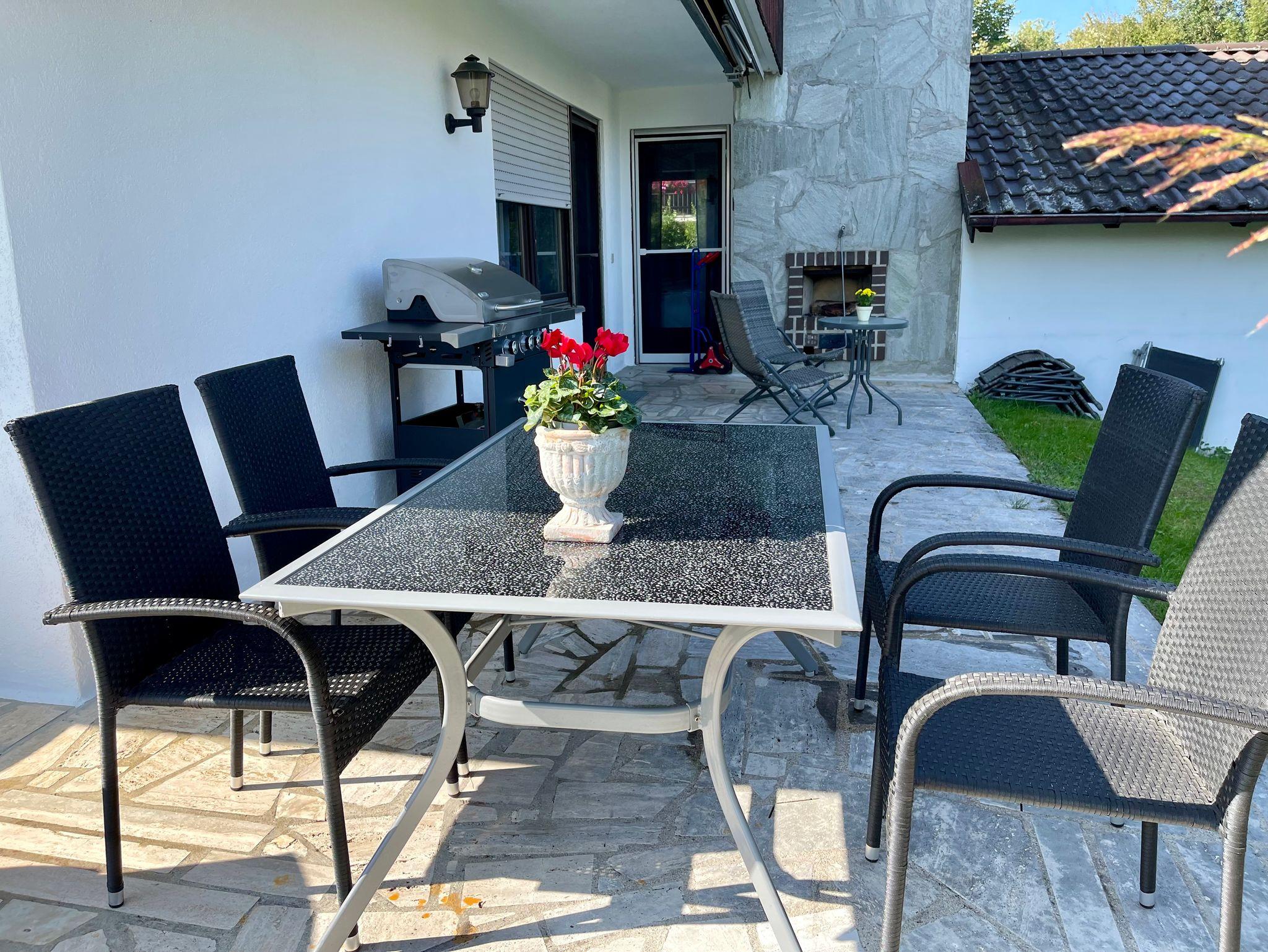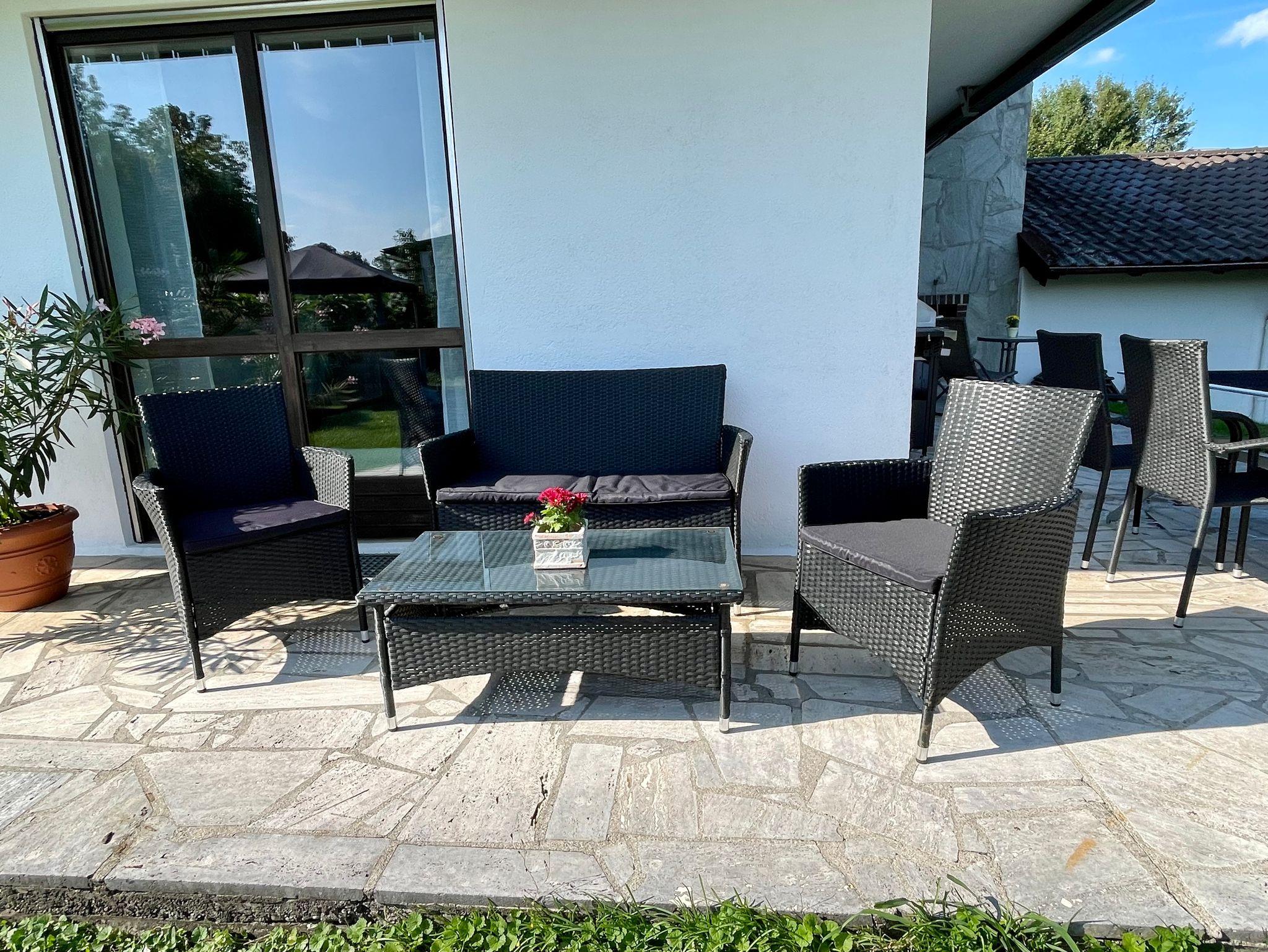 - einer großen, überdachten Terrasse auf der Ost- und Südseite mit Sitzmöbel