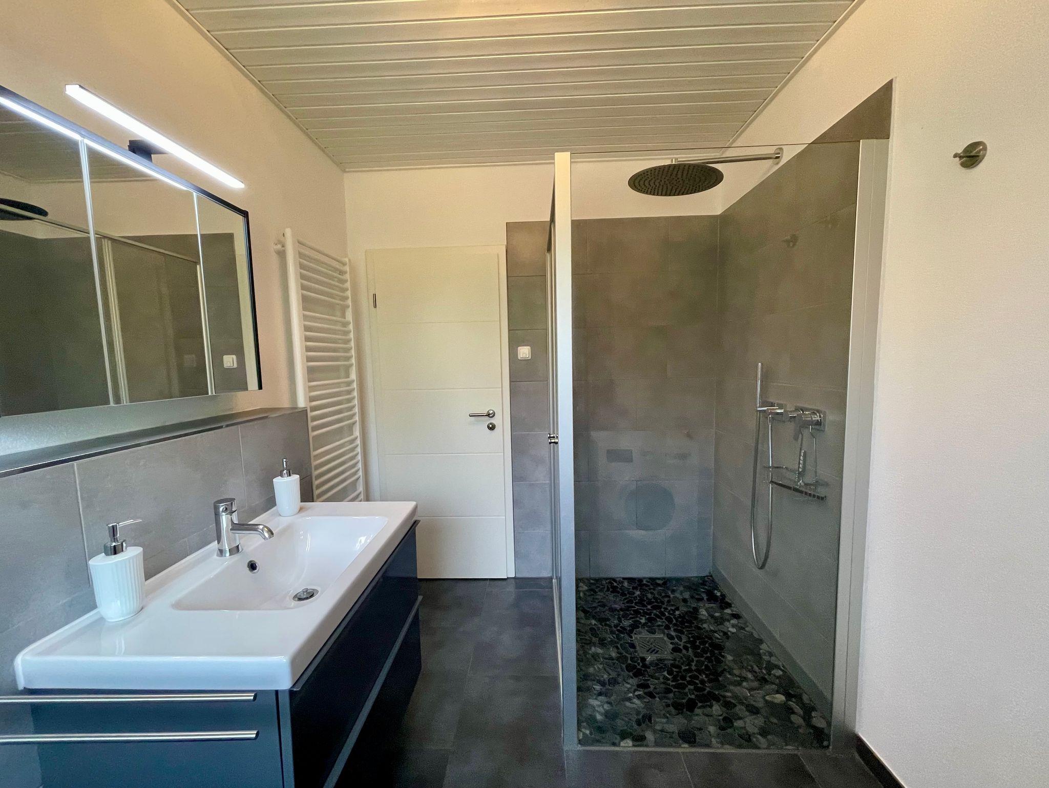 - helles Badezimmer mit Dusche und Waschmaschine