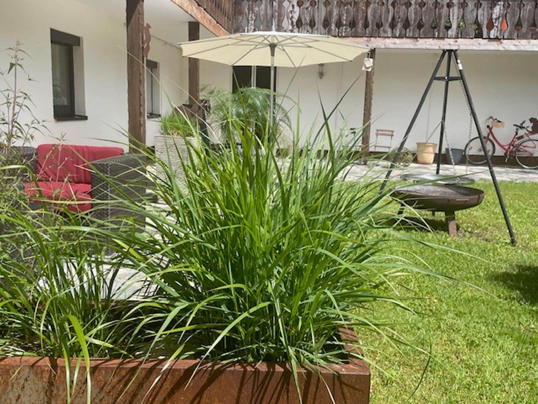 Freuen Sie sich im Sommer auf einen idyllischen, grünen Innenhof mit Grillmöglichkeit und erfrischender Gartendusche auf der Sonnenseite – perfekt für entspannte Stunden im Freien.
