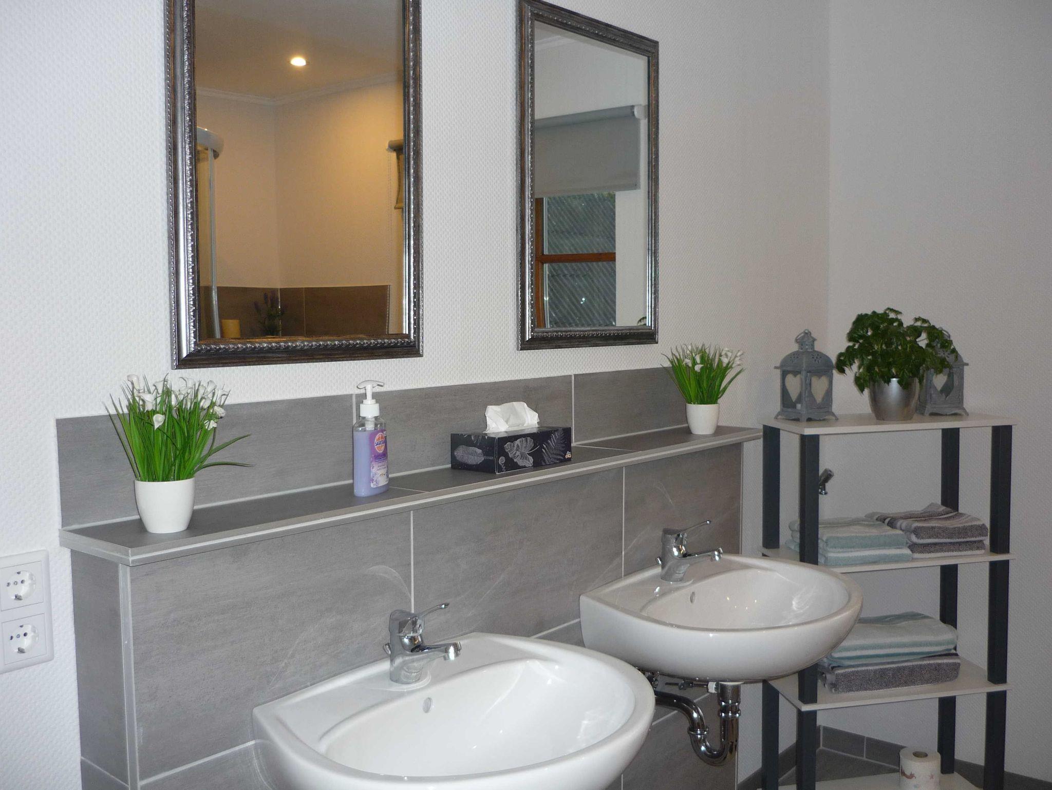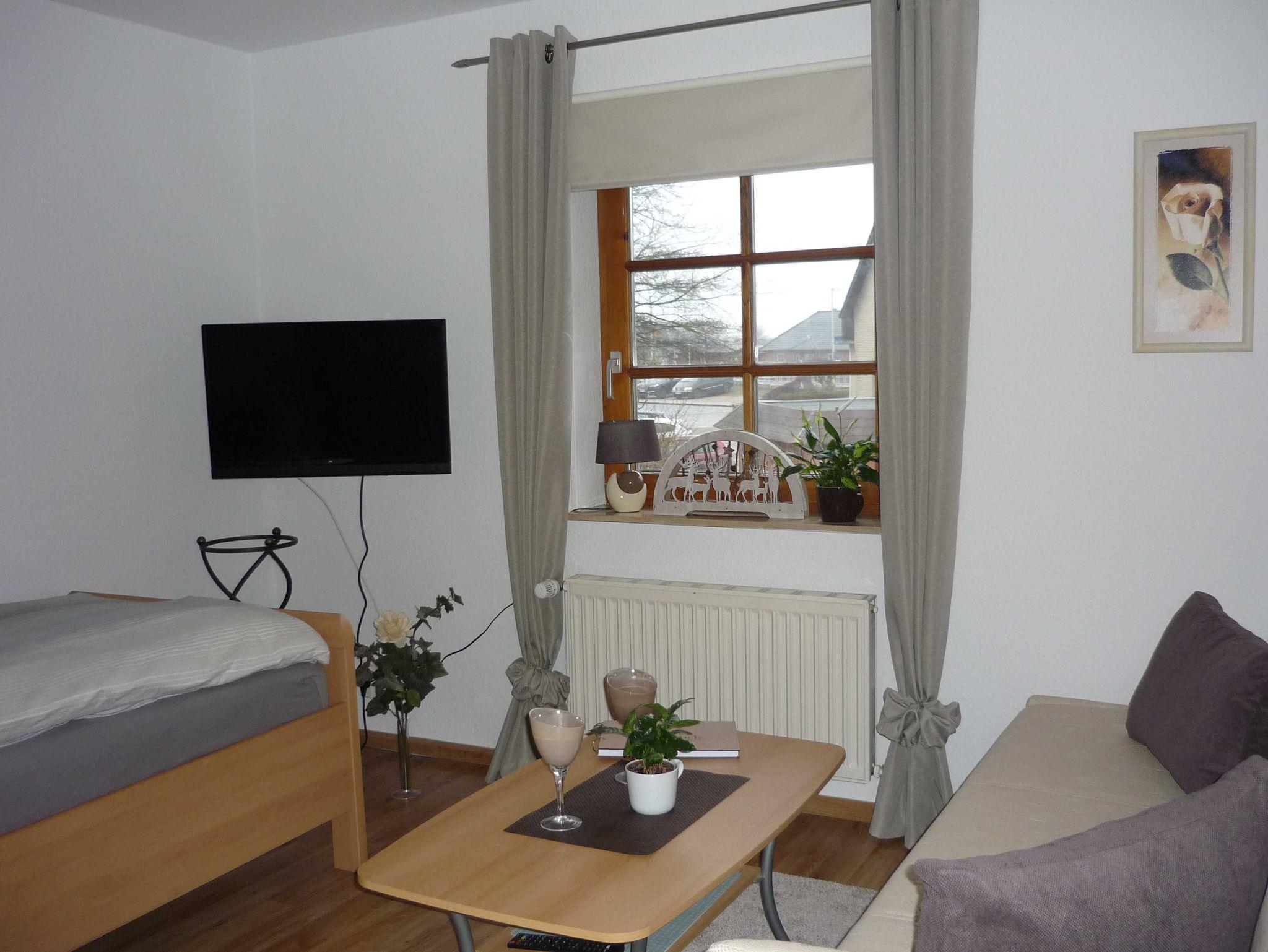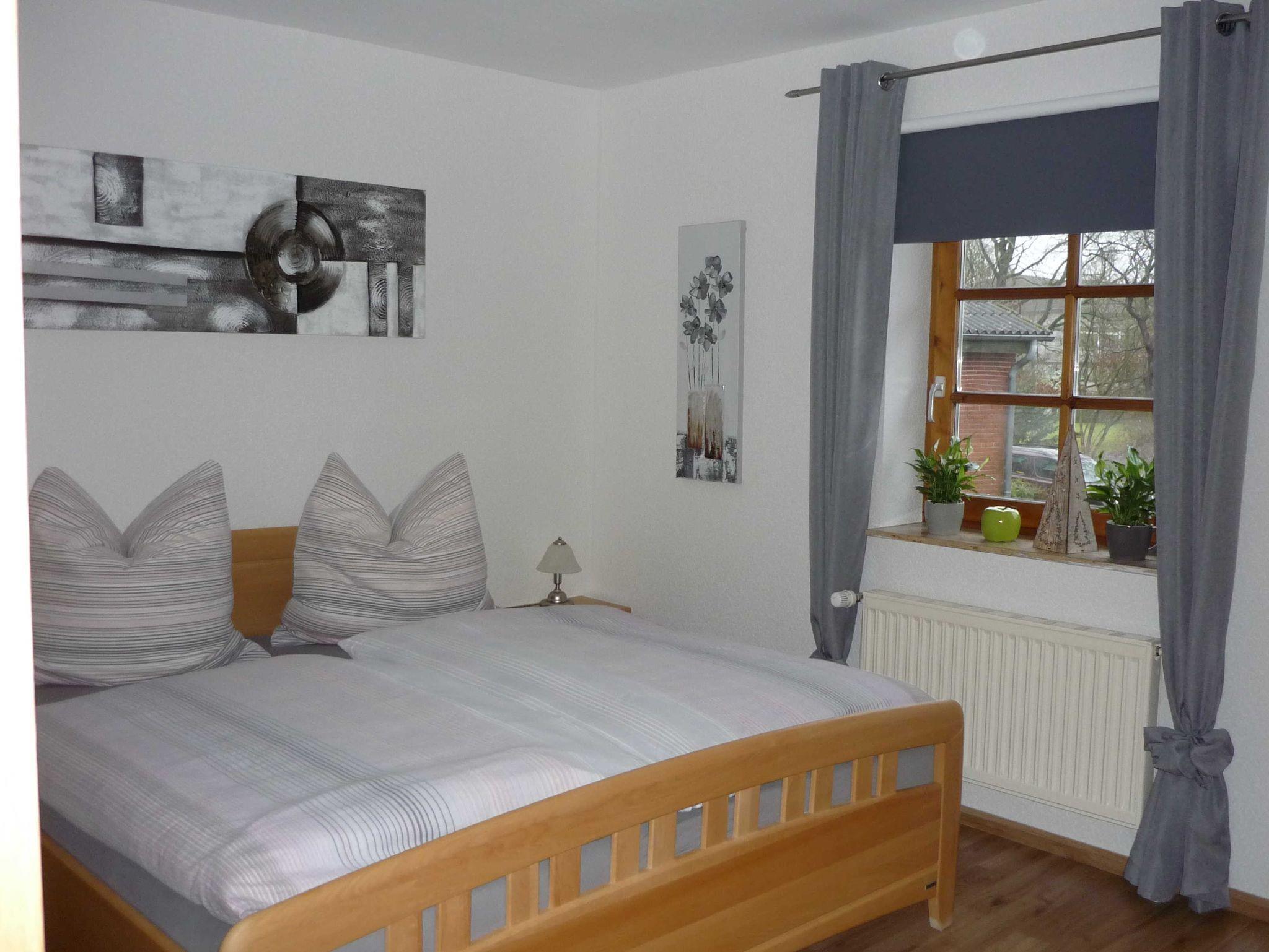 Die gemütliche Wohnung im Obergeschoss hat zwei Schlafzimmer: ein Schlafzimmer mit einem großen Doppeltbett und Platz für ein Kinderbett (vorhanden) und ein Schlafzimmer mit einem Einzelbett, TV und Sofa plus Sofatisch. Das Sofa kann als Schlafsofa genutzt werden. Das Wohnzimmer hat eine Sofaecke mit 3-Sitzer, 2-Sitzer und einem Sessel sowie einen Esstisch. Die Küche hat ebenso einen Essbereich uns ist bestens ausgestattet mit Geschirrspüler, Mikrowelle und allem Zubehör für das Zubereiten einer leckeren Urlaubsküche. Das Tageslichtbad hat eine Dusche. Den Gästen steht ein PKW-Stellplatz im Carport und ein Grill im Garten zur Verfügung.