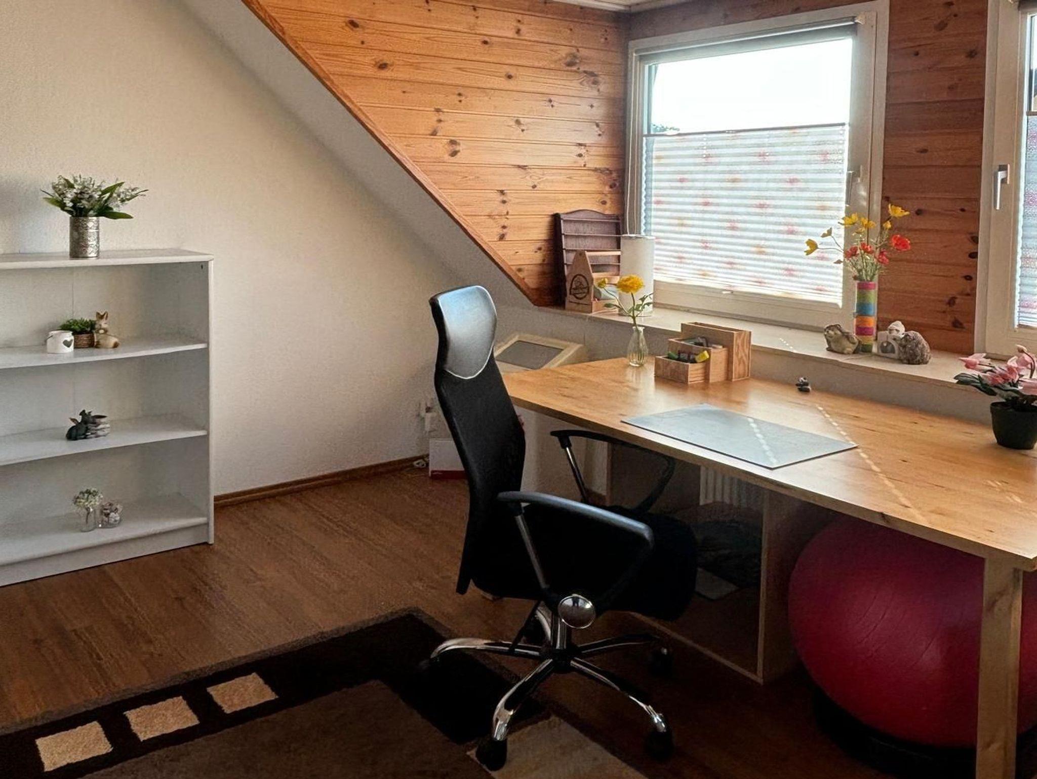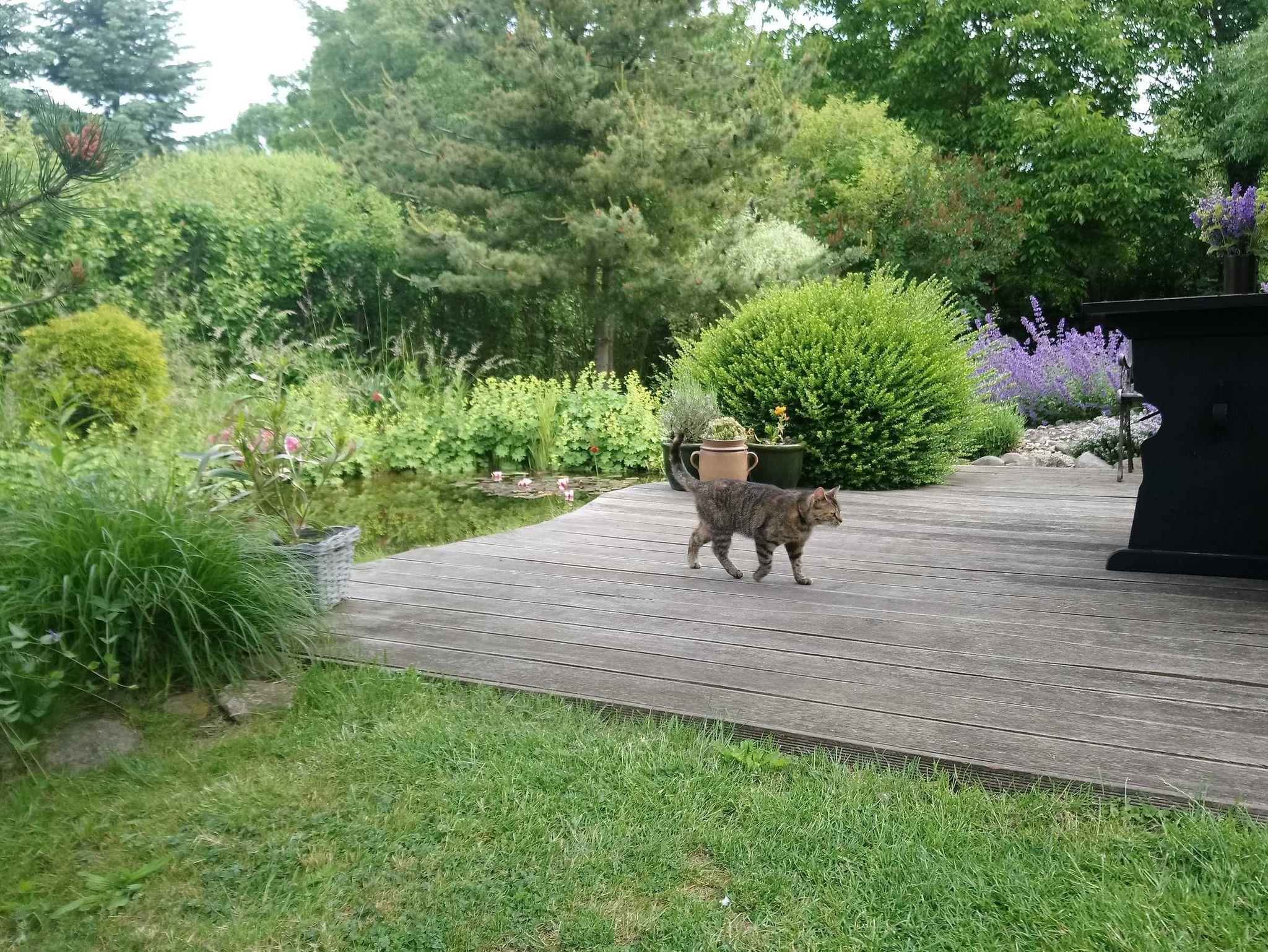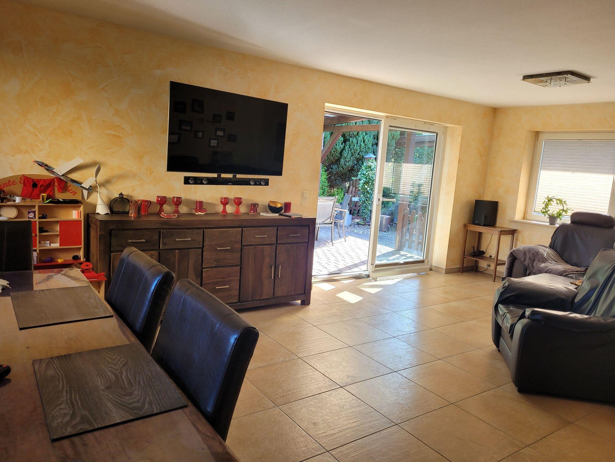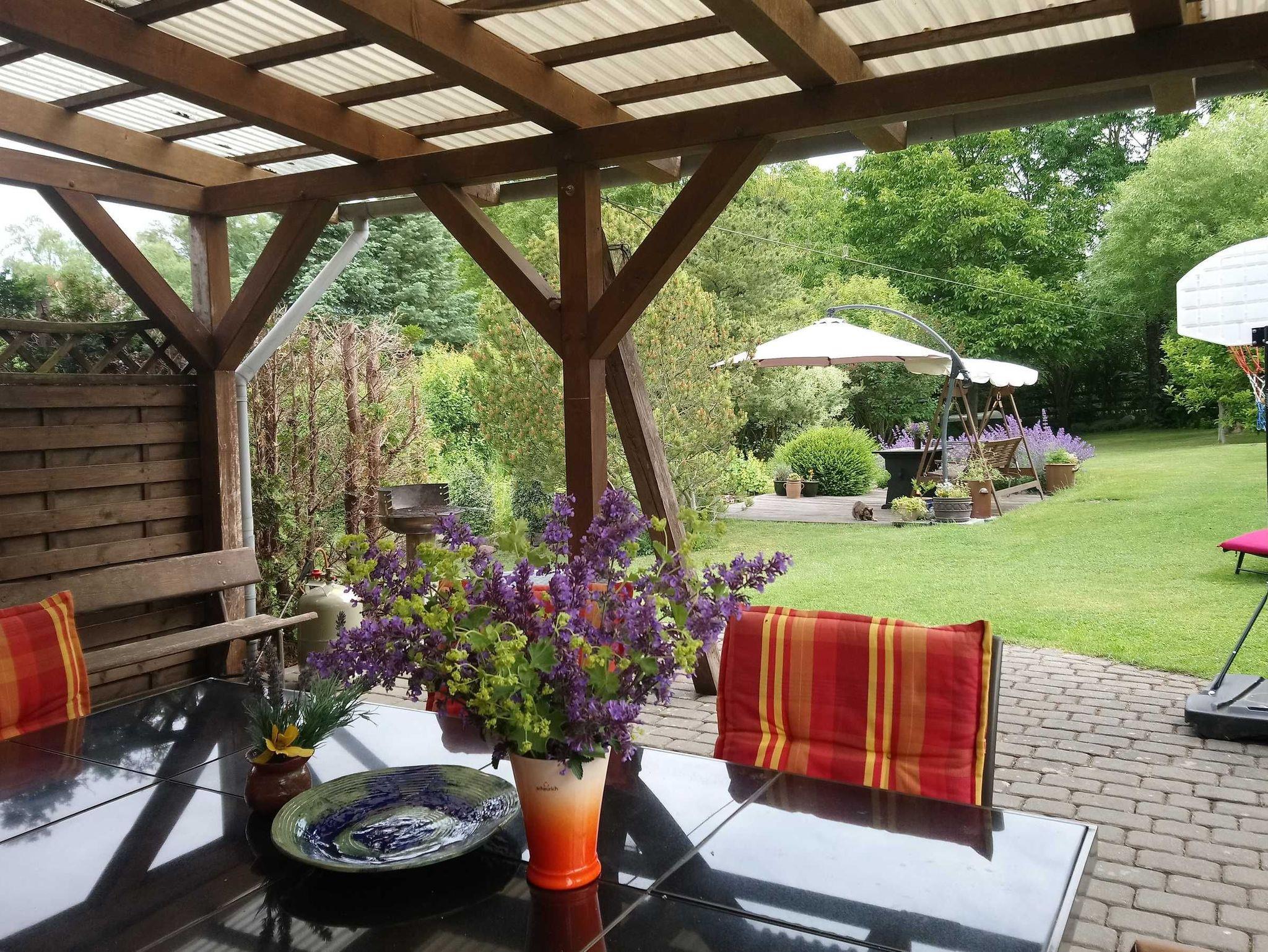 Die Ferienwohnung liegt auf zwei Ebenen im Erd- und Obergeschoss. Durch den Haupteingang gelangen Sie in den Flurbereich von dem das Badezimmer (WC/Dusche), das Gästezimmer mit der Schlafcouch und der offene Wohnbereich mit Küche, Ess- und Wohnzimmer abgehen. Durch das Wohnzimmer erreichen Sie auch die überdachte Terrasse und den liebevoll gestalteten Garten mit Sitzecke, Grillmöglichkeit, großem Spielplatz und Teich (Achtung: 1,40 m tief, nicht abgesperrt!).