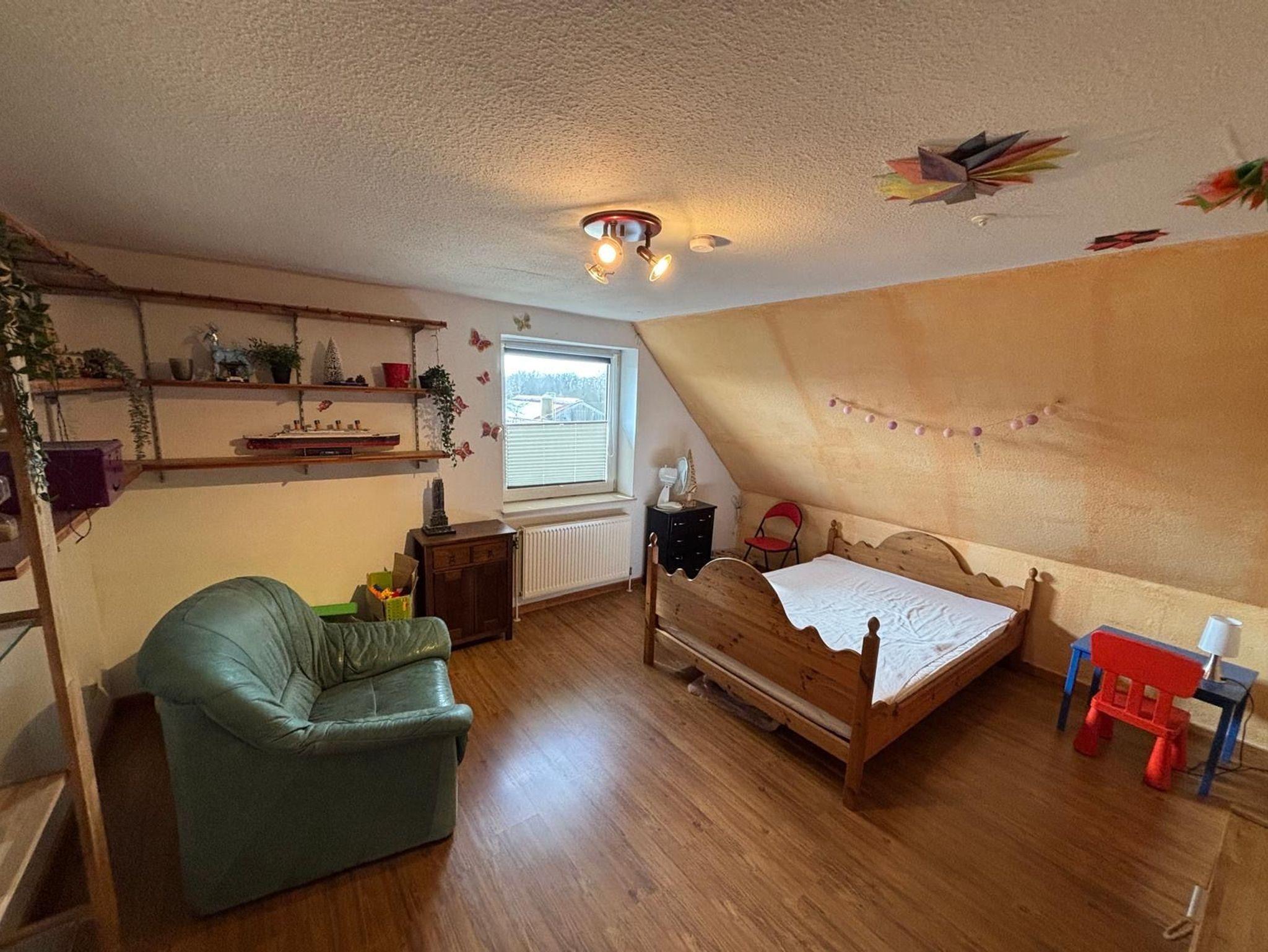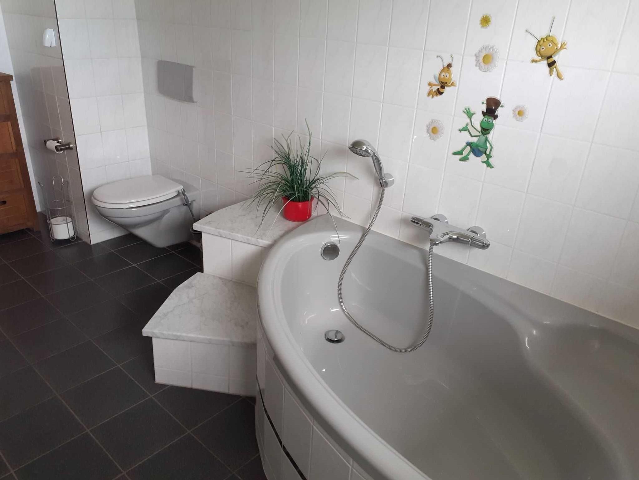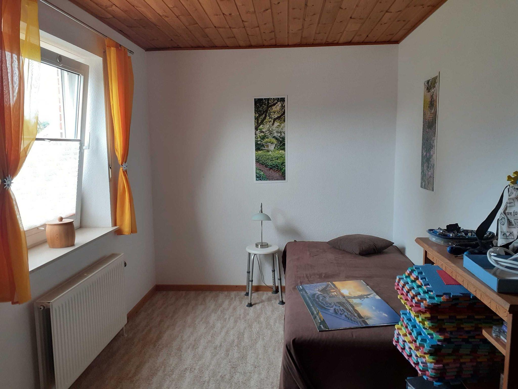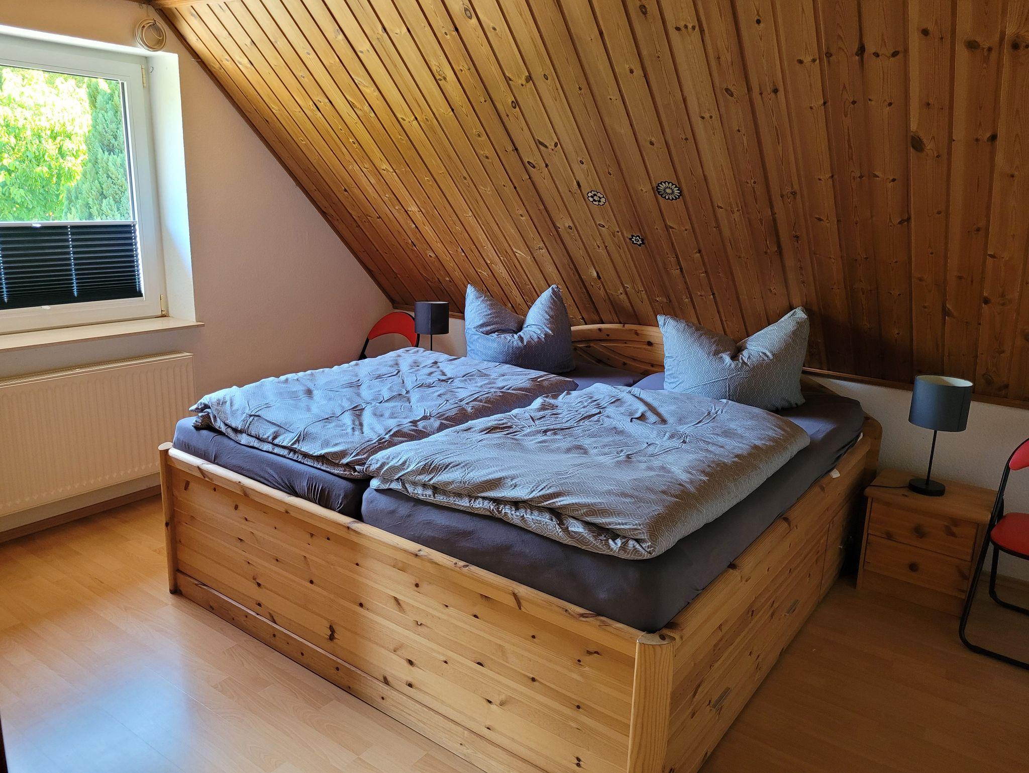 Über eine Treppe, die am oberen Ende mit einem Treppenschutz gesichert ist, erreichen Sie vom Flur aus das 1. Obergeschoss. Von dort aus gehen zwei Kinderzimmer, das Elternschlafzimmer und das obere Badezimmer (WC/Badewanne) ab. In dem einen Kinderzimmer steht ein Einzelbett unter dem sich ein weiteres ausziehbares Bett befindet, sodass in dem Zimmer auch zwei große Kinder schlafen können. In dem zweiten Kinderzimmer gibt es ein weiteres Bett. Ein Kinder-/Reisebett ist ebenfalls vorhanden und kann hinzugebucht werden. In beiden Kinderzimmern gibt es Spielsachen, die gern genutzt werden dürfen. Im Elternschlafzimmer befinden sich ein Doppelbett und ein Kleiderschrank.