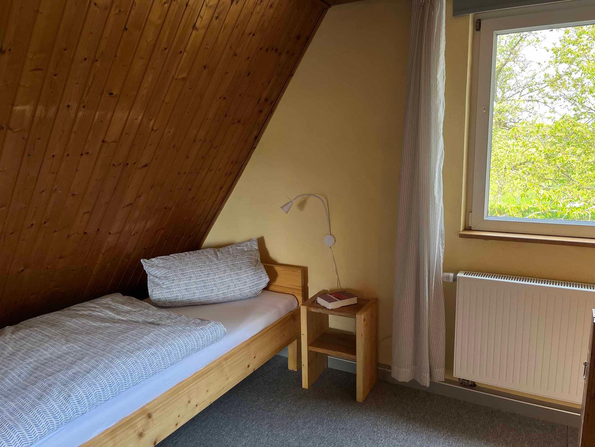 Auf 80qm ist Platz für 4 Personen. Im Obergeschoss befindet sich das Schlafzimmer mit zwei Betten, auf Anfrage kann ein Kinderbett dazu gestellt werden. Im Vorraum sind zwei weitere Schlafplätze. Im Erdgeschoss befindet sich der große, sonnige Wohn- und Essbereich, mit Kaminofen und TV, ein kleines Badezimmer und eine separate Toilette. Die Küche ist gut ausgestattet, eine Spülmaschine ist vorhanden. Von der Küche aus gibt es einen direkten Zugang zum großen Garten. am Haus ist ein überdachter Freisitz, in dem man gemütliche Abende verbringen kann. Ein Grill ist vorhanden.