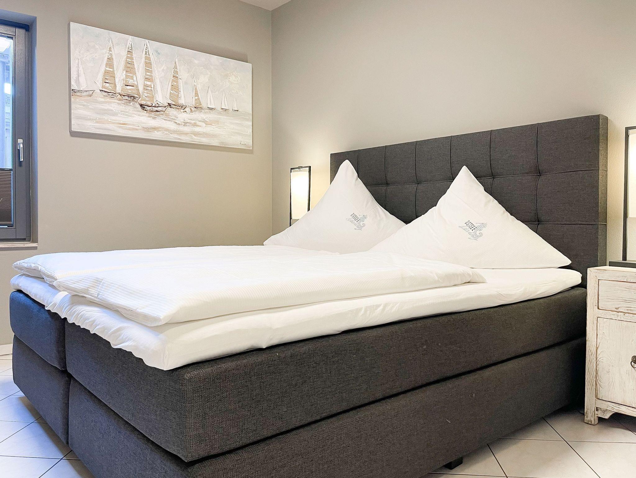 Deck 1 befindet sich im Erdgeschoss eines Ferienhauses mit nur 2 Wohnungen und bietet auf 90 qm Wohnfläche ausreichend Raum für 4 Personen, um einen erholsamen Ostseeurlaub zu verleben. Die hochwertige, äußerst geschmackvolle Einrichtung im Hampton Style schafft ein herrliches Ambiente zum Wohlfühlen, große, bodentiefe Fensterelemente sorgen für lichtdurchflutete Räumlichkeiten. Es stehen zwei separate Schlafzimmer zur Verfügung, die mit Boxspringbetten, Verdunklungsplissees, geräumigen Kleiderschränken und TV ausgestattet sind sowie 2 moderne Bäder mit Walk In Duschen, Waschtisch, WC[nbsp] und Fenster. Mittelpunkt der Wohnung bildet der großzügige Wohnbereich mit gemütlichen Sofas und herrlichem Blick in den wunderschön angelegten Garten. Der anschließende Essbereich ist für 4 Personen eingerichtet und die offene Küche ist selbstverständlich bestens ausgestattet. Der Außenbereich mit der 25 qm großen Terrasse (Südausrichtung), ausgestattet mit[nbsp] 2 Strandkörben und Gartenmöbeln,[nbsp] sowie der liebevoll gestaltete Gartenbereich mit großer Teichanlage, Goldfischen, Gräsern und Bambus stellt ein besonderes Highlight dar und wird garantiert zu jeder Tageszeit zum Lieblingsplatz. So bezaubernd die Teichanlage auch ist, könnte sie insbesondere für kleine Kinder eine Gefahr darstellen. Die Waschmaschine ist in einem separaten Raum innerhalb der Wohnung untergebracht. WLAN steht selbstverständlich zu kostenlosen Nutzung zur Verfügung. Fahrradständer befinden sich vor dem Eingang. Es fester Tiefgaragenstellplatz (Einfahrt 2 m) gehört zur Wohnung.