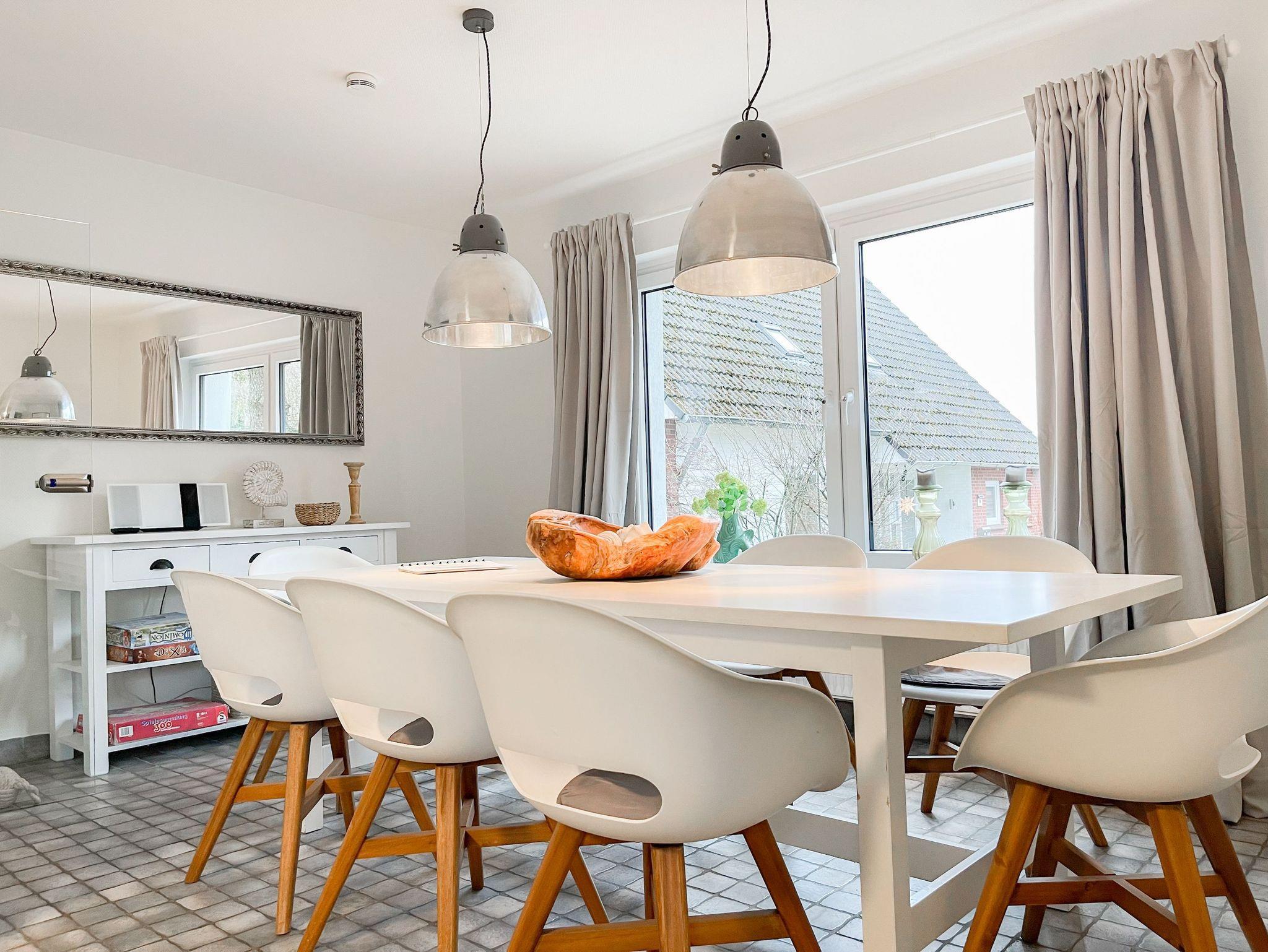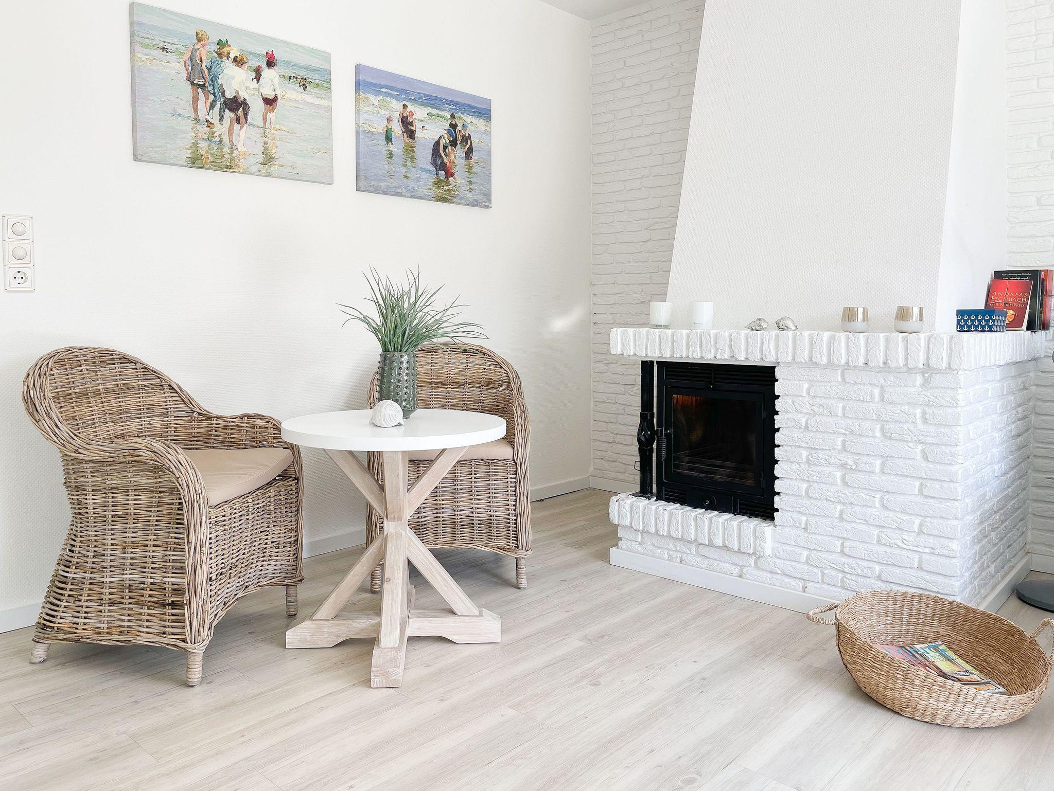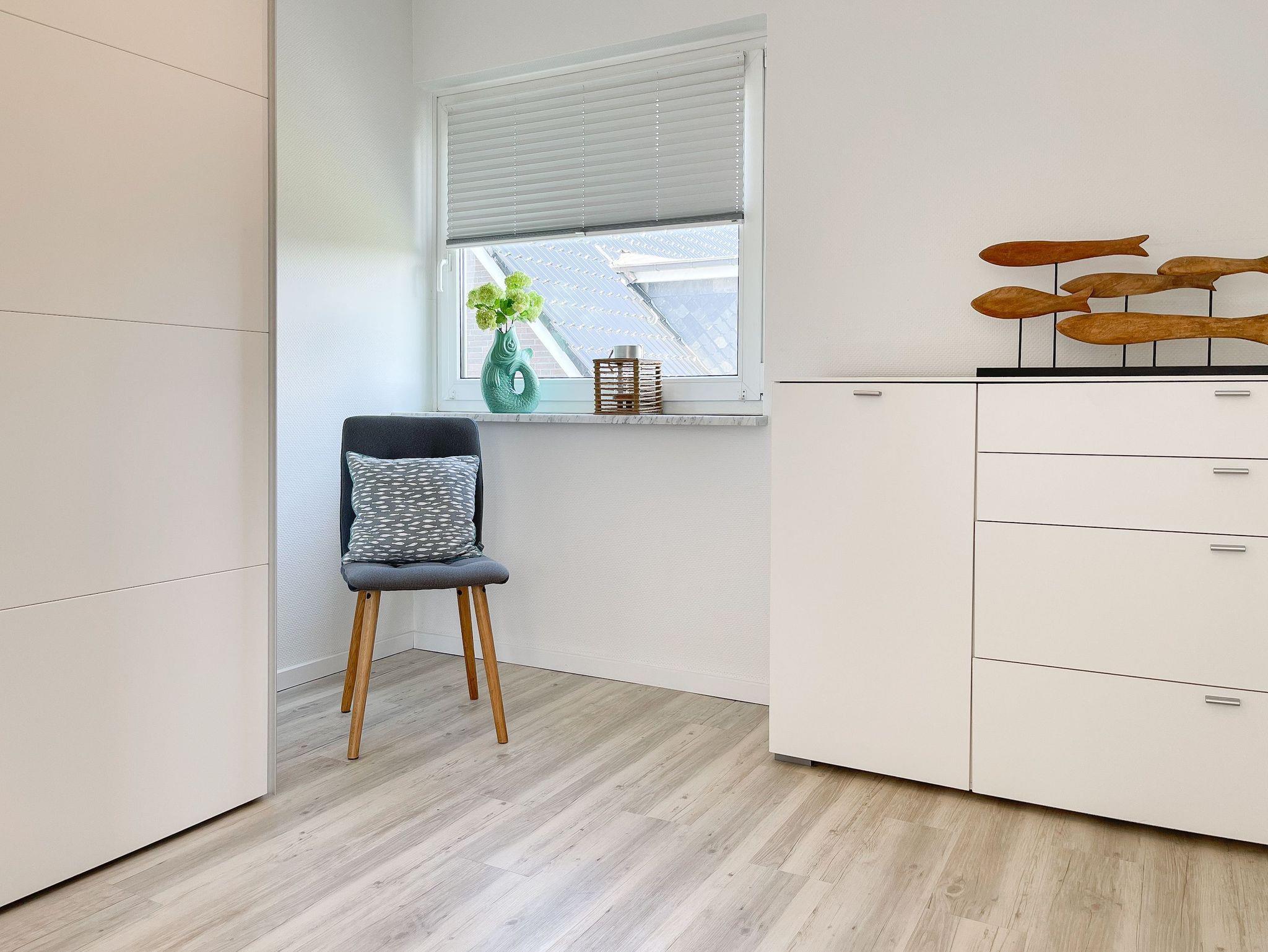 Im Erdgeschoss befindet sich ein heller, freundlicher Wohnraum mit Leseecke, Kamin und vorgelagerter Südwest Terrasse sowie eine vollausgestattete, großzügige Einbauküche mit angrenzendem Essbereich[nbsp] für 8 Personen. Ein Schlafzimmer mit einem Einzelbett, TV und direktem Terrassenzugang, ein Gäste WC und die Garderobe sind ebenfalls auf dieser Ebene untergebracht.