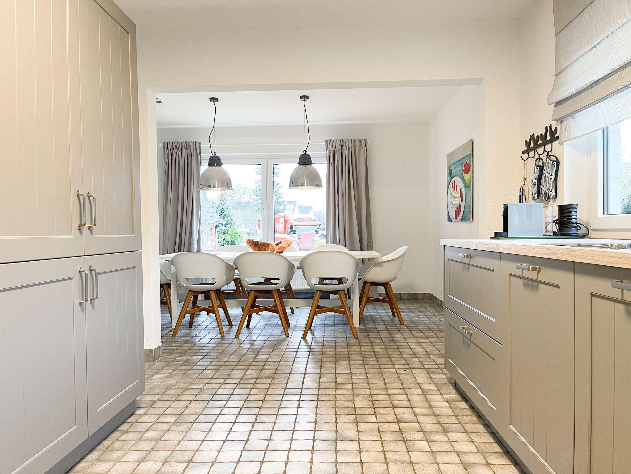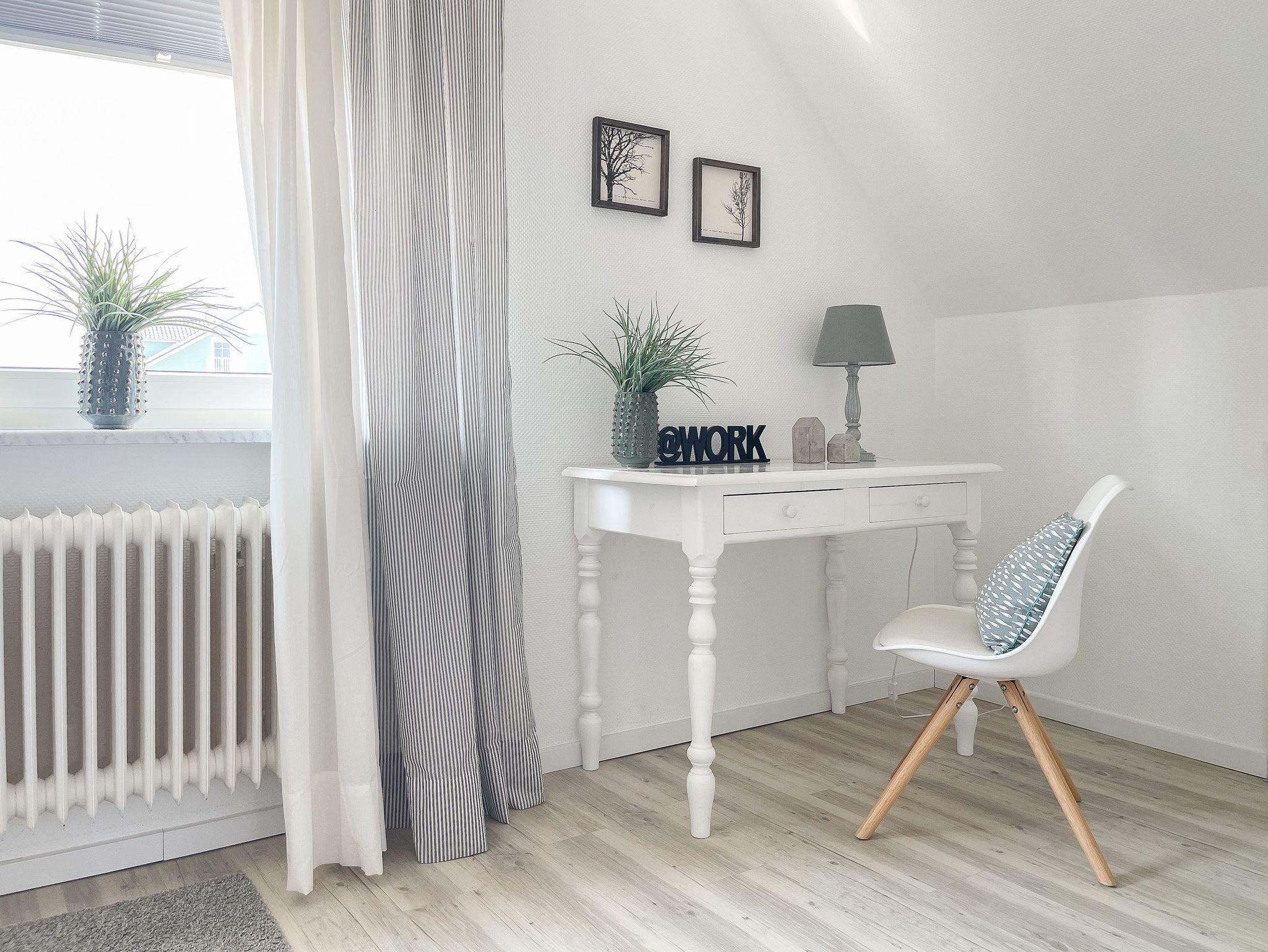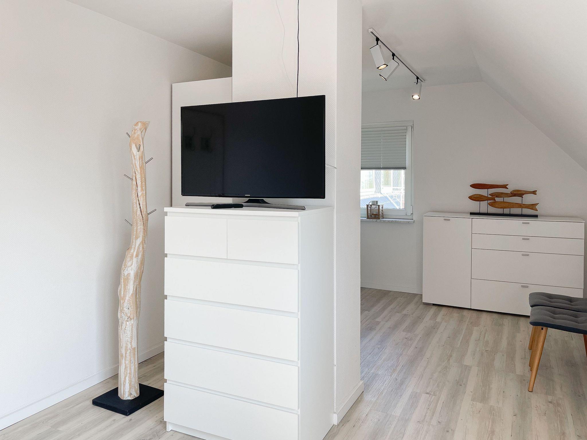 Im Erdgeschoss befindet sich ein heller, freundlicher Wohnraum mit Leseecke, Kamin und vorgelagerter Südwest Terrasse sowie eine vollausgestattete, großzügige Einbauküche mit angrenzendem Essbereich[nbsp] für 8 Personen. Ein Schlafzimmer mit einem Einzelbett, TV und direktem Terrassenzugang, ein Gäste WC und die Garderobe sind ebenfalls auf dieser Ebene untergebracht.