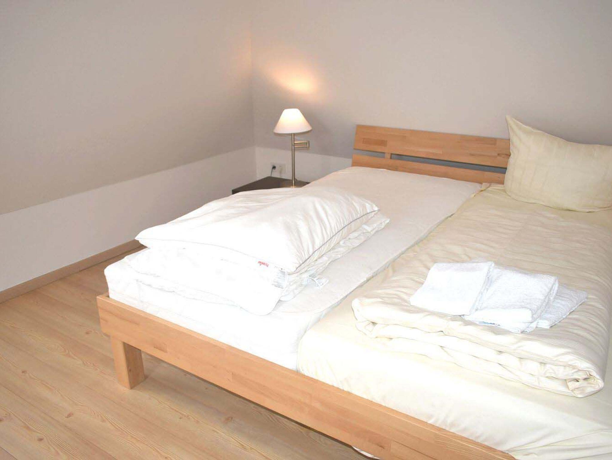 Schlafzimmer 1: 2 Matratzen, 2 Sessel, 3 Nachttische, Doppelbett 2,00 x 1,80 m, Kleiderschrank, Radiowecker, Spiegel, Verdunklungsstores