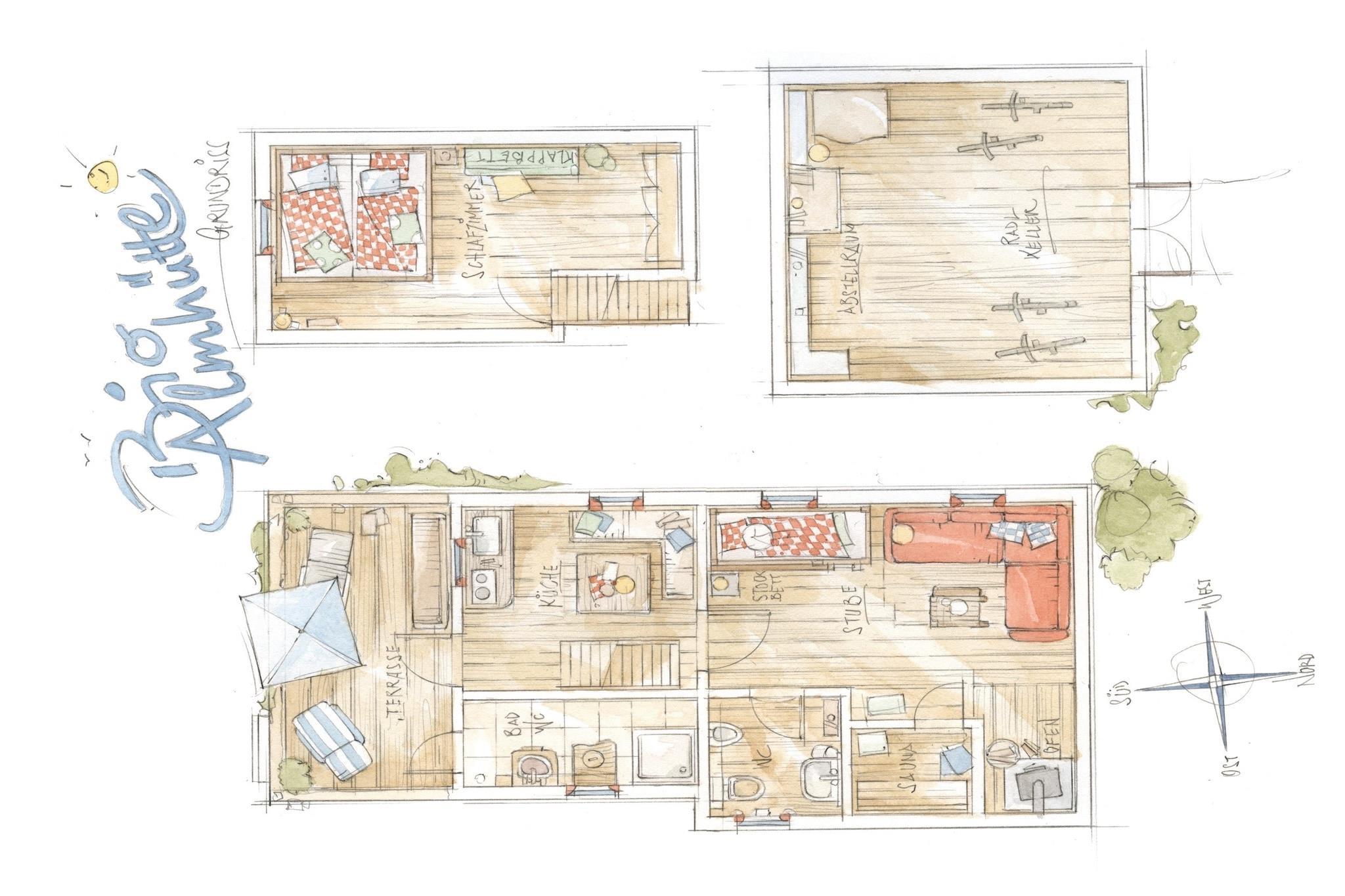 Parterre: (Wohnküche(Radio, Kochherd, Backofen), Wohn-/Schlafzimmer(Doppelschlafcouch, Etagenbett, Herd(Holz), Sauna), Badezimmer(von außen erreichbar)(Dusche, Waschbecken, Toilette), Toilette(Waschbecken, Toilette, Urinal)) In der 1. Etage: (Schlafzimmer(Einzelbett, Doppelbett, TV(Satellit))) Heizung(Zentral, Holz), Terrasse(überdacht), Garten(alleinige Nutzung), Gartenmöbel, Parkplatz, Spielgeräte, Fahrräder verfügbar(elektrisch)