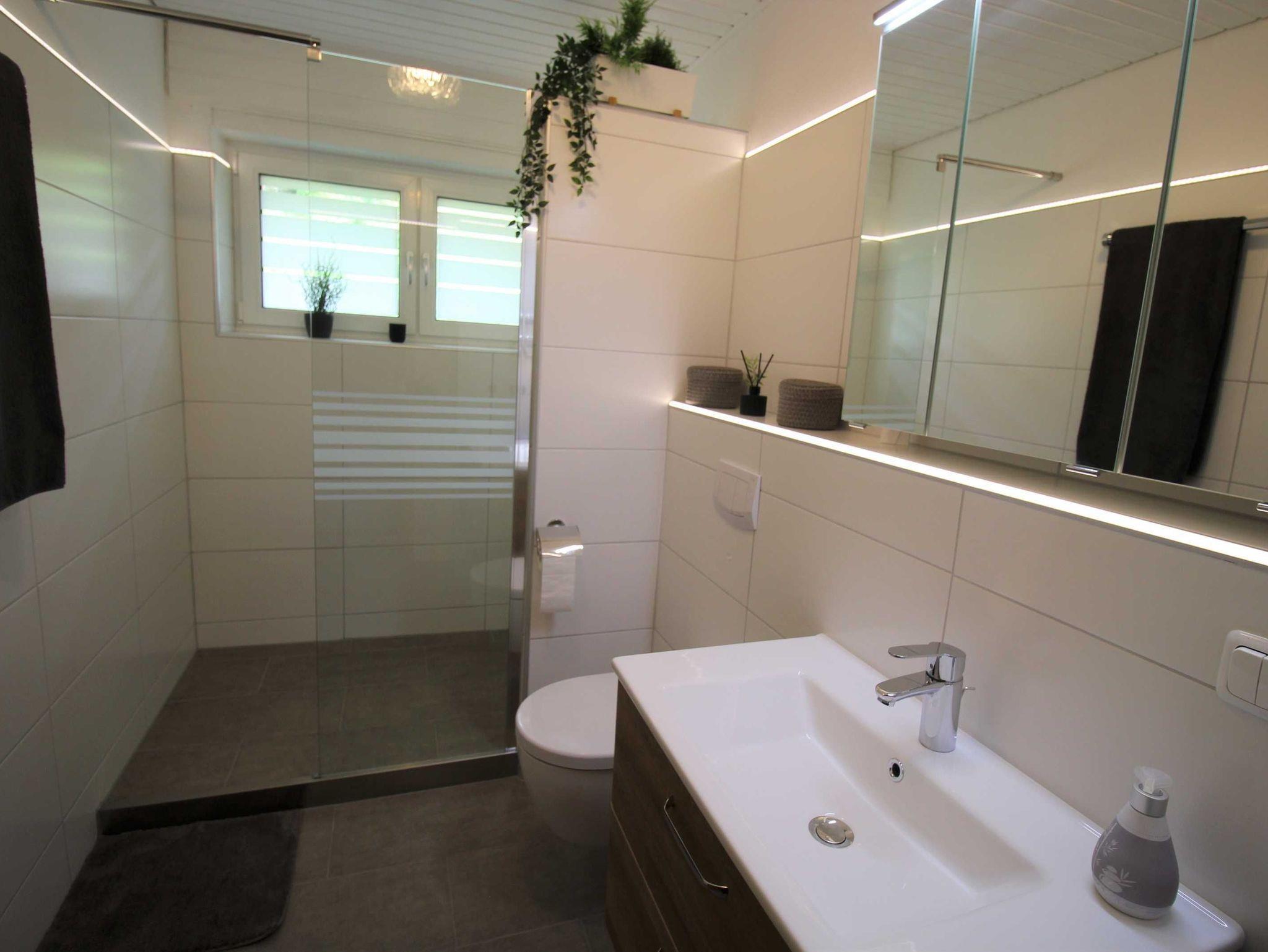 Das helle, neu renovierte Badezimmer macht mit seiner breiten, begehbare Dusche, dem WC und dem dreiteiligen Kosmetikspiegelschrank mit Waschtisch inkl. Föhn sehr angenehm und komfortabel.
