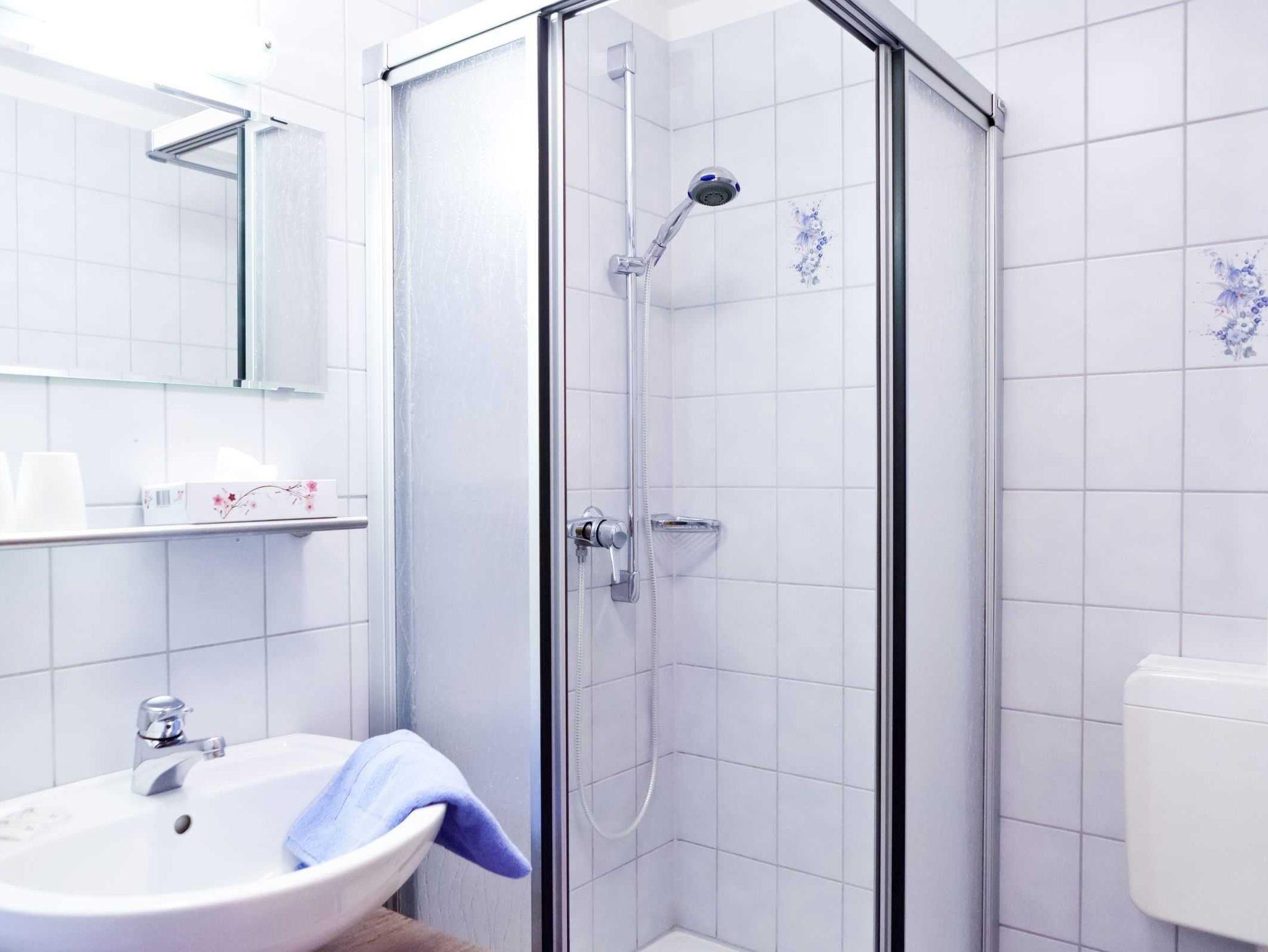 • Dusche, Toilette, Waschbecken mit Spiegel und Ablage, Handtuchhalter und Föhn
