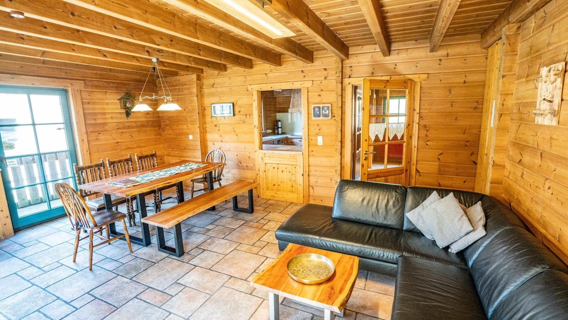 - Wohnraum mit Essplatz für 8 Personen, Ledersofa, Flachbild Sat-TV, Plattenspieler und Holzpellettsofen