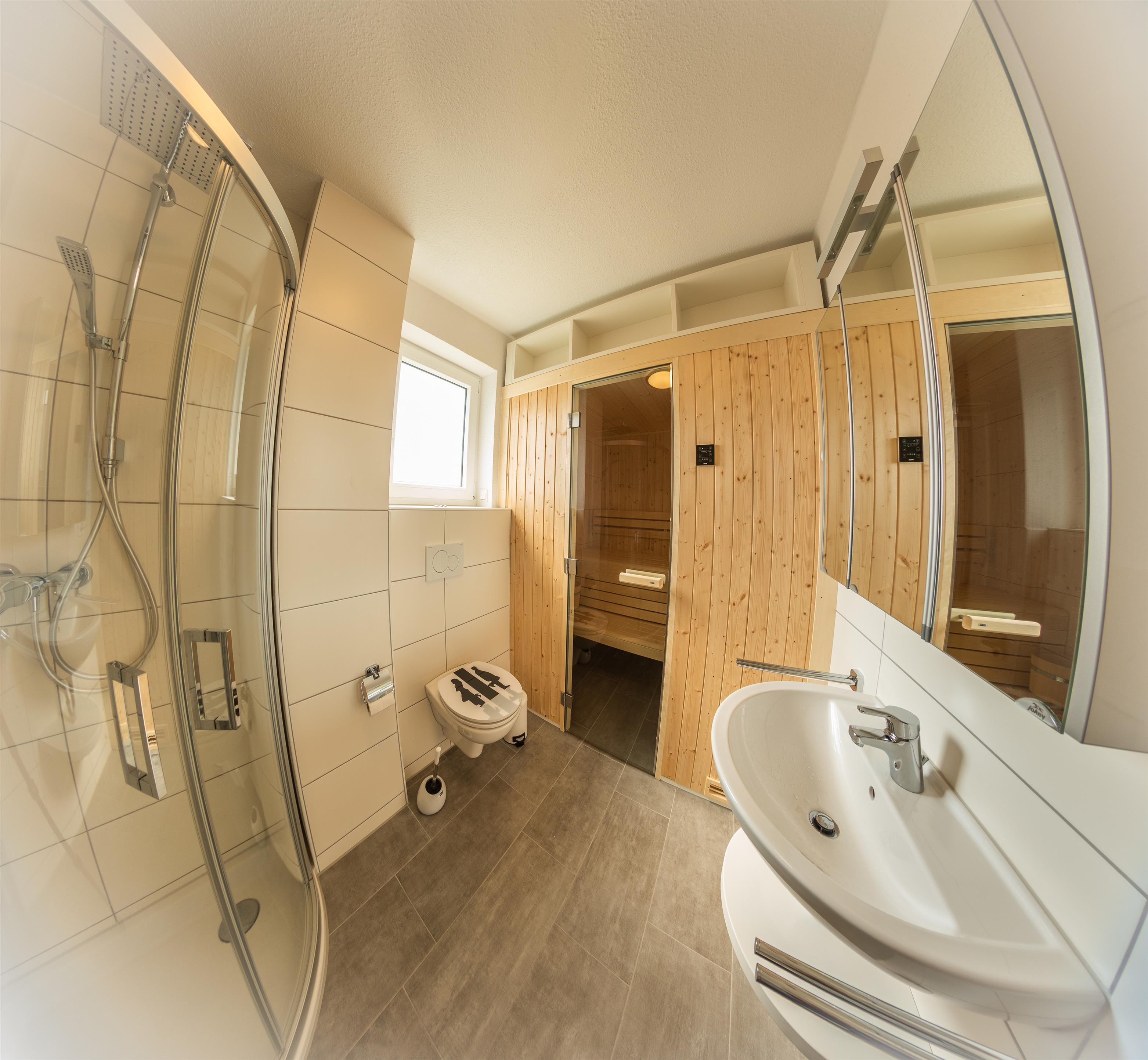 Dieses gemütlich eingerichtete Ferienhaus hat im Erdgeschoß ein offenes Wohnzimmer mit Küche und Essecke. Ein kleines Bad mit WC und Waschbecken ist vom Flur aus erreichbar, dort ist auch eine Waschmaschine fest installiert. Im offenen Wohnzimmer können Sie an schönen Abendstunden vom Sofa aus dem Anblick des Kamins genießen. An der Wand befindet sich ein großer Flachbildfernseher. Die offene Küche mit Essecke ist sehr gut ausgestattet. Mit z.B. Geschirrspüler, Kühlschrank, Backofen, Mikrowelle, Kaffeemaschine und Wasserkocher und auch sehr geschmackvoll eingerichtet. Vor der großen Fensterfront zum Deich befindet sich eine Terrasse für Sie allein mit Gartenmöbeln. Im oberen Stockwerk befinden sich die Schlafräume, das große Bad mit Dusche / WC und einer sehr schönen Sauna. Im großen Schlafzimmer befindet sich ein Doppelbett, sowie ein Flachbildfernseher.