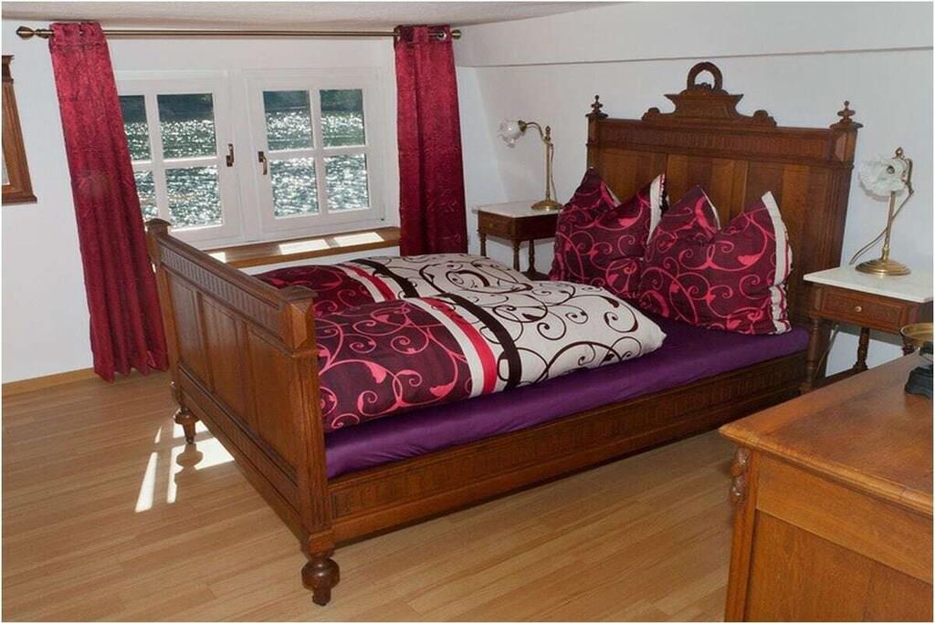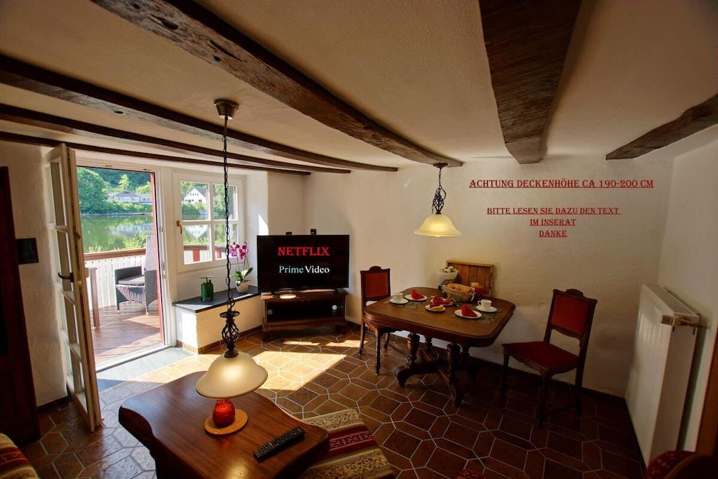Die Einrichtung teils antik, trotzdem topmodern. Massive Schiefer/Eichenholz Küche mit Induktionsherd, Spülmaschine und Kaffeevollautomat. eigener Schwimm / Kanusteg vor der Terrasse mit kostenlosen Kanus und Ausrüstung Interesse an einem Urlaub im antiken Fährhaus geweckt ? :-) Aber bitte Achtung !!! Die Deckenhöhe im Erdgeschiss liegt zwischen 190 und 205cm . Im Obergeschoss zwischen 190 und 200cm und im Schlafzimmer zwischen 180 und 190 cm . Die Durchgangshöhe der Zimmertüren im Schnitt 180-185cm . wie gesagt , Erbaut im Jahre 1633 , damals waren die Leute halt doch deutlich kleiner . Meines Erachtens ist eine Körpergrösse bis 188 cm (Mein Sohn hat 188 cm) relativ unproblematisch. ab 2021 Neues Jugendstilbett mit 160cm Federkern Matratze