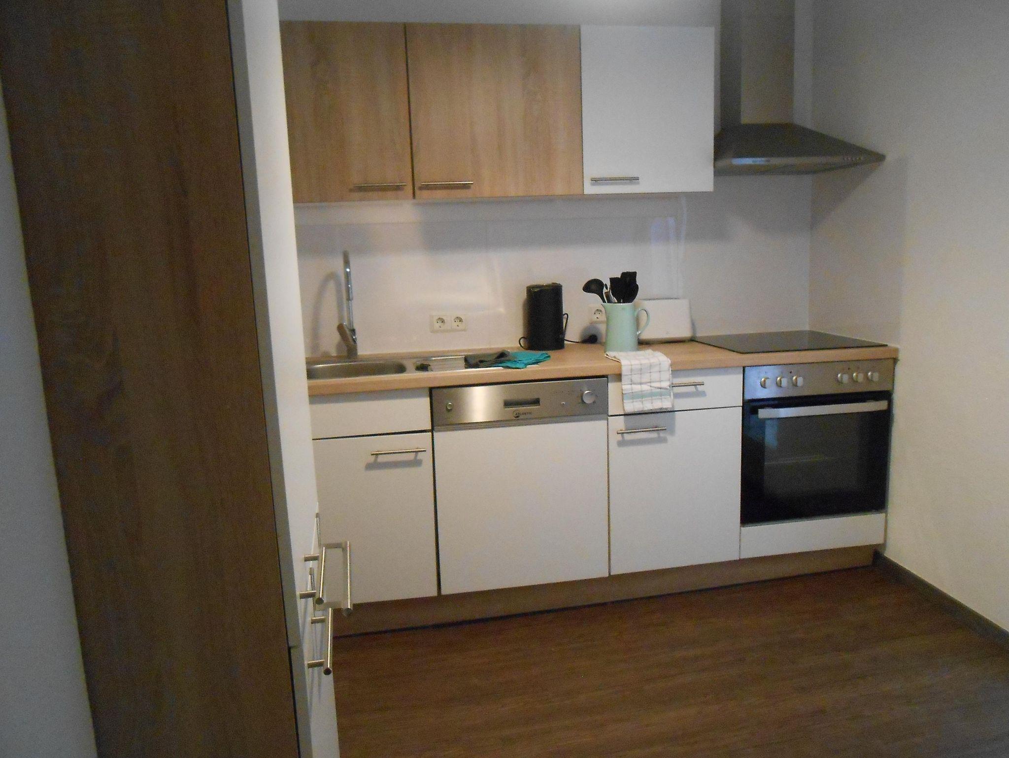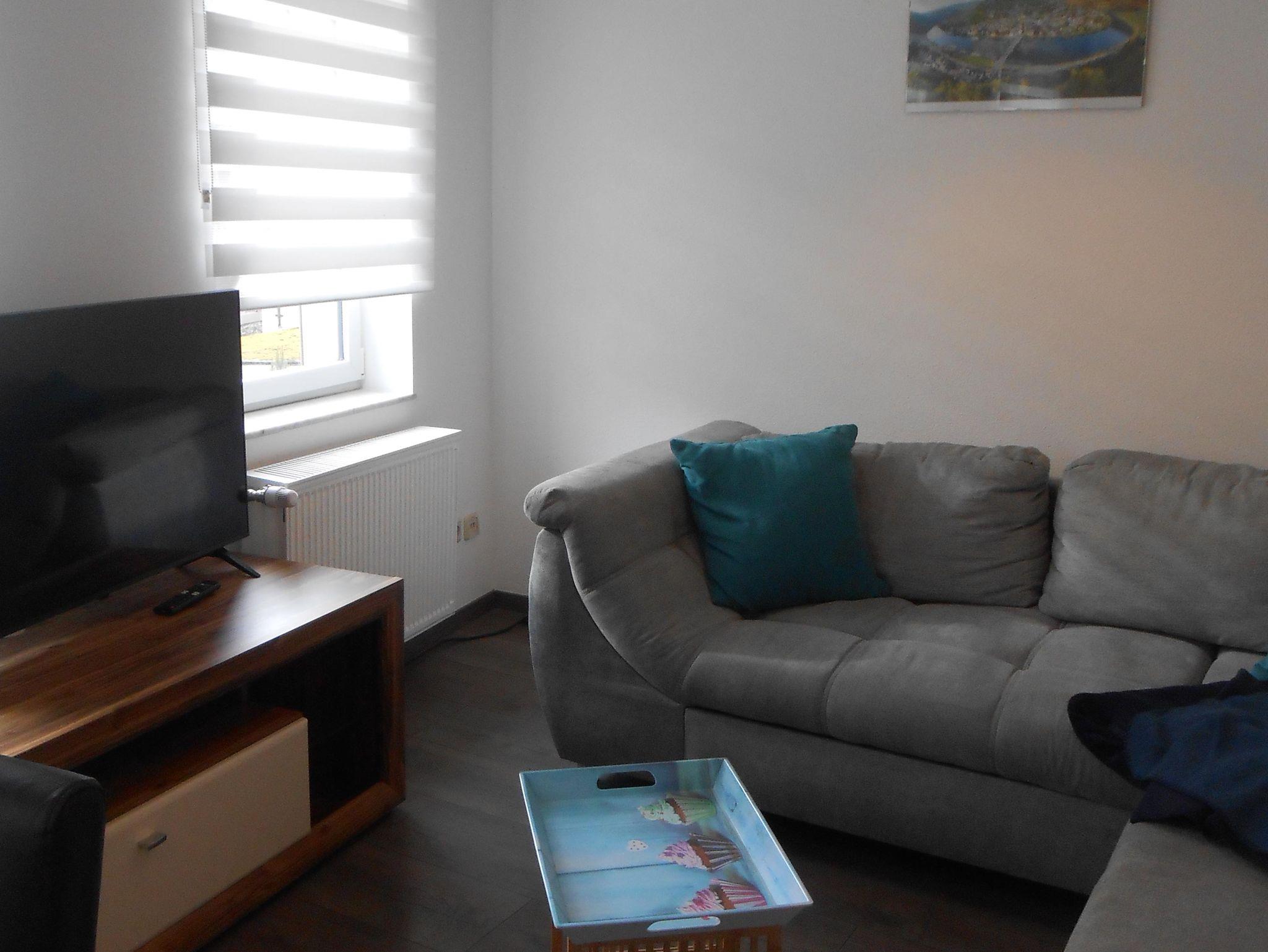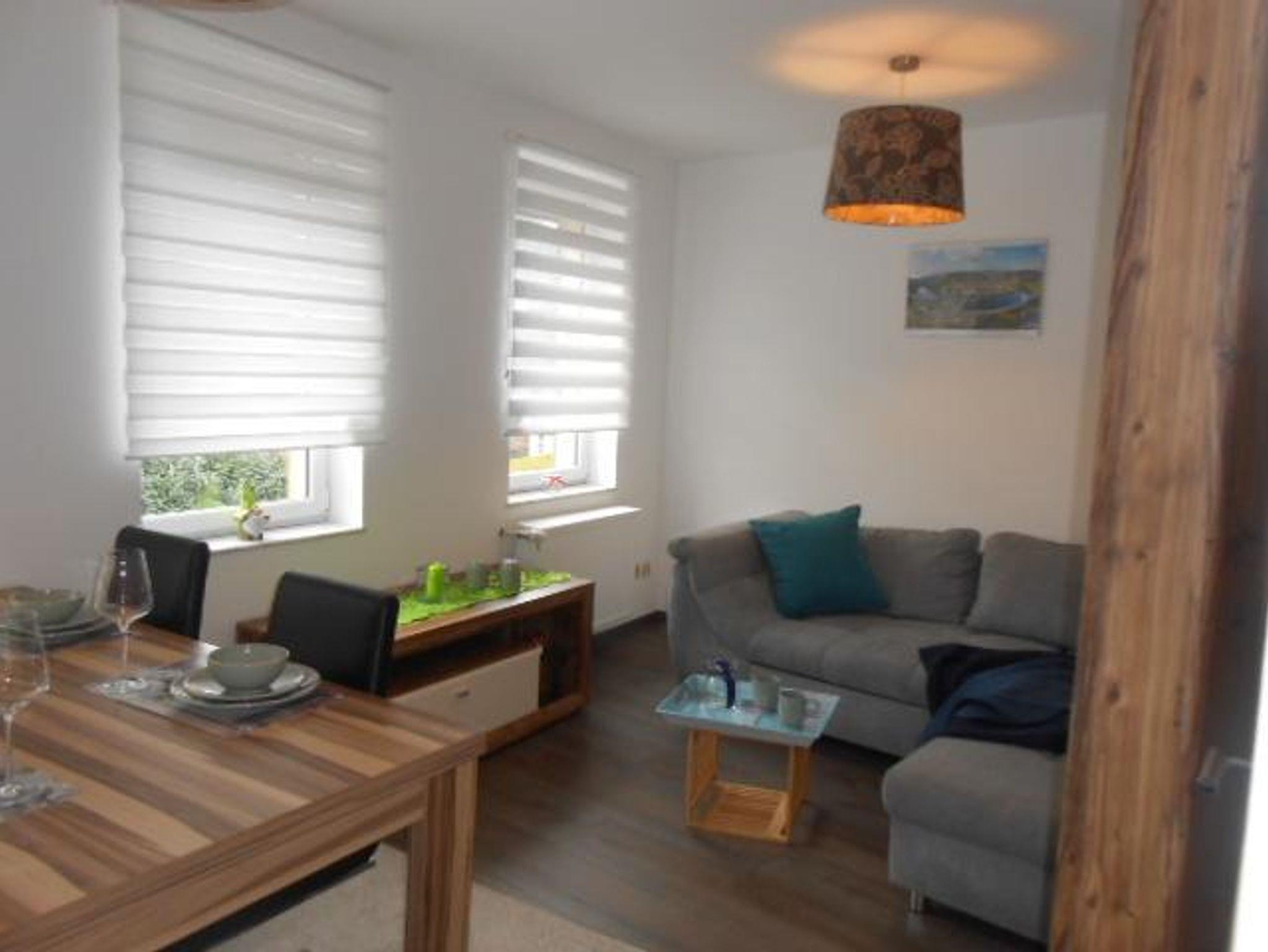 Das Ferienhaus hat im ersten Stock einen Wohnraum mit einer gemütlichen (Schlaf-) Couch und einem Flachbildfernseher. Dort lädt ein Essbereich, mit Tisch und Stühlen, zum gemeinsamen Genießen ein. Auf diesem Stockwerk befindet sich auch die voll ausgestattete Küche. Diese verfügt über eine moderne Kochzeile mit Elektroherd, Backofen, Geschirrspüler, Kühlschrank, Kaffeemaschine, Wasserkocher, Toaster sowie Geschirr und Besteck. Auf dieser Etage kann sich ihr gesamter Tagesablauf abspielen. An die Küche angeschlossen ist die Gästetoilette zu finden. Ebenso kann von der Küche aus, die Terrasse am Weinbergfels betreten werden. Diese lädt mit einer bequemen Sitz- und Essgelegenheit zur gemeinsamen Entspannung ein.