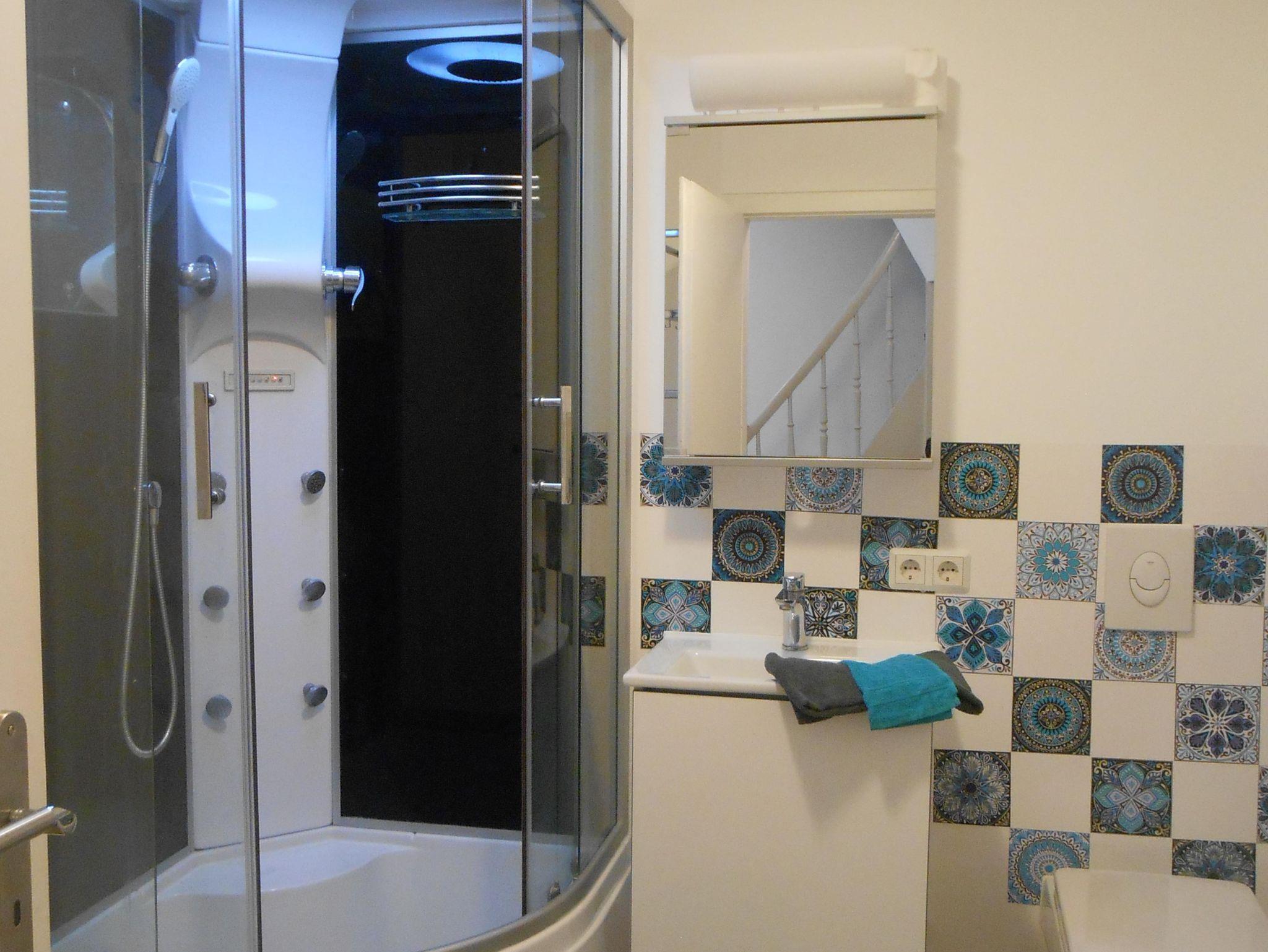 Das Badezimmer befindet sich im Erdgeschoss. Es ist mit Dusche, WC, Waschbecken, Spiegel, sowie Handtüchern ausgestattet.