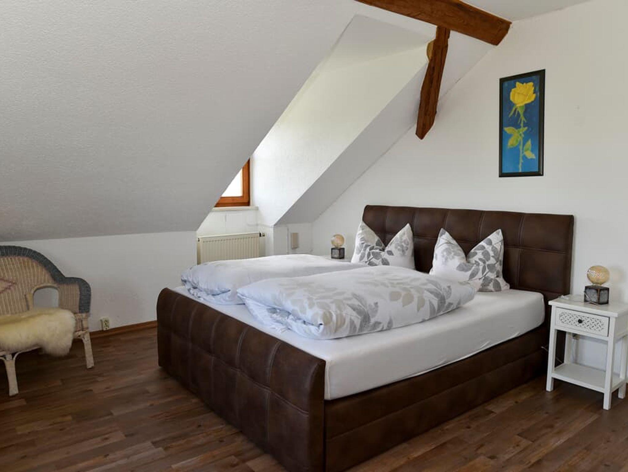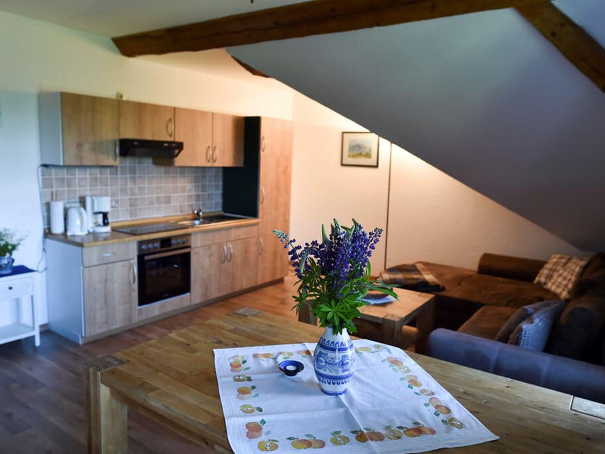 Helle, renovierte, freundliche Ferienwohnung (50qm, Obergeschoss) mit schöner Aussicht. Die Wohnung ist ideal für zwei Erwachsene evtl. mit einem Kind. Im großem Schlafzimmer befindet sich ein Boxspringdoppelbett mit offenem Fußteil das bei Ihrer Anreise bezogen ist, sowie Platz für ein Zustellbett. Im Bad befindet sich eine Badewanne/Dusche inklusiv und WC, es liegen Bad-und Handtücher und ein Fön für Sie bereit. Im gemütlichen Wohn-/Essbereich befindet sich eine große Eckcouch die mit TV und Musikanlage zum entspannen einlädt. Die Küchenzeile ist mit Cerankochfeld und Backofen, einem Kühlschrank mit Gefrierfach und Kaffeemaschine/Wasserkocher/Toaster praktisch ausgestattet. Für Sie vorbereitet sind Spül- und Geschirrtücher. In der großen Scheune findet sich genug Platz für die kostenlose Unterstellung Ihre Fahrräder oder Motorräder.