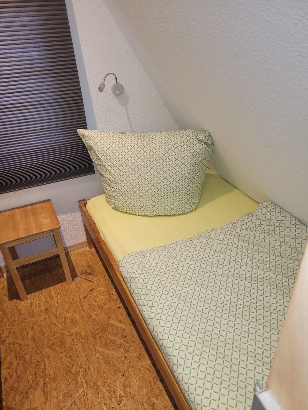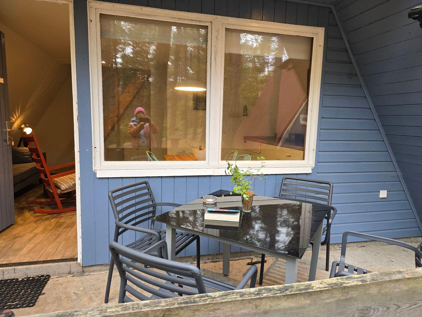 Drinnen warten ca. 30 m², die mehr können, als man denkt. Im Wohnzimmer treffen Sofa, Tisch und Stühle auf eine große Terrassentür, die den Wald direkt ins Haus holt. Die Schlafgalerie unterm Dach ist kuschelig und luftig zugleich – vier Betten für Erwachsene oder Kinder. IAlles schlicht, praktisch, ein bisschen skandinavisch – und mit Heizung für kühle Abende.
