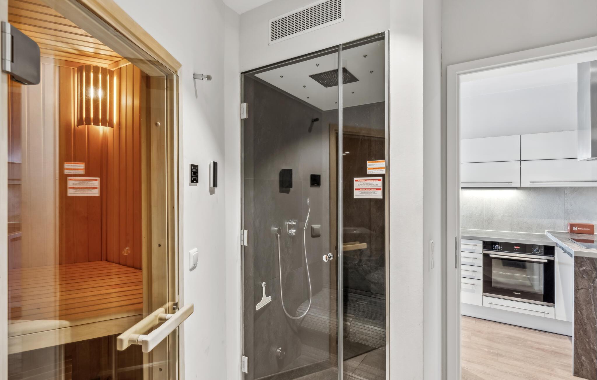 Die Wohnung ist stilvoll, hochwertig und modern eingerichtet. Ein besonderes Highlight ist das Bad, Ihr persönlicher kleiner Wellnessbereich mit Sauna und Dampfbad mit integrierter Regendusche. Das Wohlfühlprogramm setzt sich im Wohnbereich fort, denn die flackernden Flammen des Bioethanolkamins tauchen den Raum in ein besonders gemütliches Licht. Das Sofa lässt sich mit wenigen Handgriffen in zwei bequeme Schlafmöglichkeiten umwandeln.