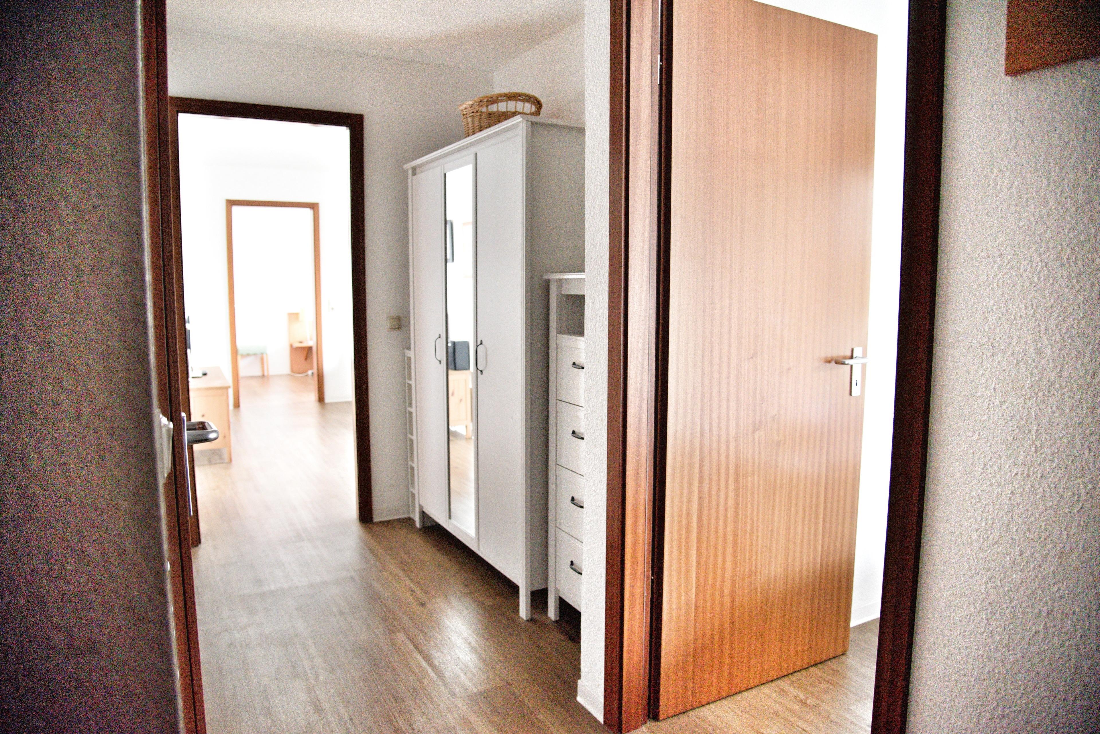 Ihre Einbauküche ist für Sie voll ausgestattet. Bestandteile sind unter anderem Elektrokochfeld, Backofen, Kaffeemaschine, Mikrowelle, viel Geschirr, ein Kühlschrank mit kleinem Gefrierfach und vieles mehr. Ihr Badezimmer hält eine Duschkabine, Ablageflächen und einen Fön für Sie bereit. Ihre mitgebrachten Utensilien können Sie hier gut verstauen. Im Flur finden Sie eine Garderobe, einen großen Spiegel und Reinigungsgeräte vor.